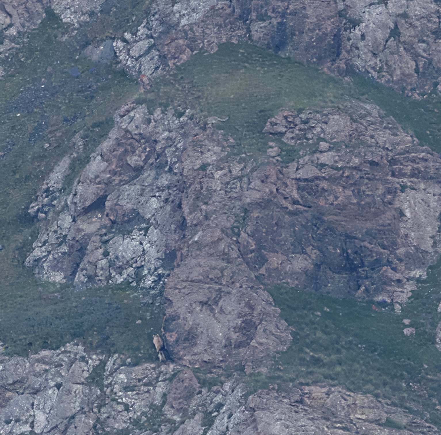 En août les observations ont été spectaculaires également : une ourse et ses 2 jeunes jouant au milieu des mouflons face à Bordou, une meute de 9 loup avec des louveteaux a été observée pendant le petit déjeuner à Bordou. Deux loups « rouges » ont également été observés à Eshegart dont un loup faisant plusieurs tentatives échouées de chasse sur les marmottes du fond de vallée.