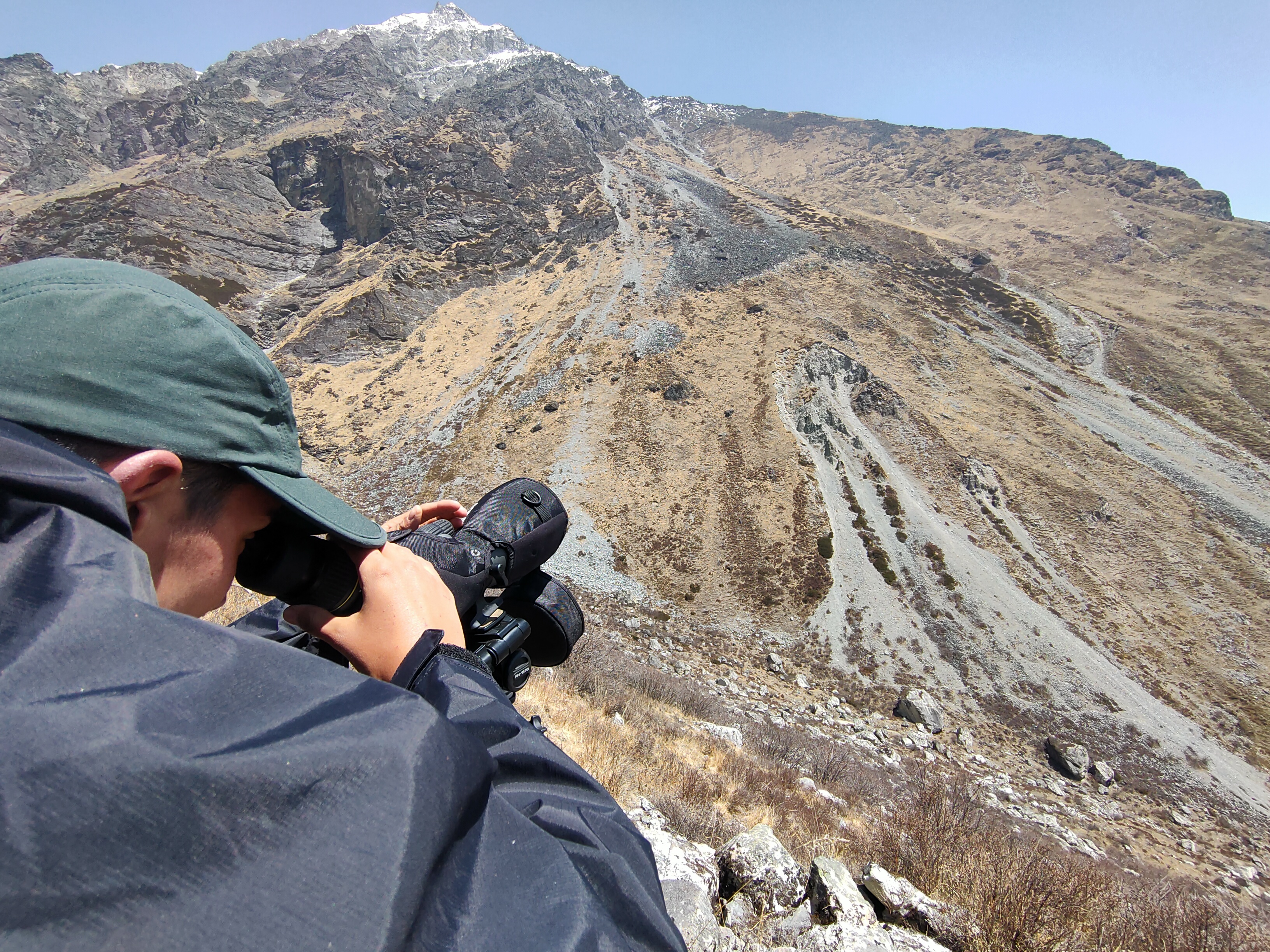 L’équipe part réalisé un transect au pied des barre rocheuses avec une belle observation de l’emblème du Népal le Lophophore resplendissant (Lophophorus impejanus), un faisan majestueux de couleurs (voire photo du 12 avril en couverture du guide ornitho). Malgré la neige qui nous tombe maintenant sur la tête, nous observons 2 mâles et 5 femelles et entendons les cris si particuliers de ces animaux.