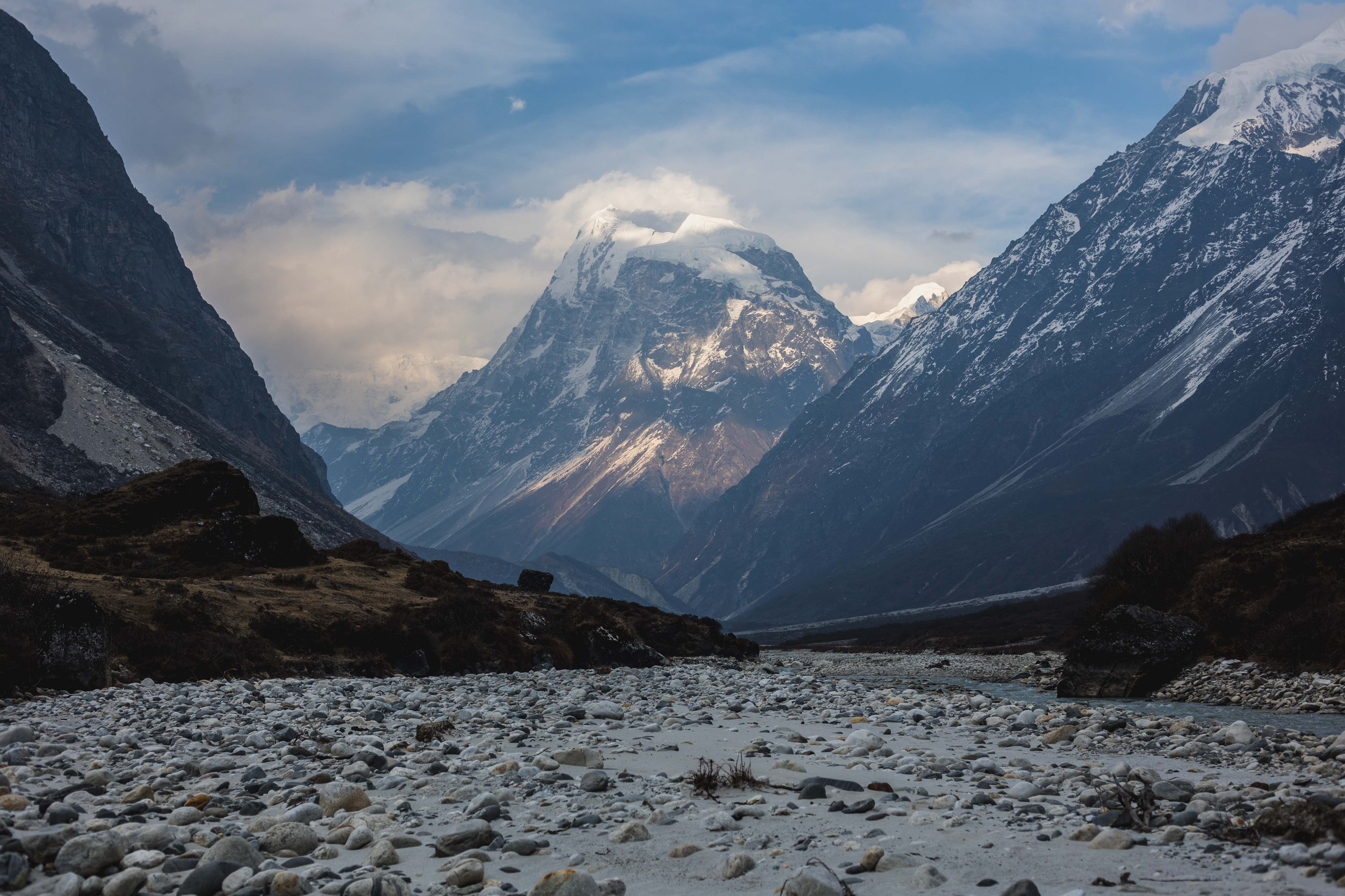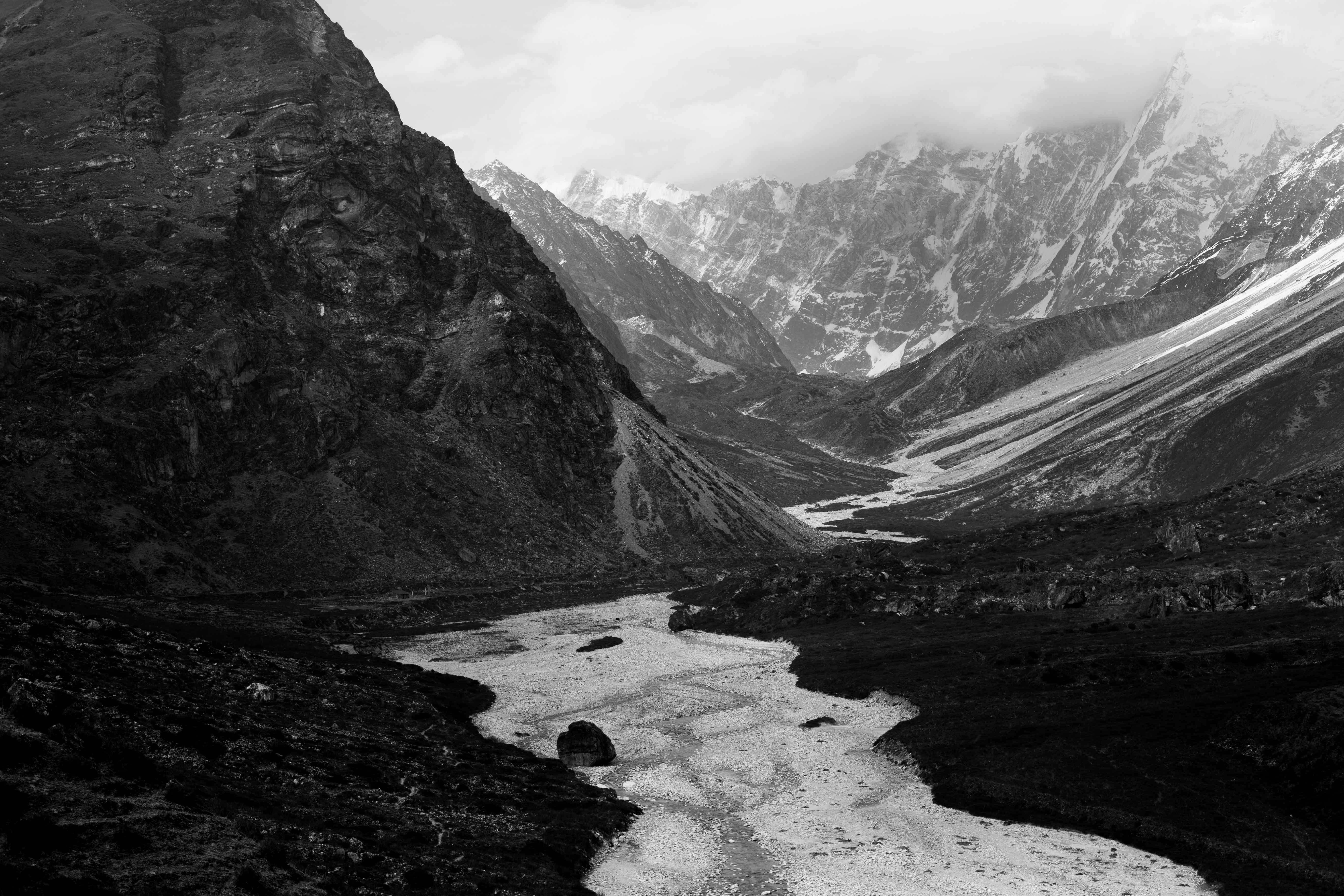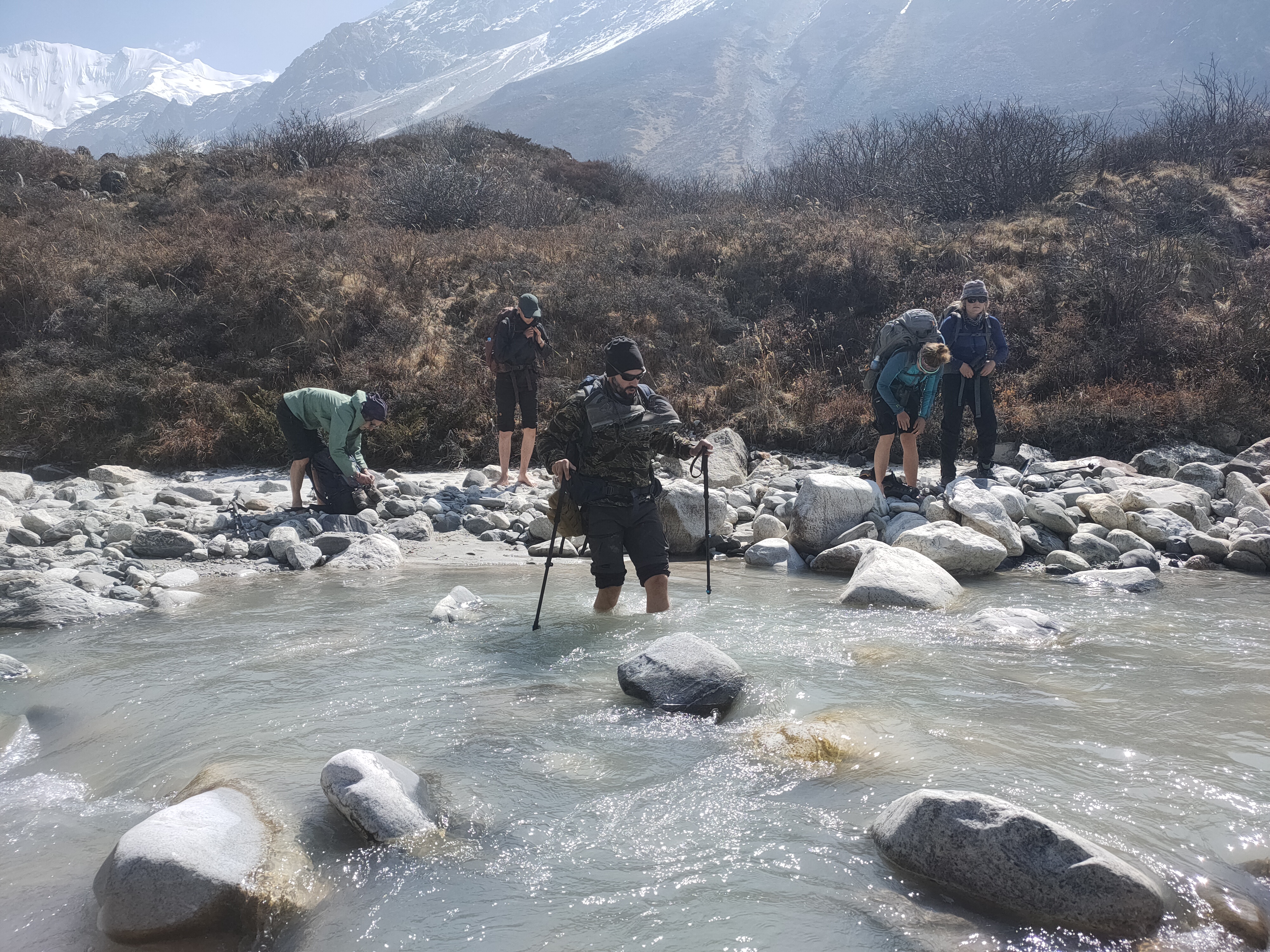 L’équipe doit suivre la rivière de la Langtang Khola qui coule dans le fonde la vallée durant une longue journée dans une vallée très ouverte entre 3800 et 4200m d’altitude.