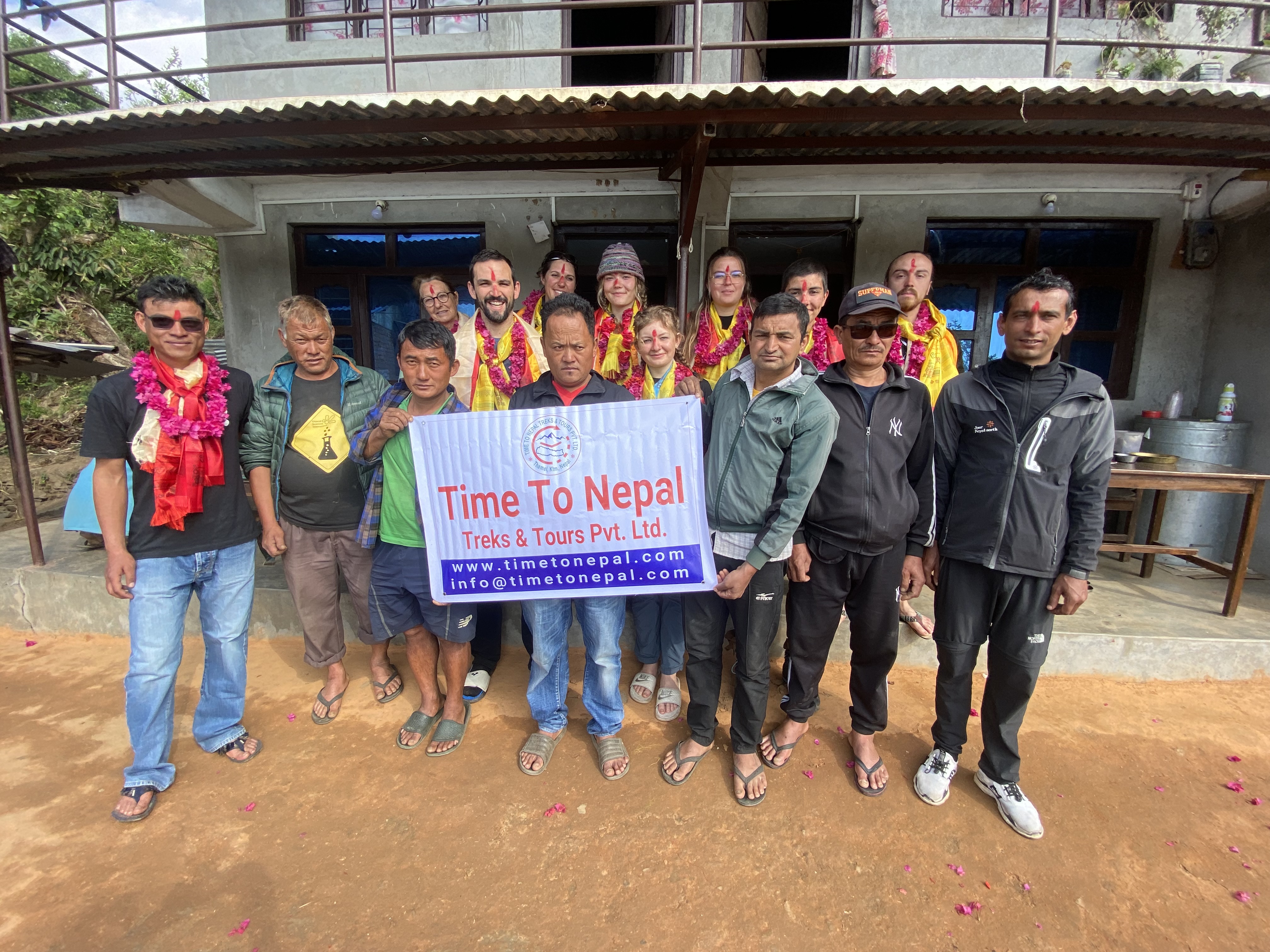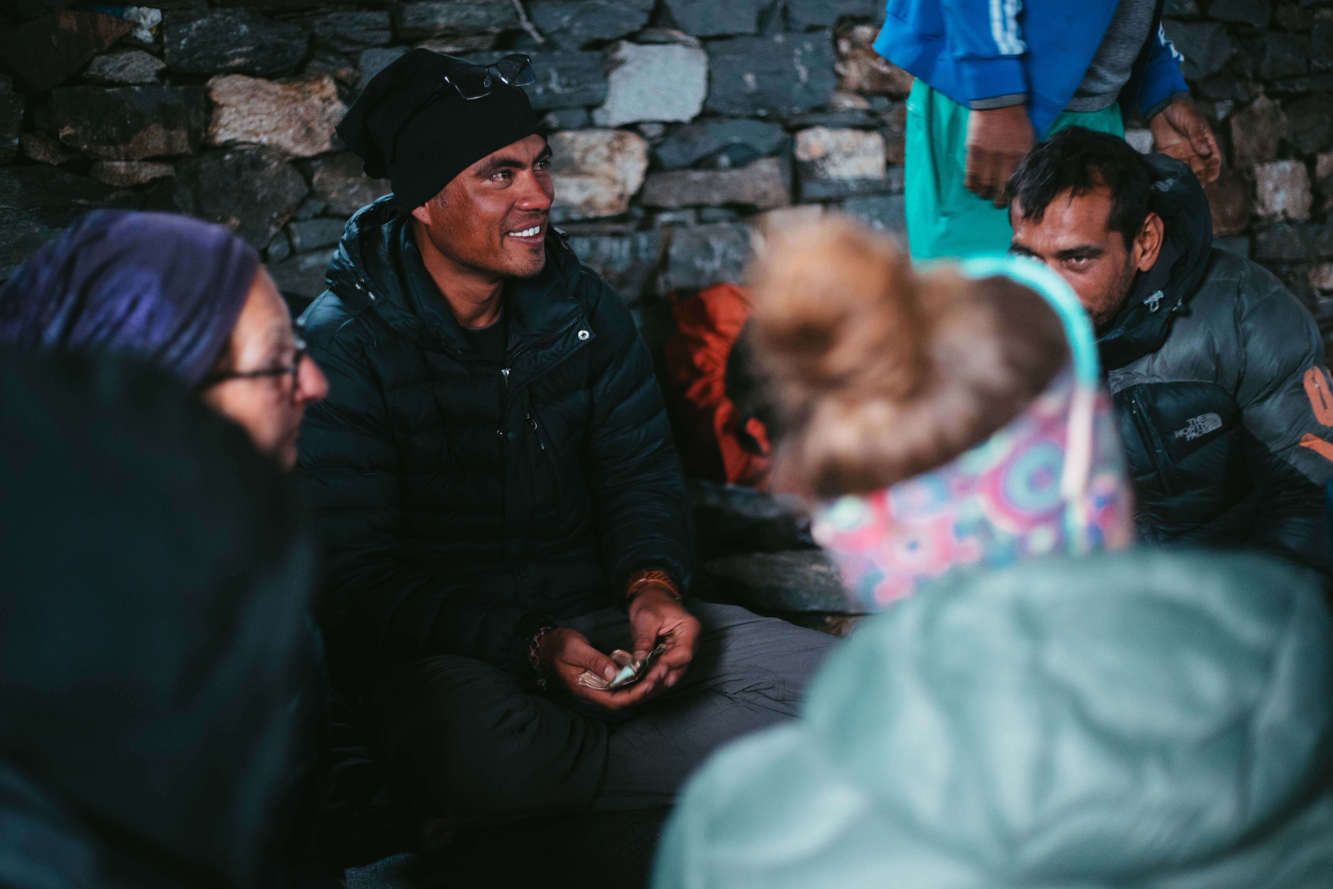 Après un bon repas, nous finissons par faire les présentations officielles avec les porteurs, le challenge pour eux comme pour nous est de bien prononcer les prénoms ! (Certains participants et népalais auront des diminutifs pour le reste du séjour !)