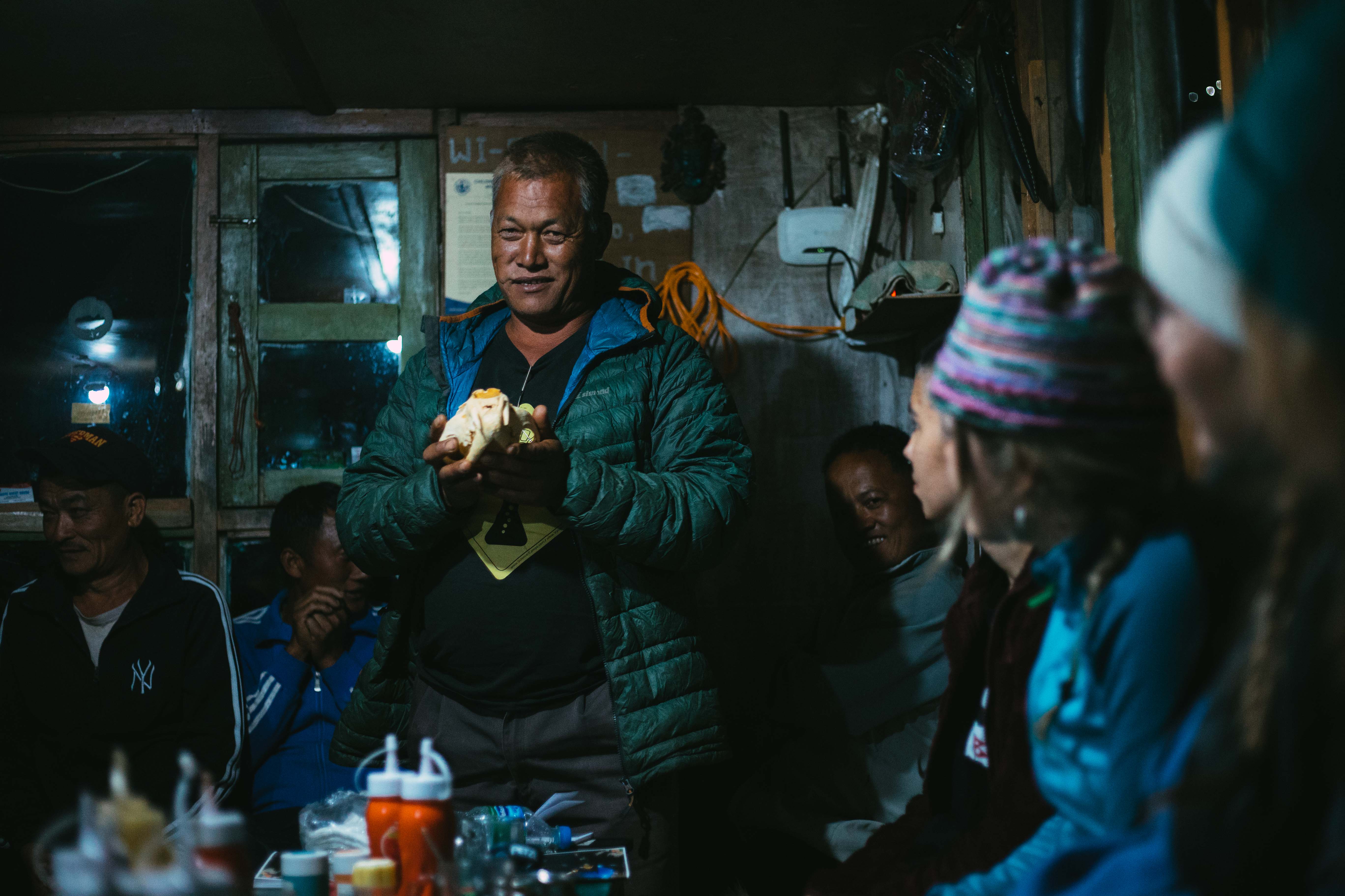 Aujourd’hui c’est l’anniversaire de Raj, notre guide népalais, on profite donc d’un bon gâteau au chocolat partagé entre tous les participants et les porteurs, un super moment !