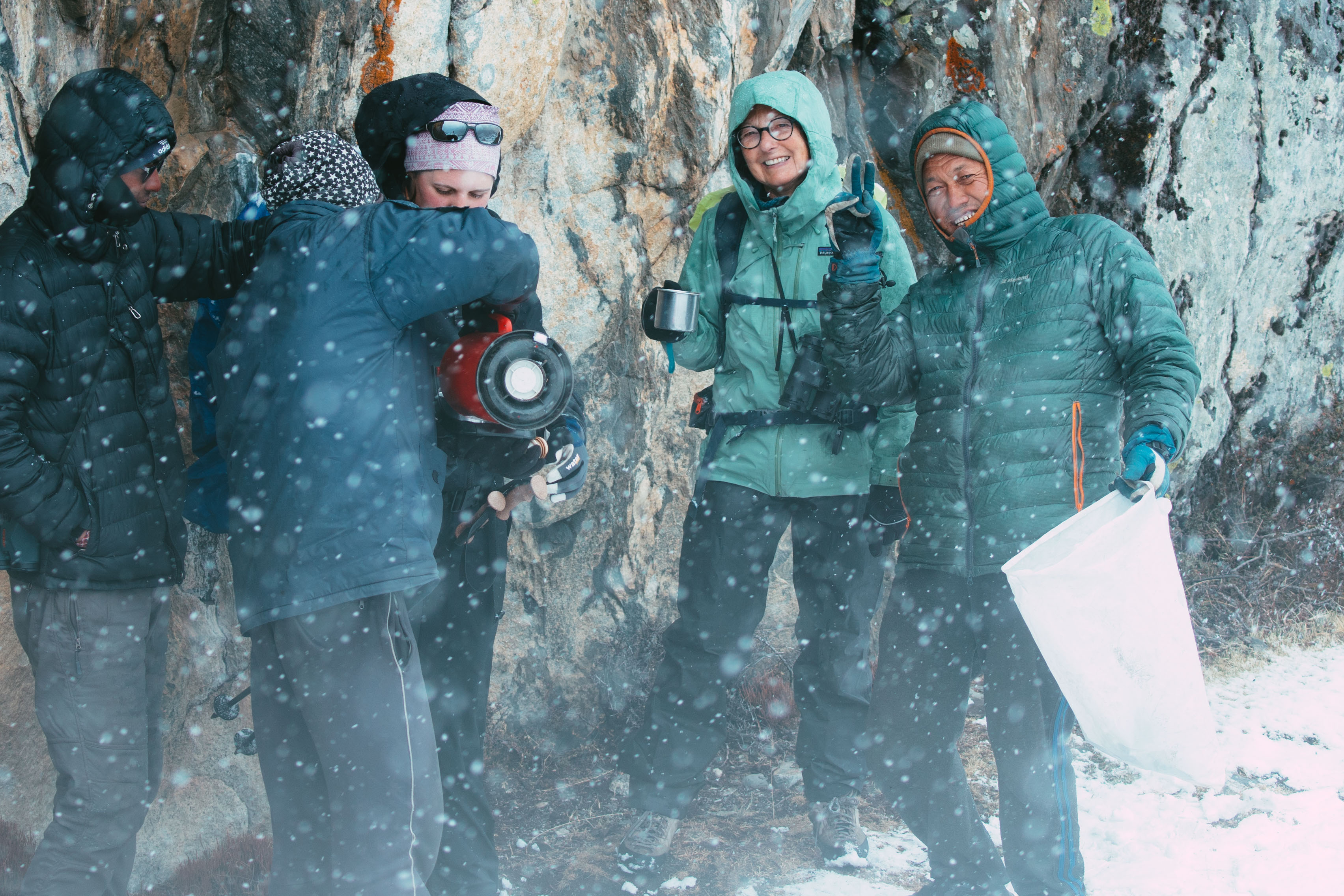 Avant de finir la journée, petit transect en bord de rivière. Mais la neige que la vallée attendait depuis quelques jours s’installe enfin, recouvrant le camp et le paysage d’un voile blanc presque irréel.