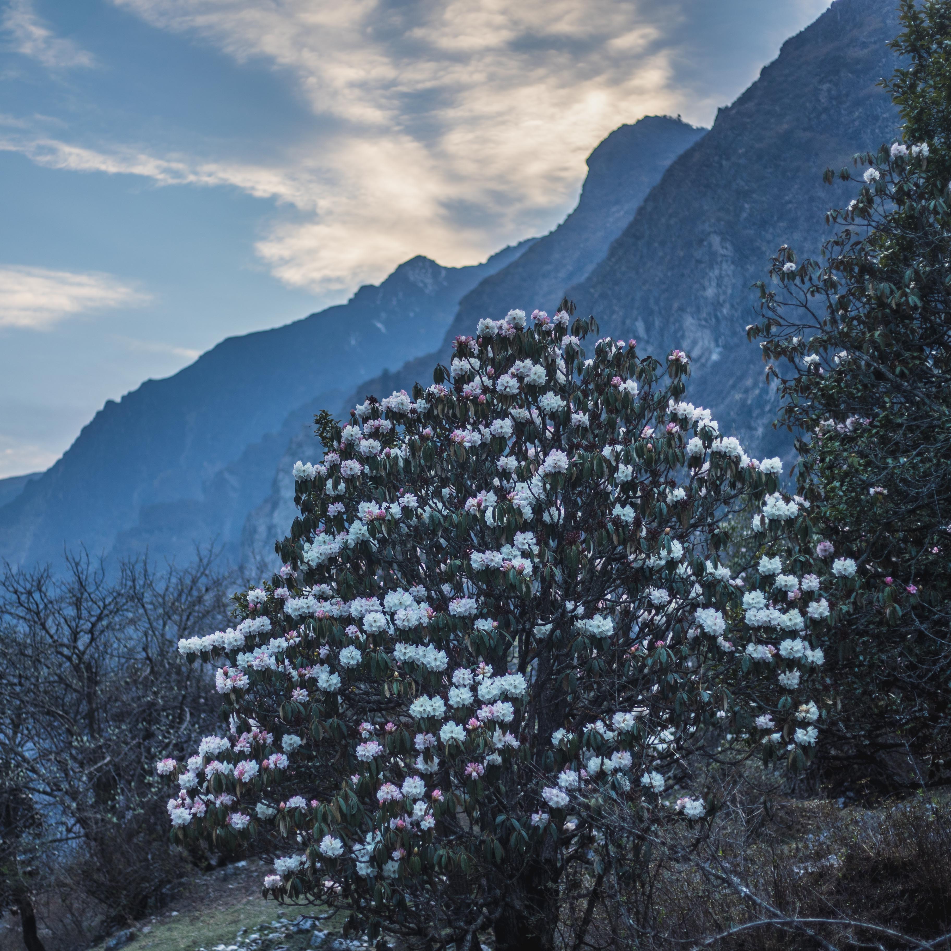 L’équipe s’arrête à Ghodatabela pour boire un bon jus d’Argousier froid ou chaud selon les envies. Nous reprenons notre chemin et sortons rapidement de la forêt sur un magnifique replat entourés de rhododendrons impressionnants.