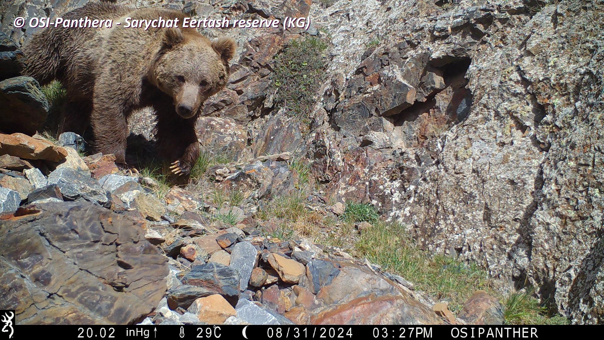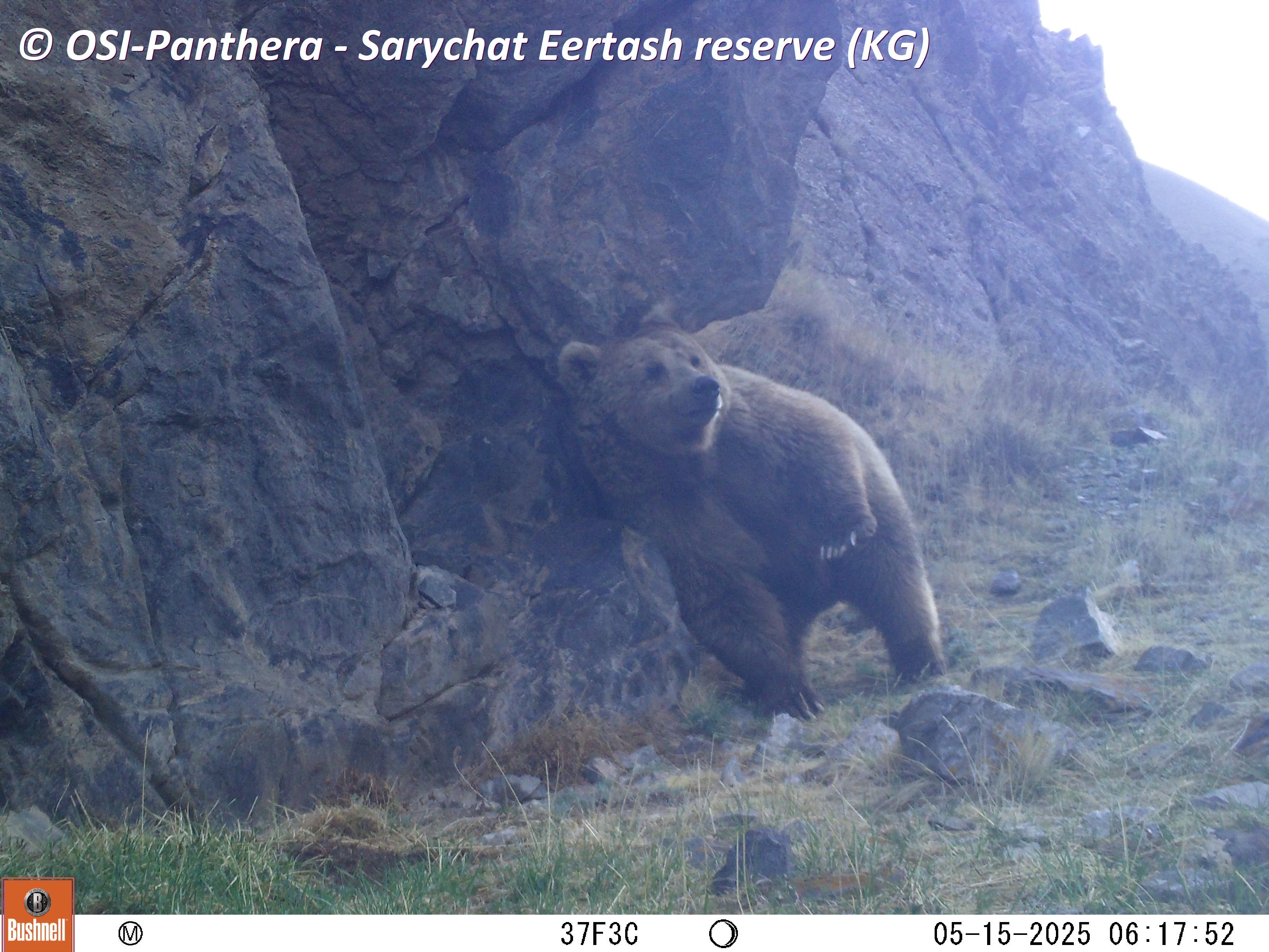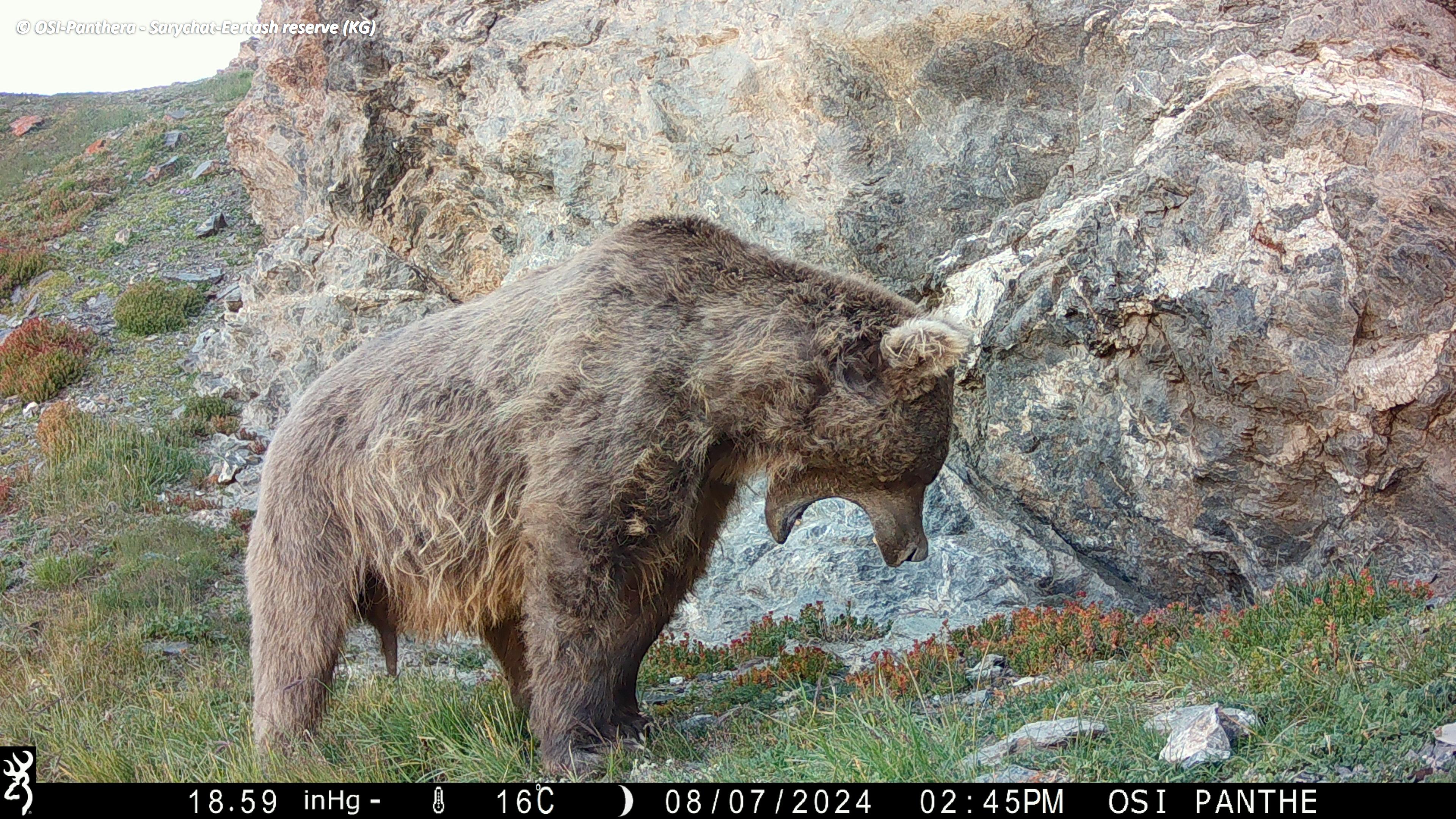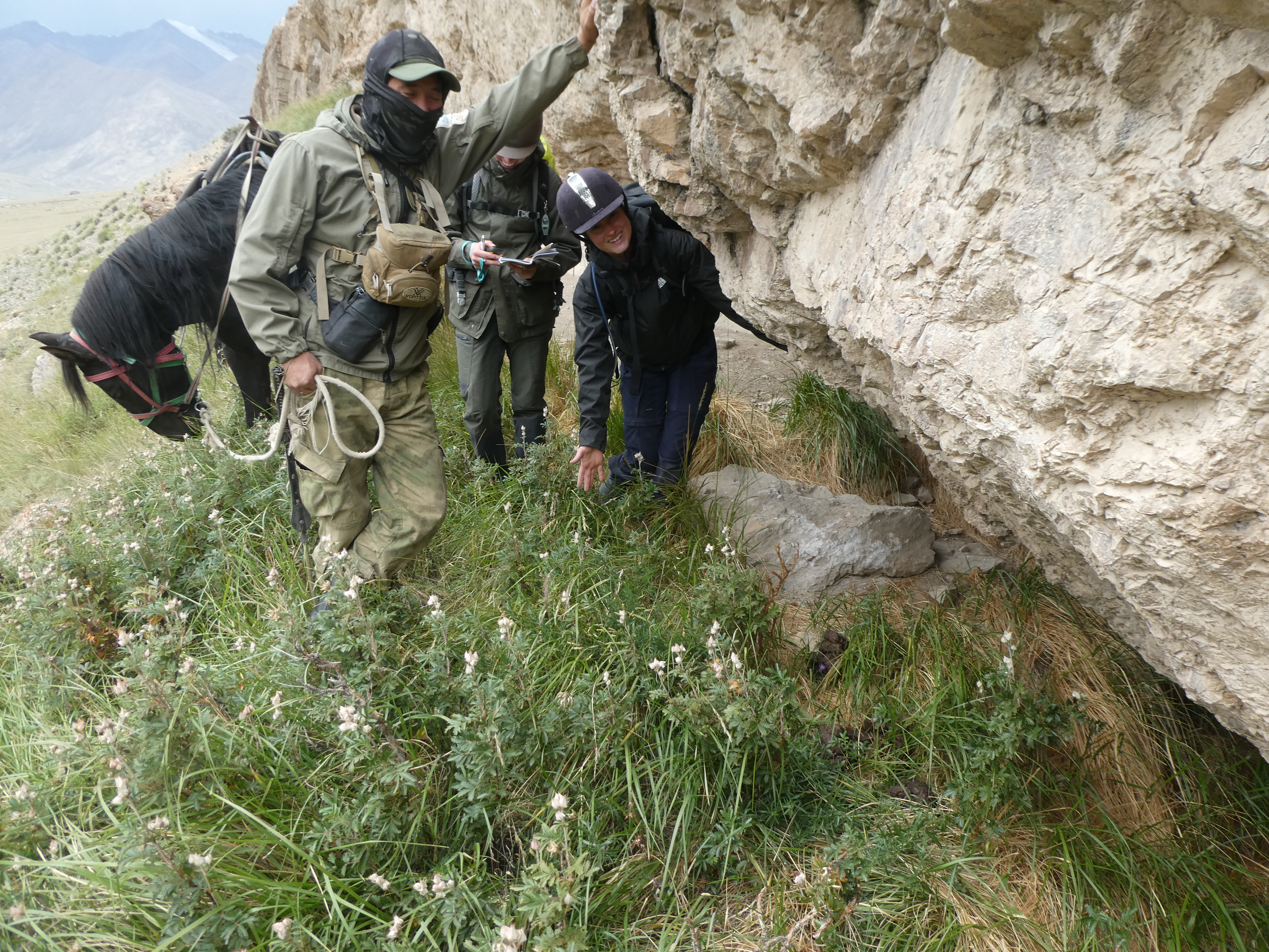 Après un beau petit-déjeuner nous nous séparons en deux groupes. Une première équipe part faire le transect le long de la barre rocheuse d’Oroi Suu. Nous tenons de nombreux indices d’ours sur le transect. Les résultats du piège-photo sont géniaux : de nombreuses images de panthères des neiges et d’ours.