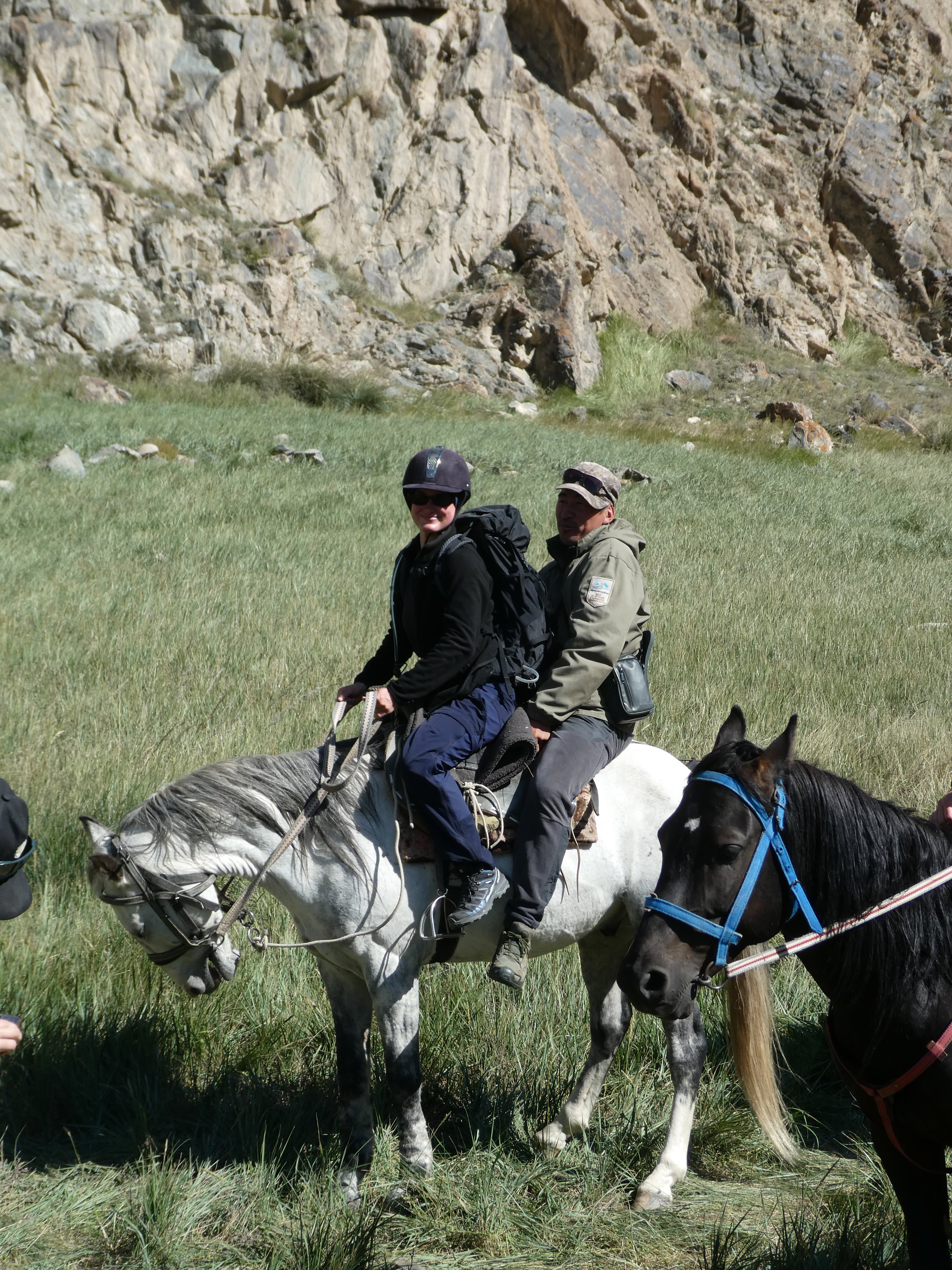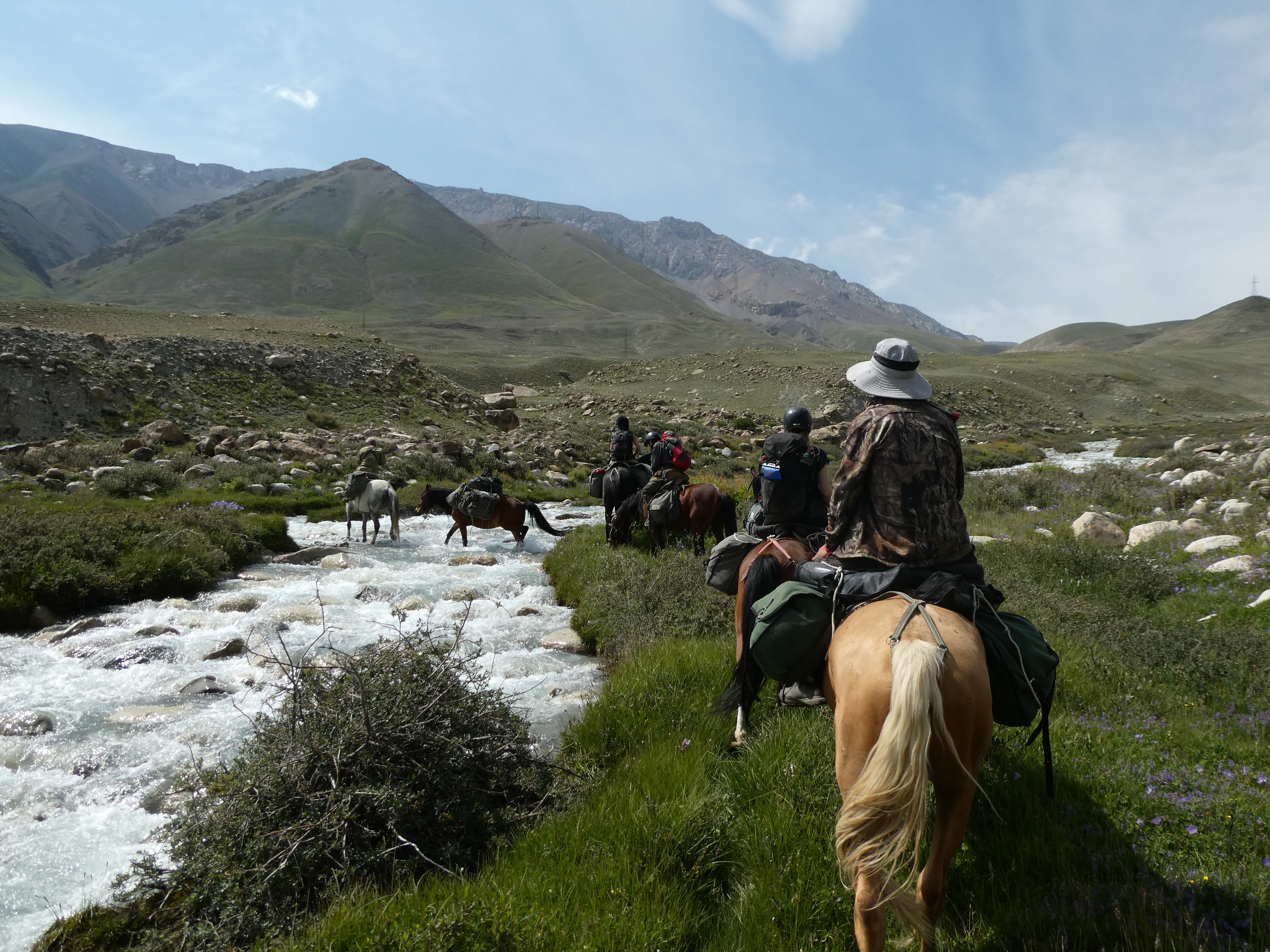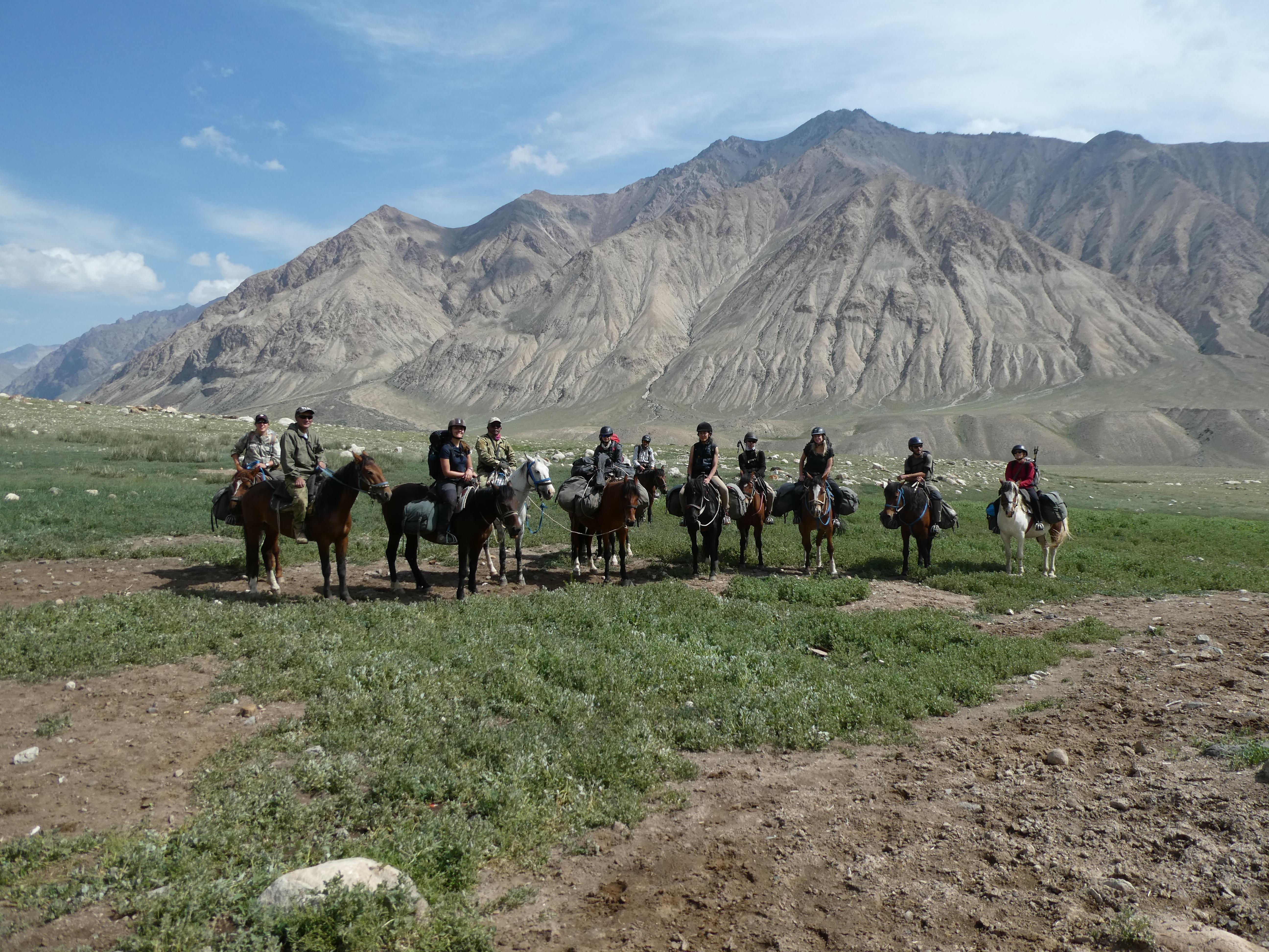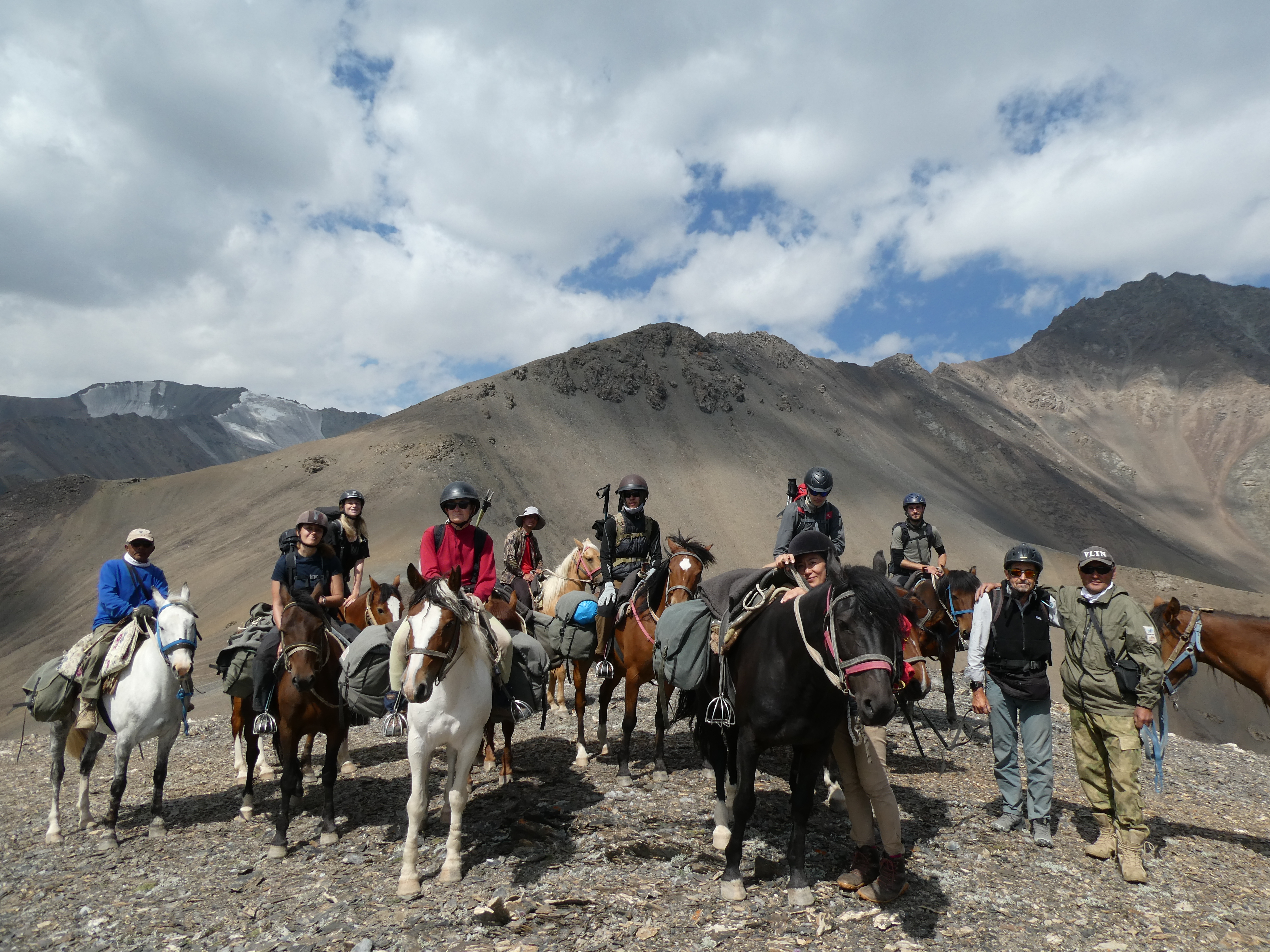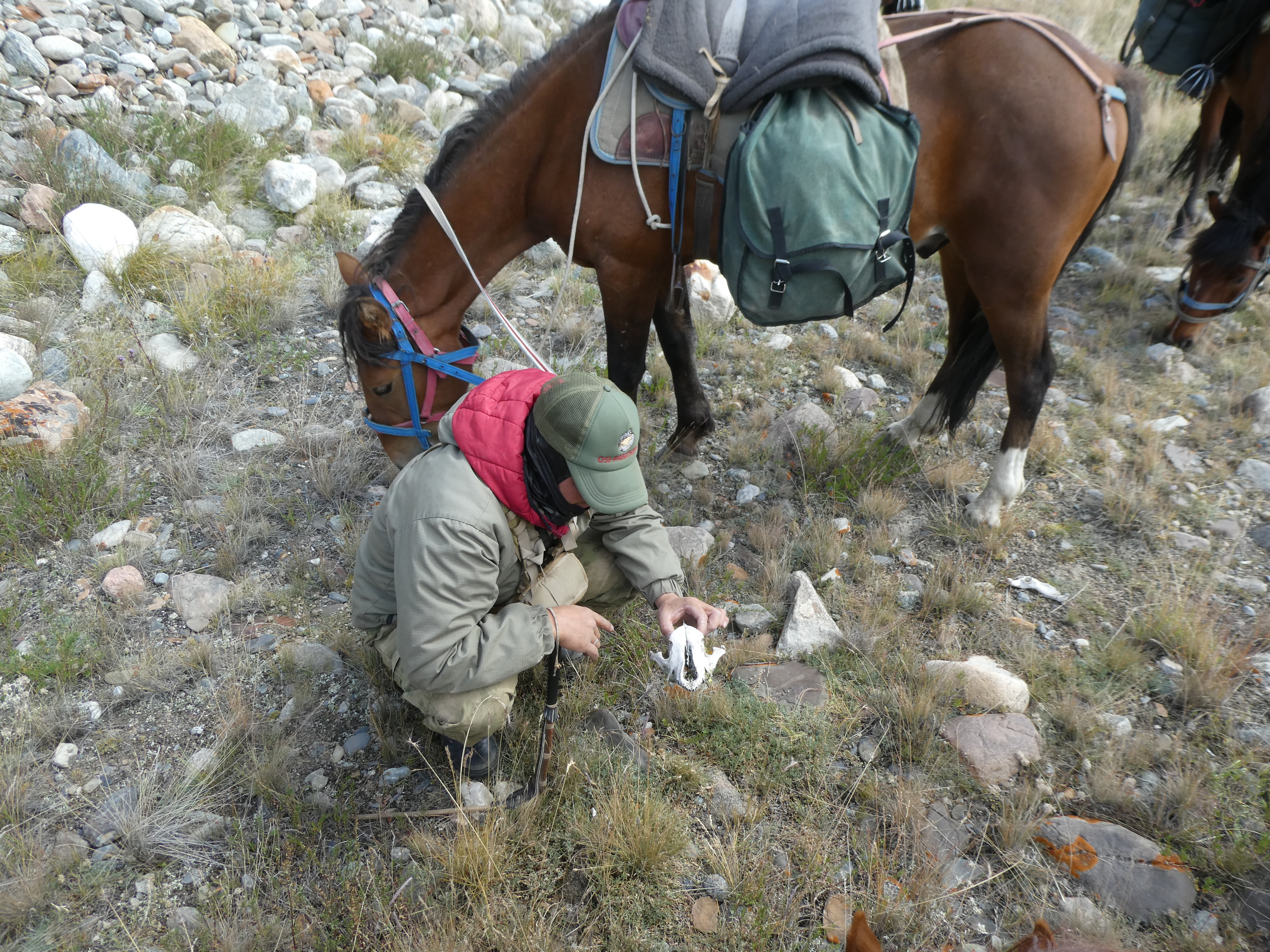 Préparation des sacoches pour le passage à cheval du col d’Eshegart à 3800 m. À la redescente vers le camps nous observons une trentaine d’Argalis mâles qui nous repèrent de loin et prennent la fuite.