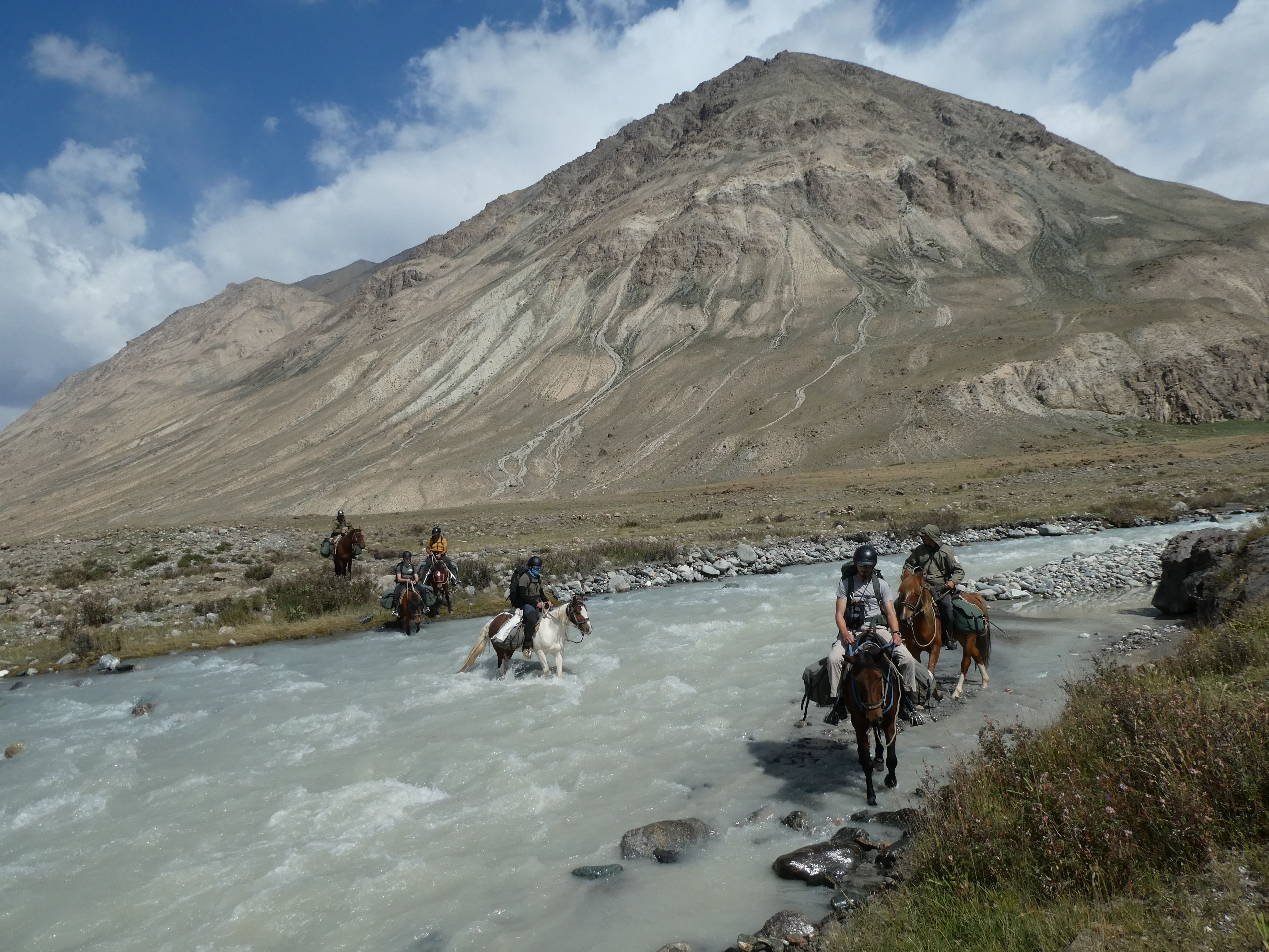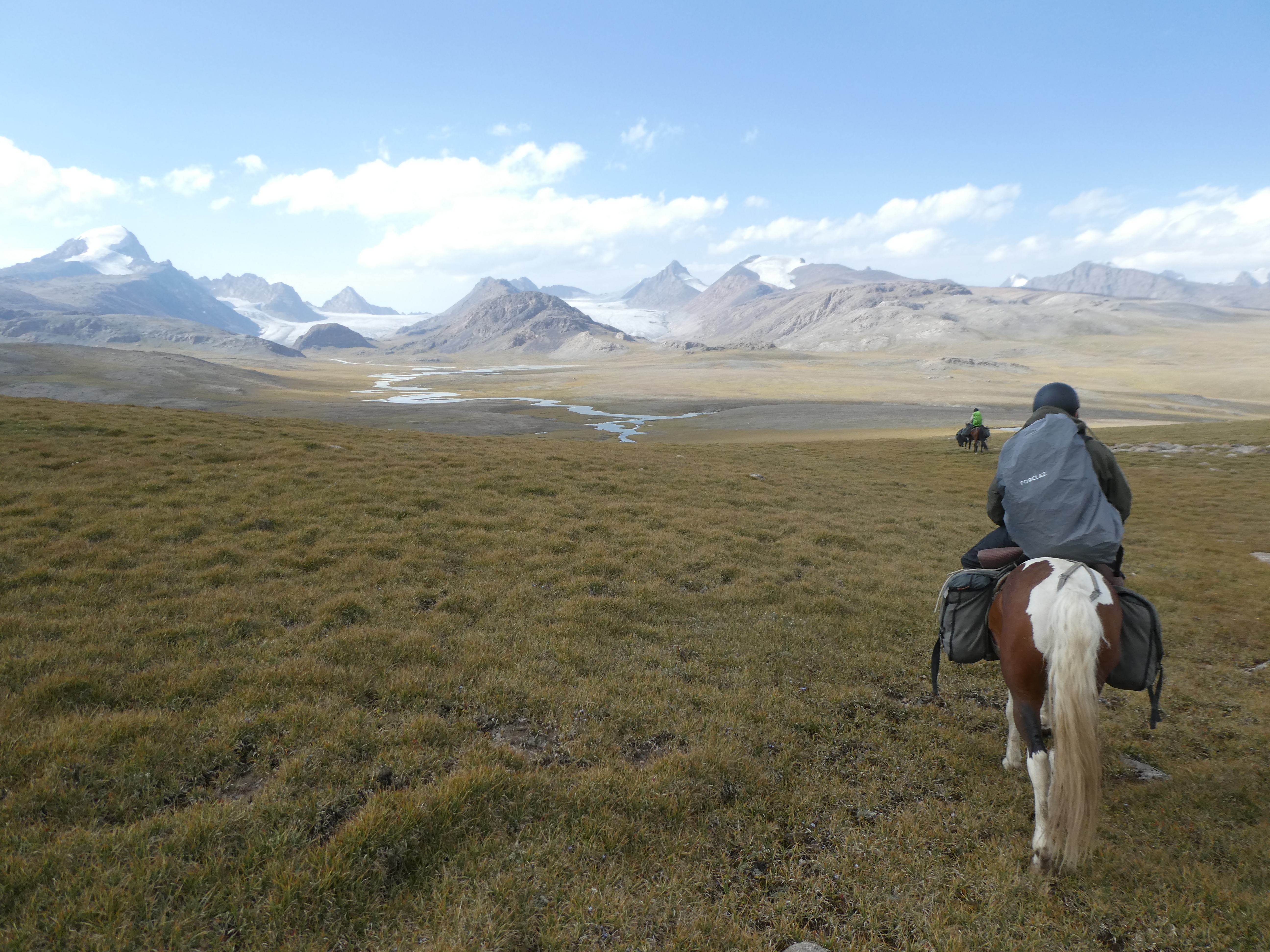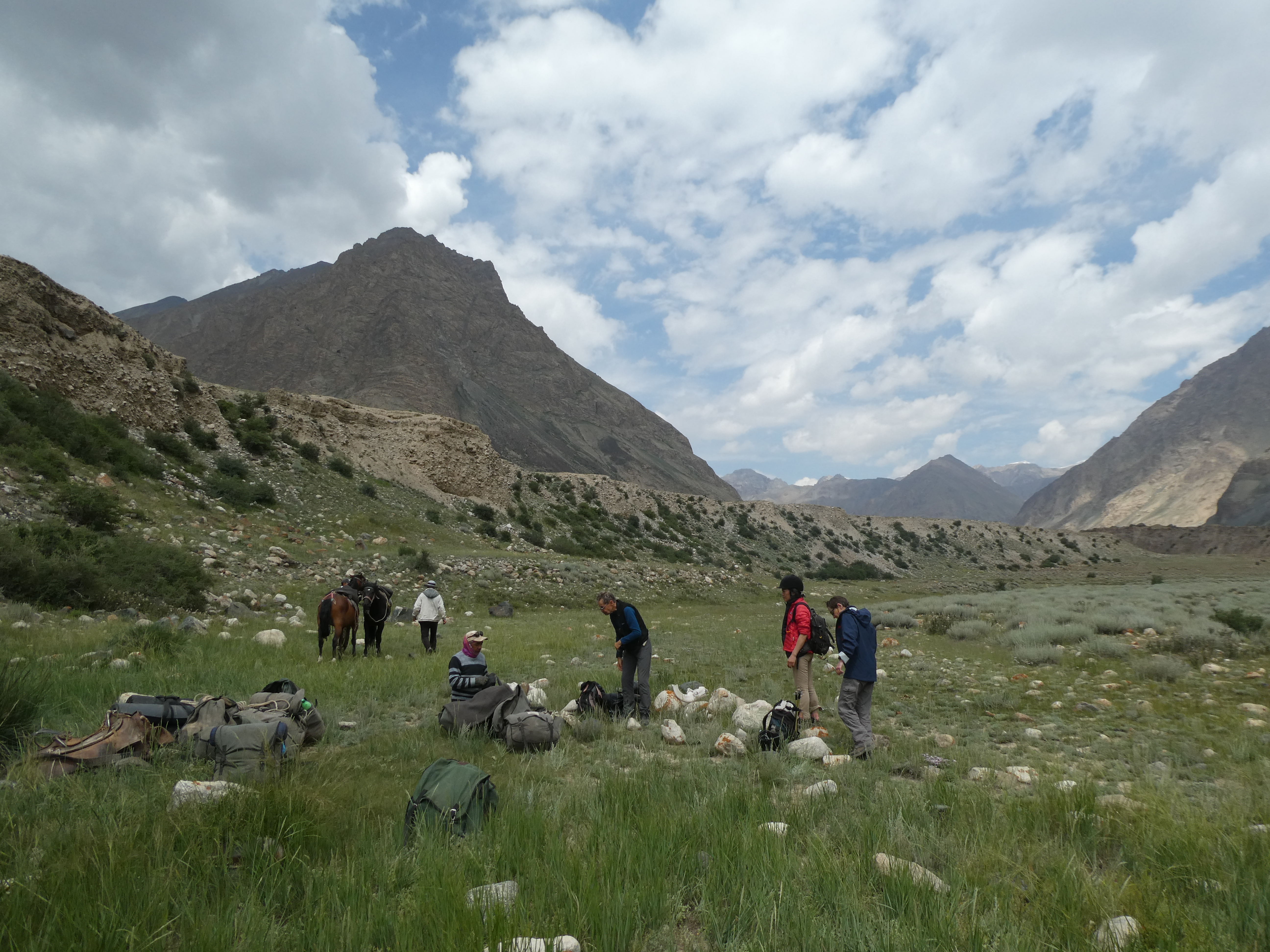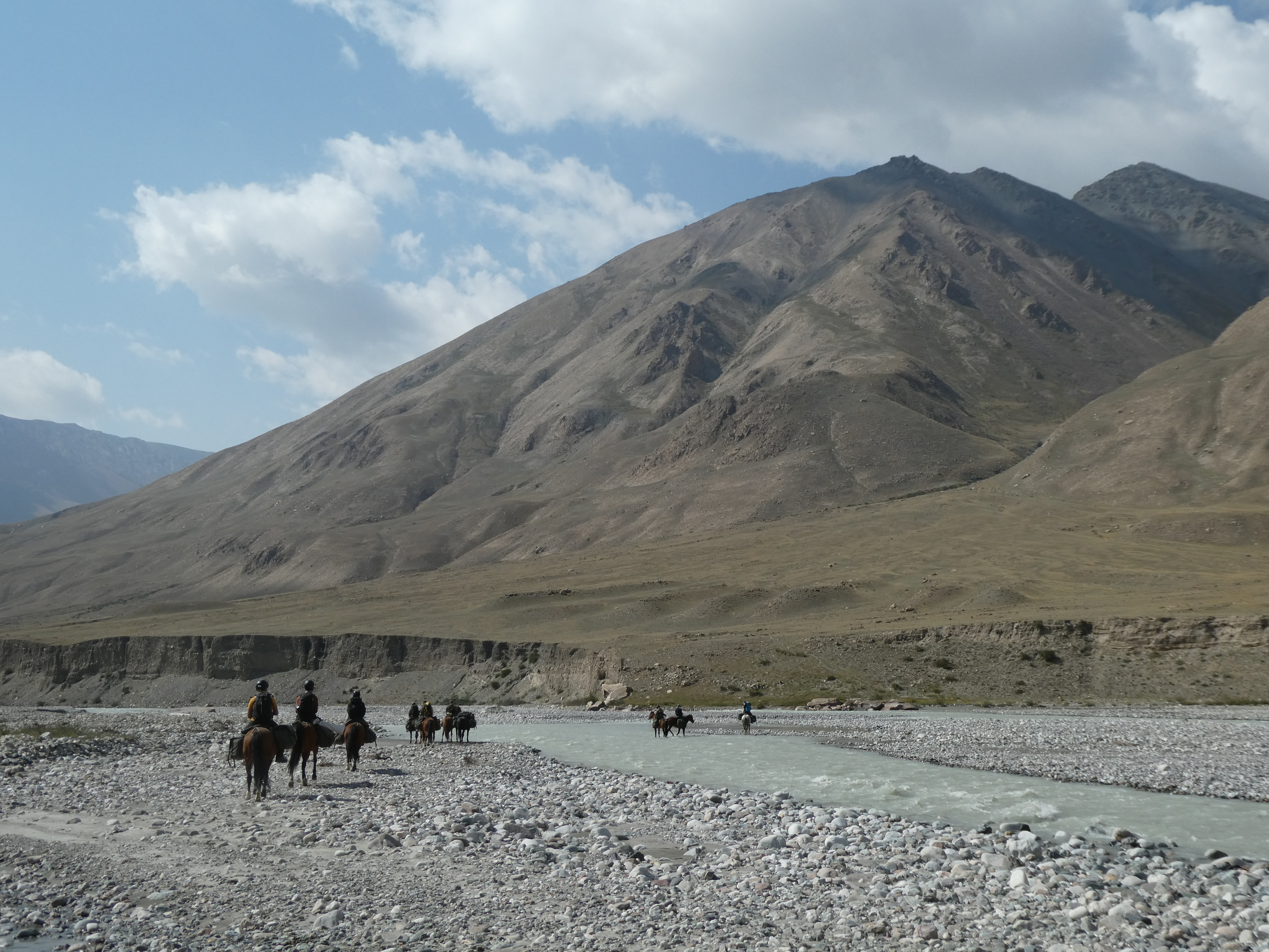 Préparation des sacoches pour le passage à cheval du col d’Eshegart à 3800 m. À la redescente vers le camps nous observons une trentaine d’Argalis mâles qui nous repèrent de loin et prennent la fuite.