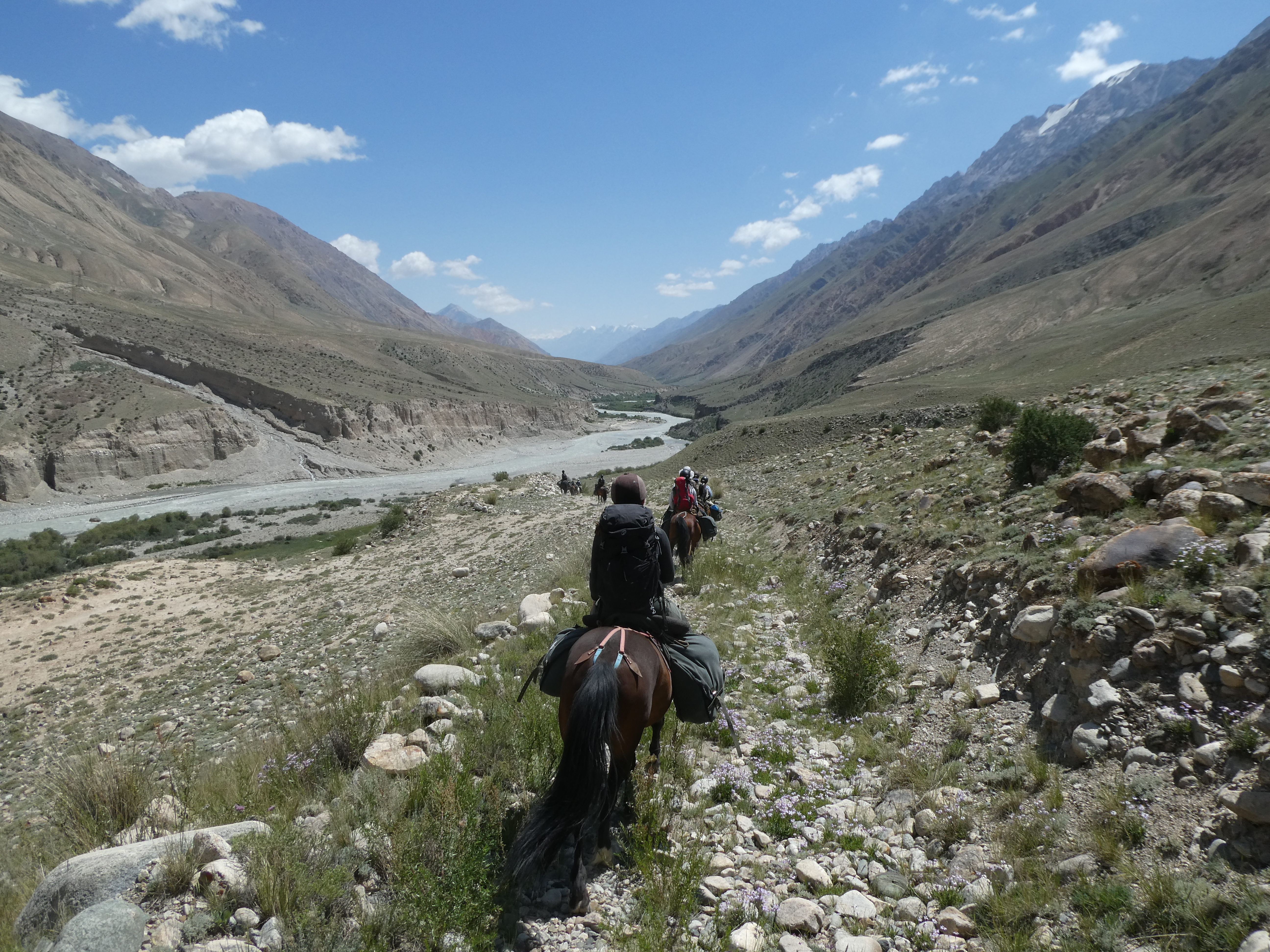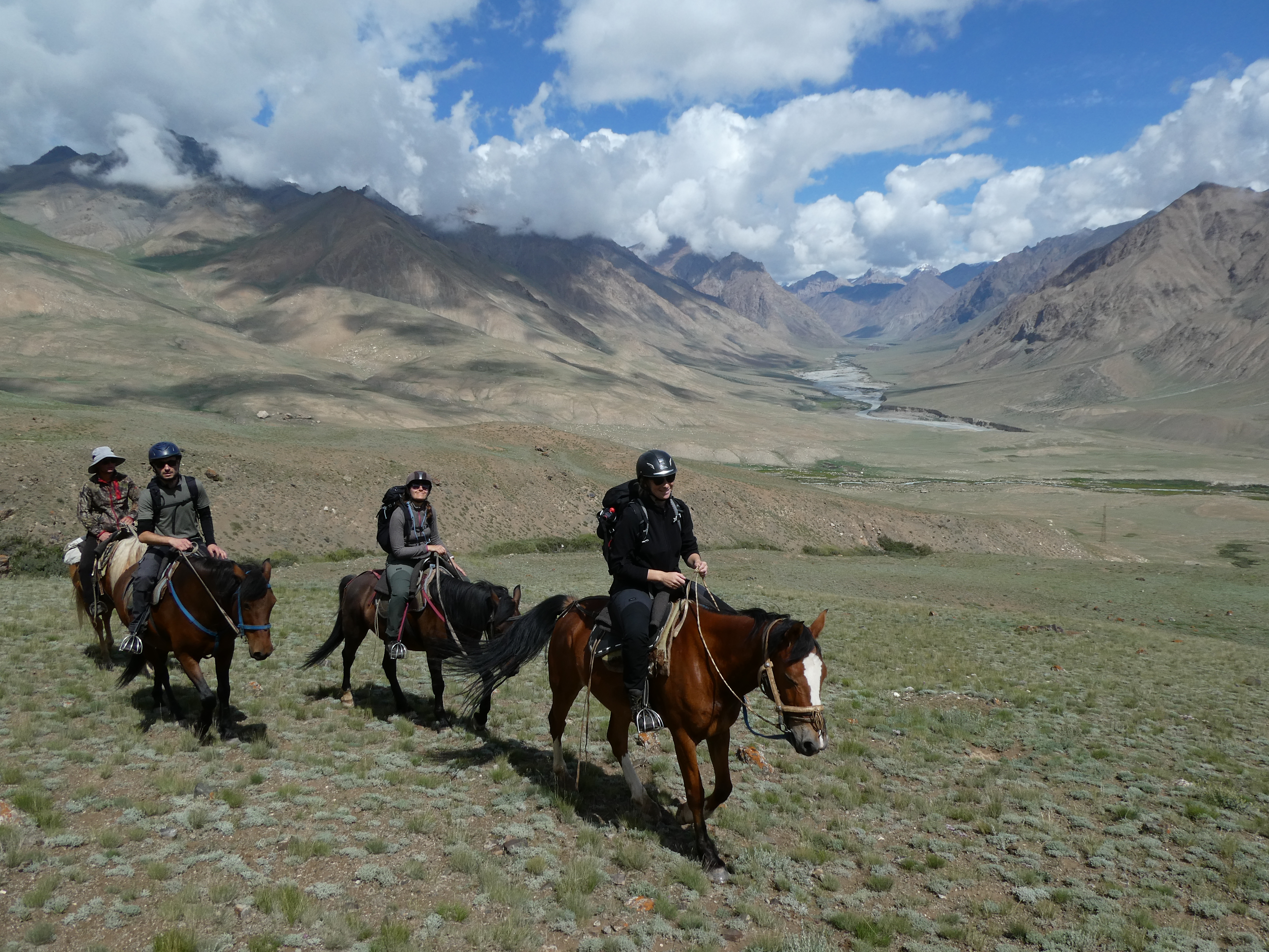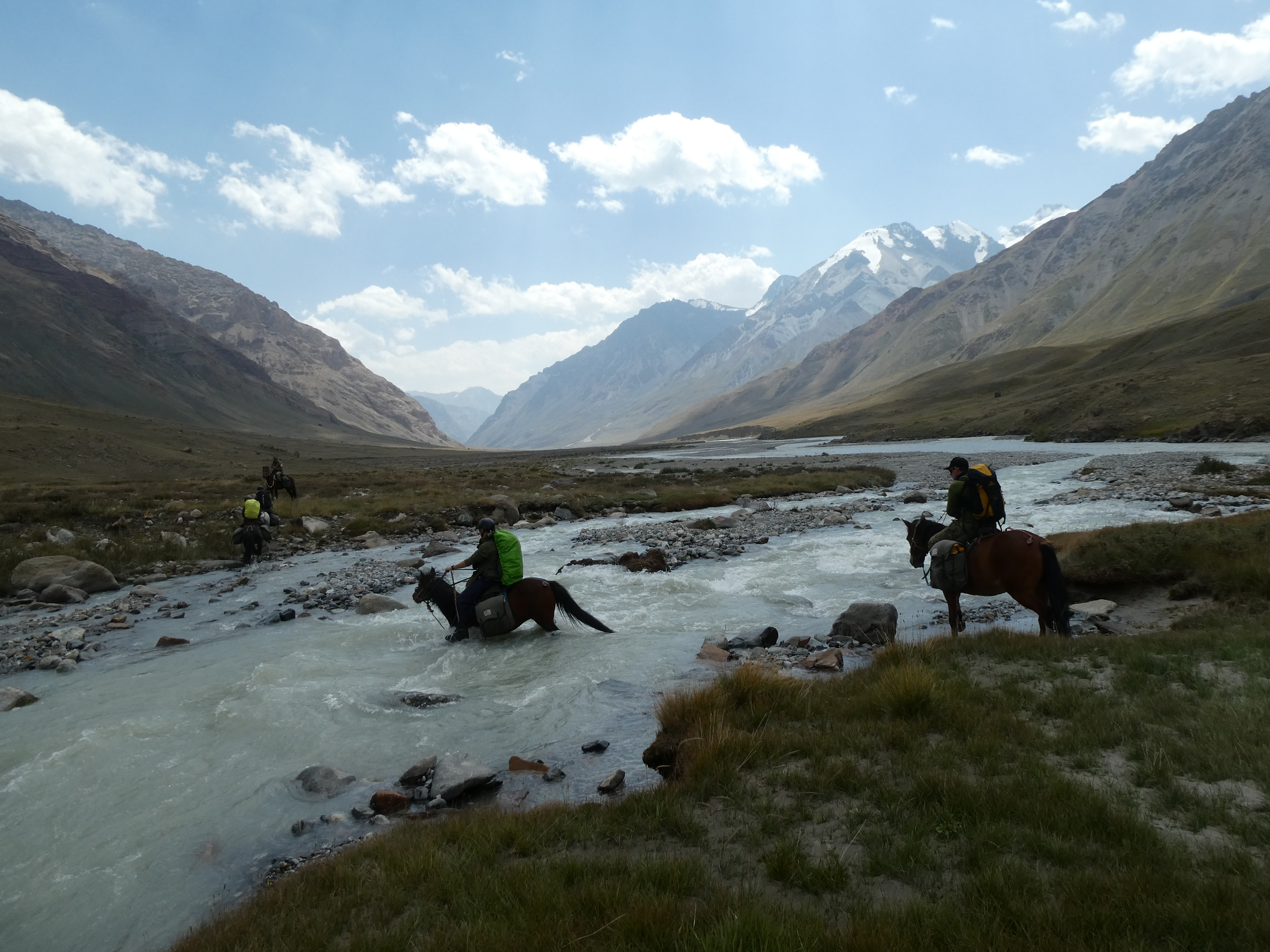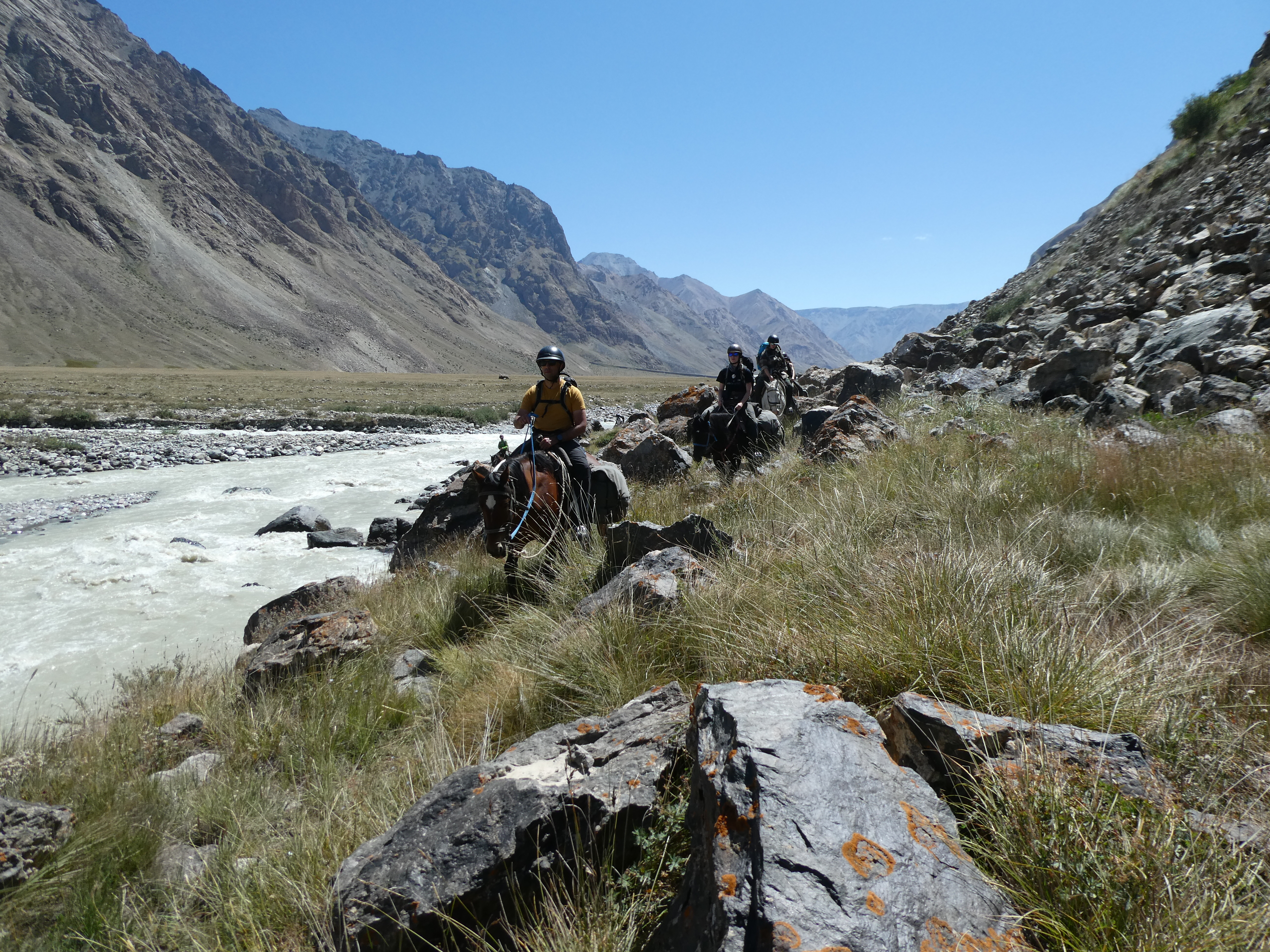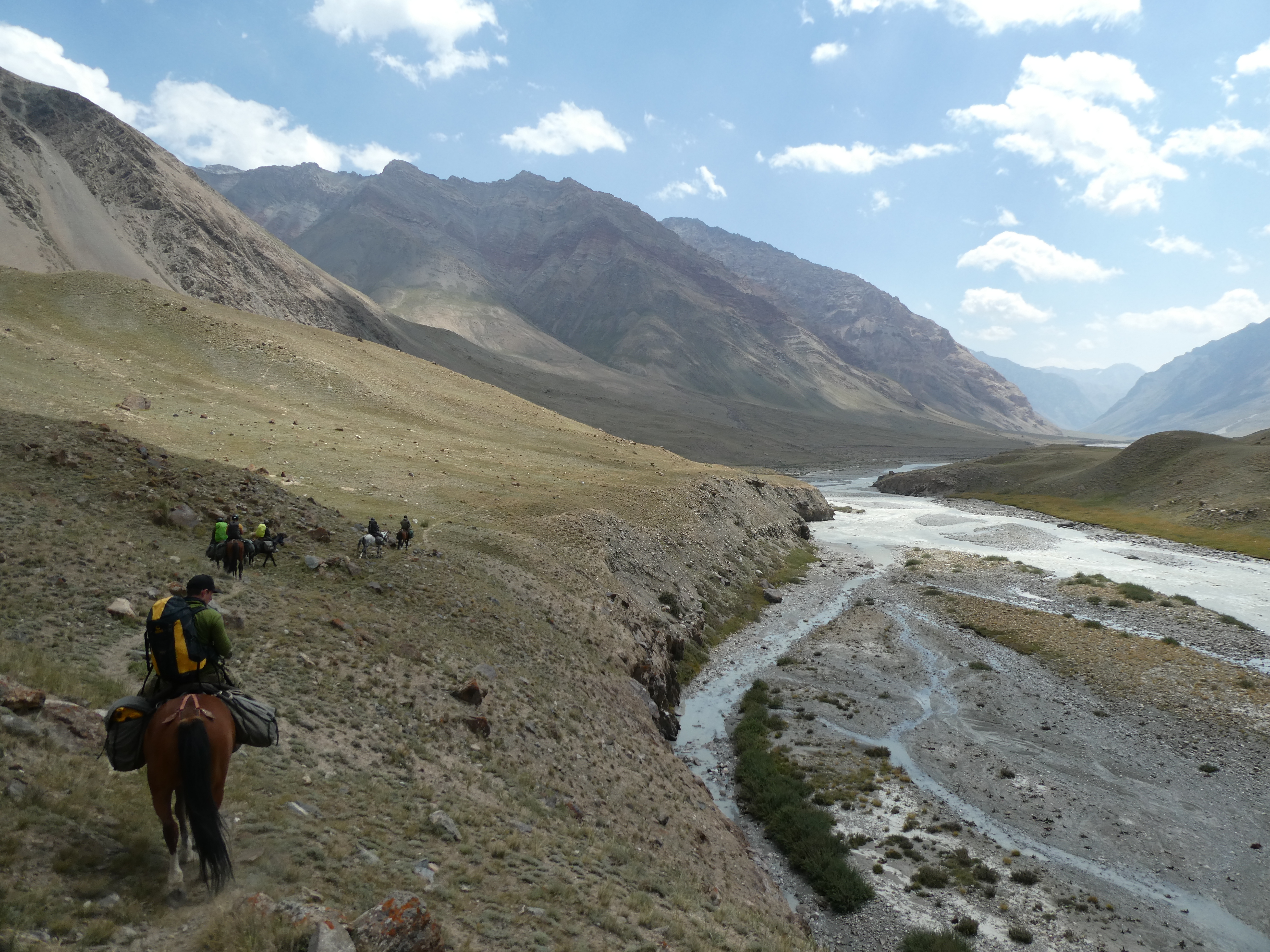 Préparation des sacoches pour le passage à cheval du col d’Eshegart à 3800 m. À la redescente vers le camps nous observons une trentaine d’Argalis mâles qui nous repèrent de loin et prennent la fuite.