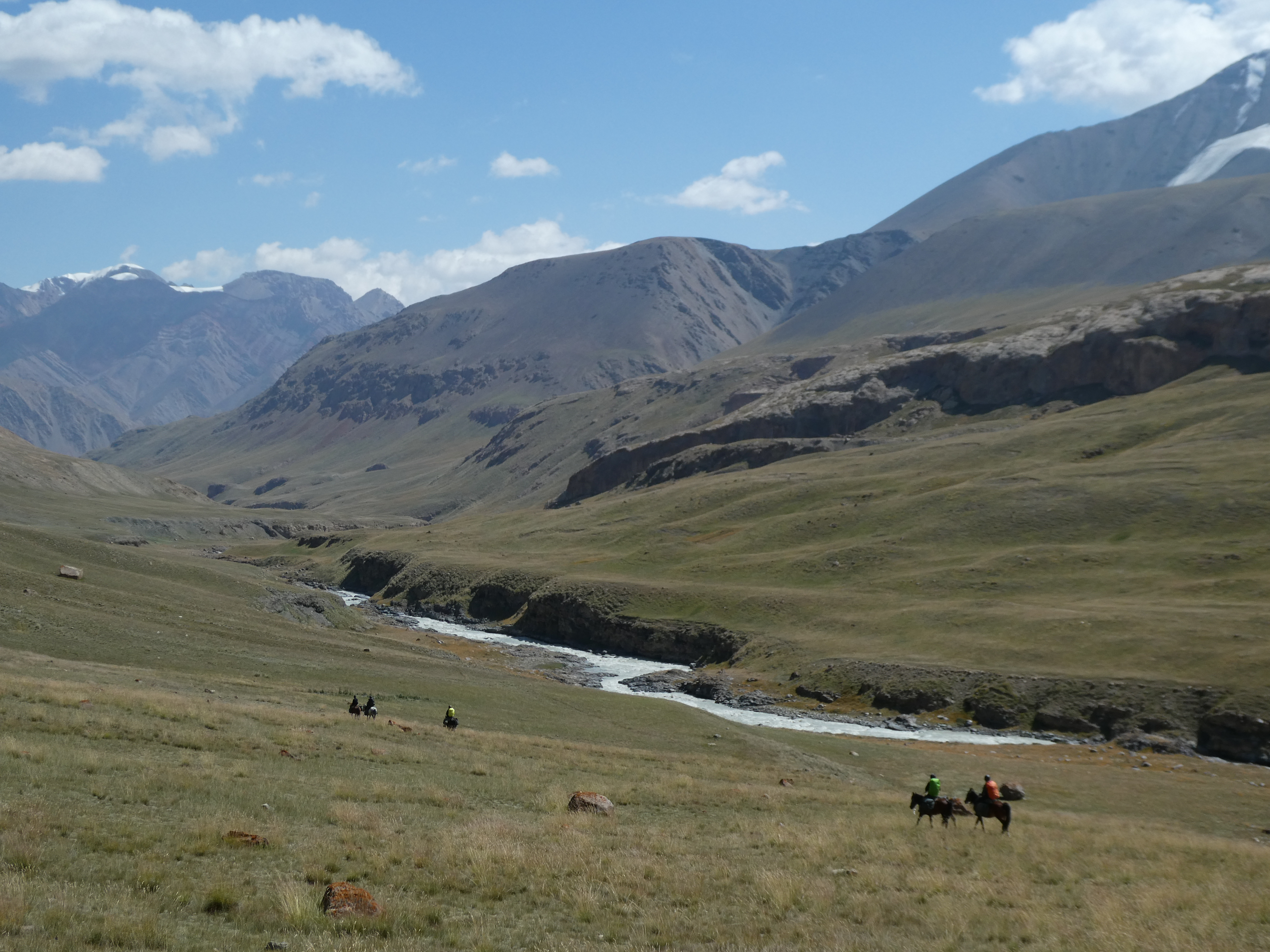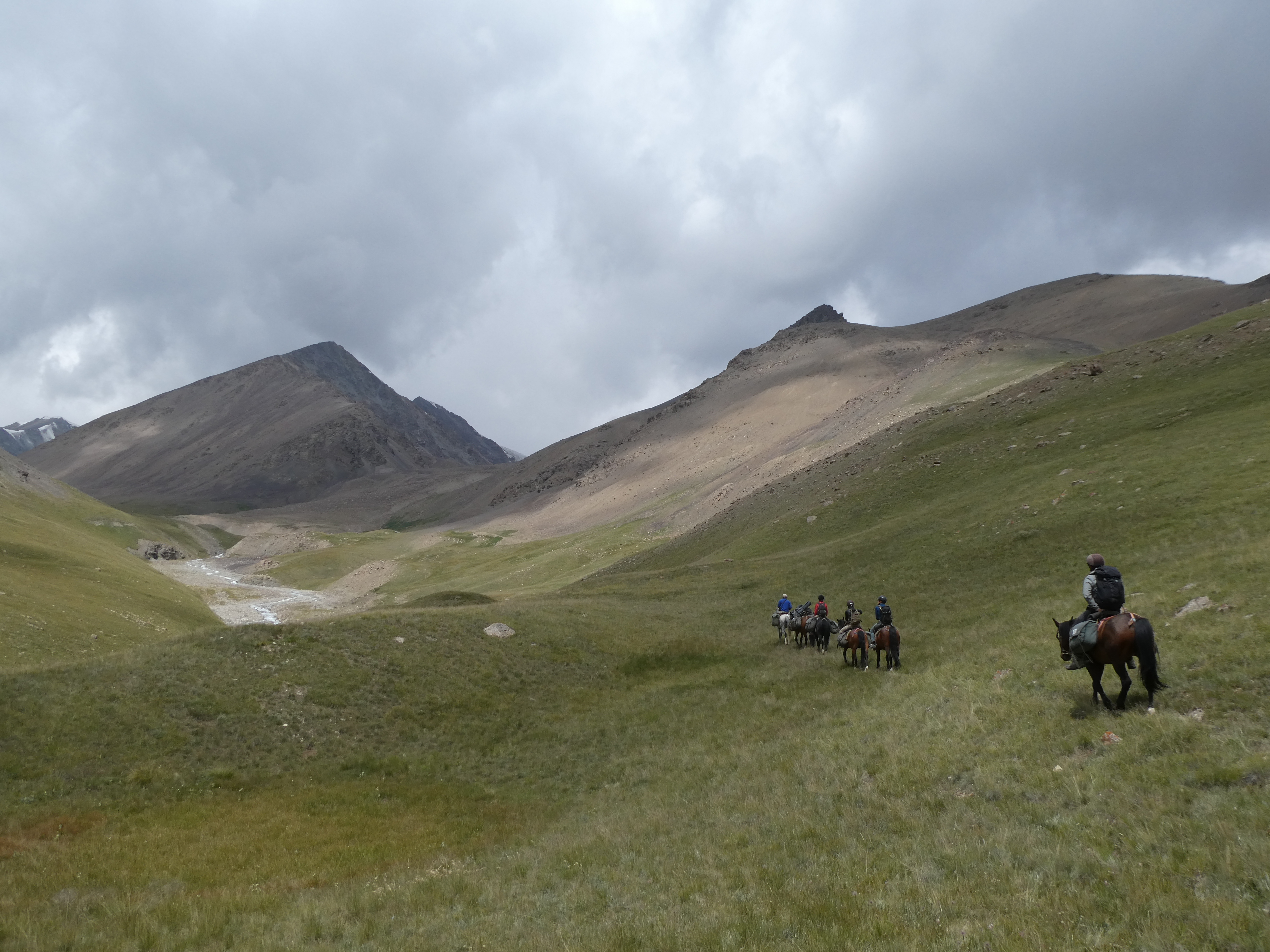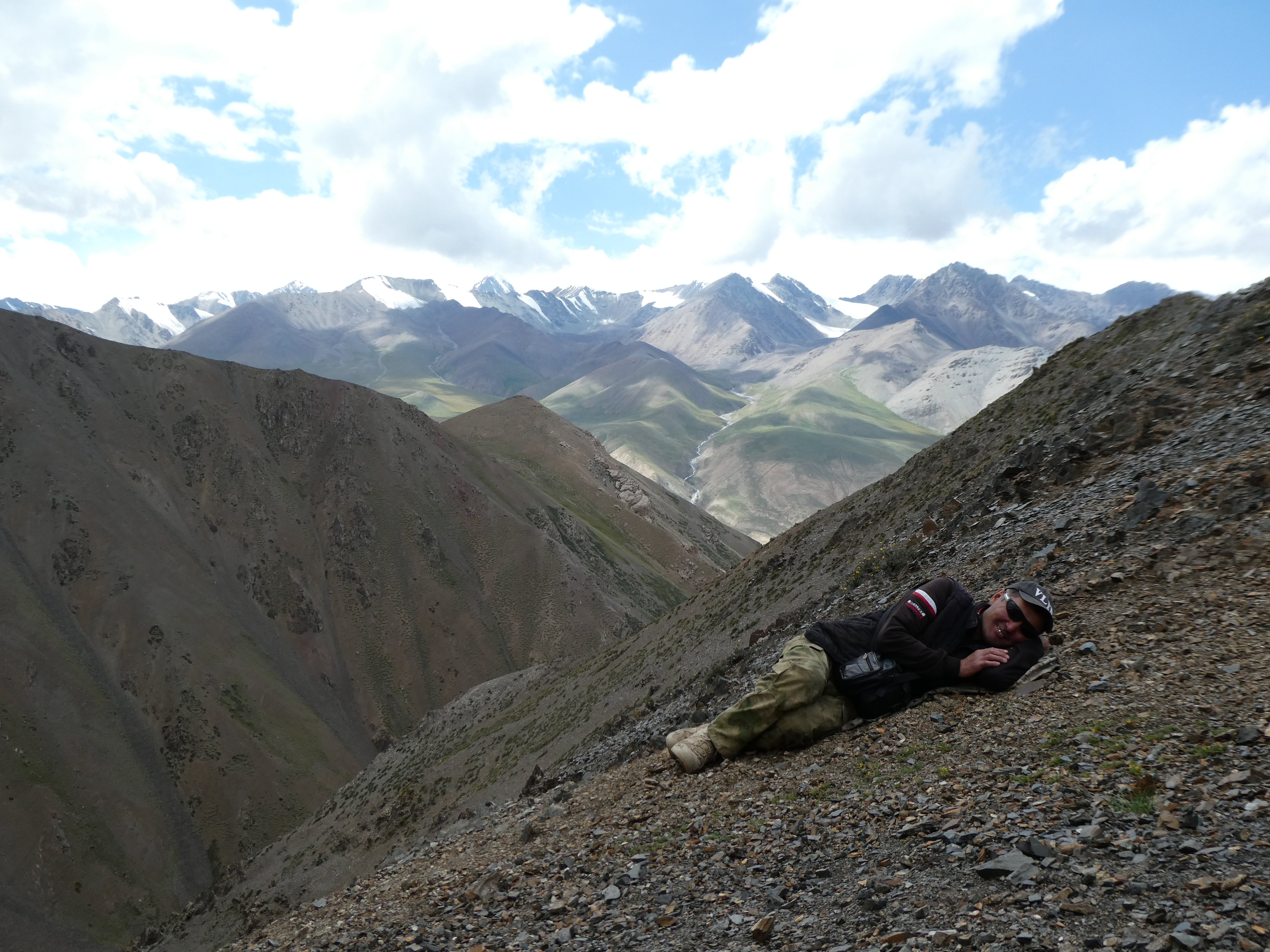 La nuit a été courte pour certains...! On charge les véhicules, les gardes redescendent également sur Issyk Kul. Un gypaète nous survole en guise d’adieu. En route au poste militaire de Kara Sai (car nous sommes à moins de 50km de la frontière chinoise, ce qui nécessite des autorisations particulières) nous croisons une multitude de cyclistes. En ce moment se tient la course « Silk Road » à travers les steppes et sommets kirghizes avec plusieurs centaines de participants du monde entier. Le fils d’un ami de Jean-Phi participe mais on ne le croise pas ! On passe par le col de Seok à 4000m vestige d’une histoire particulière sous l’ère soviétique.