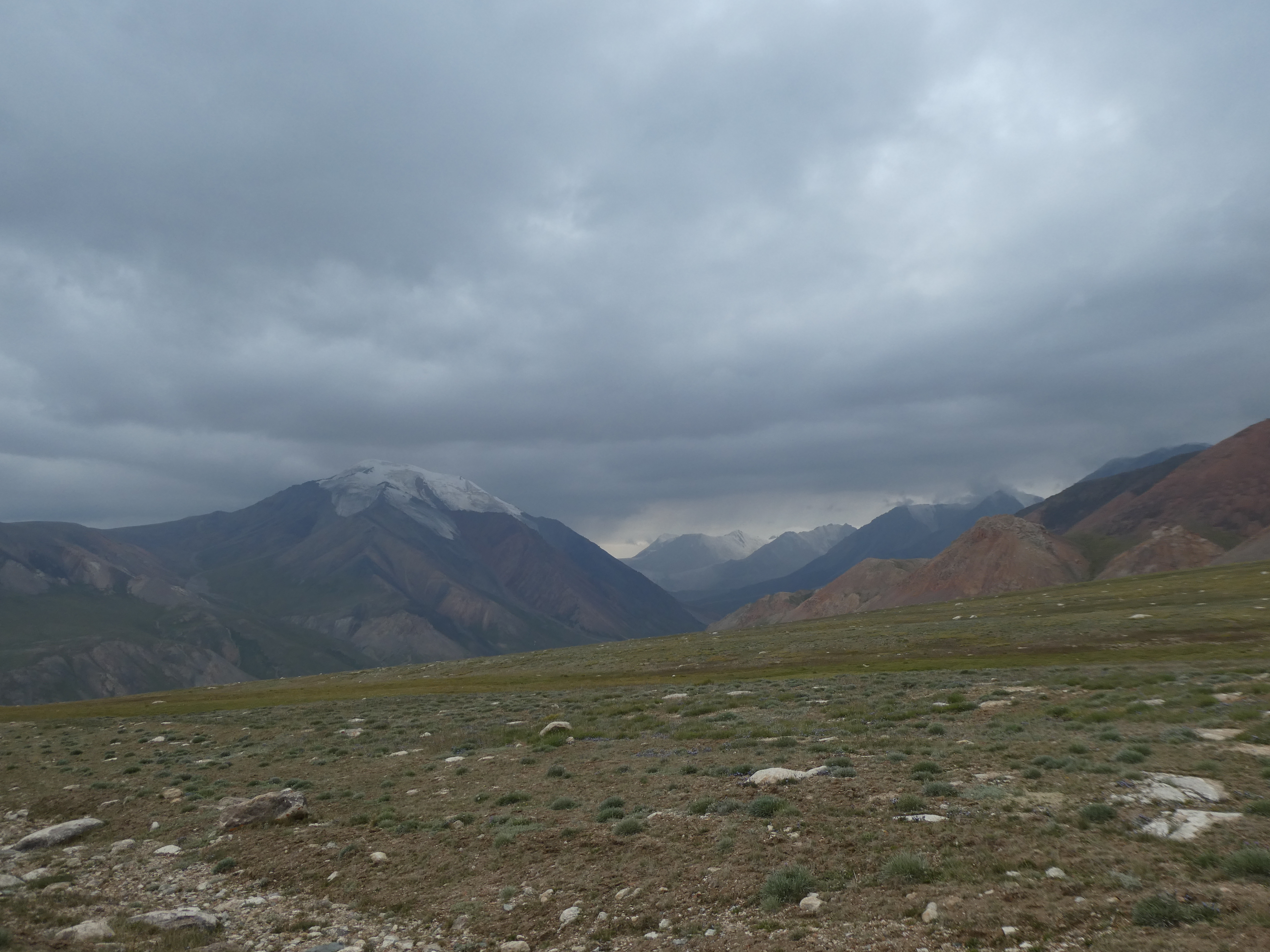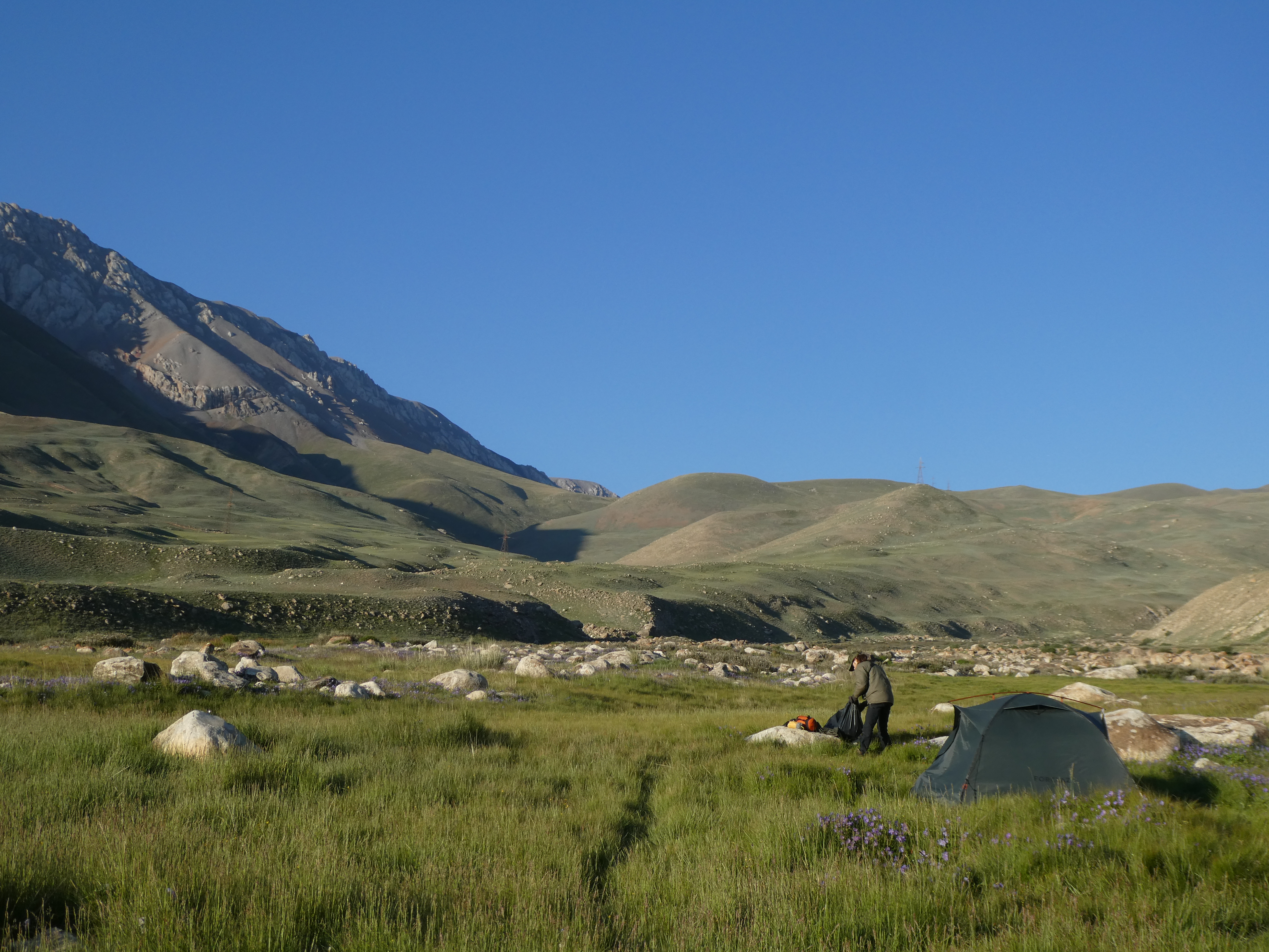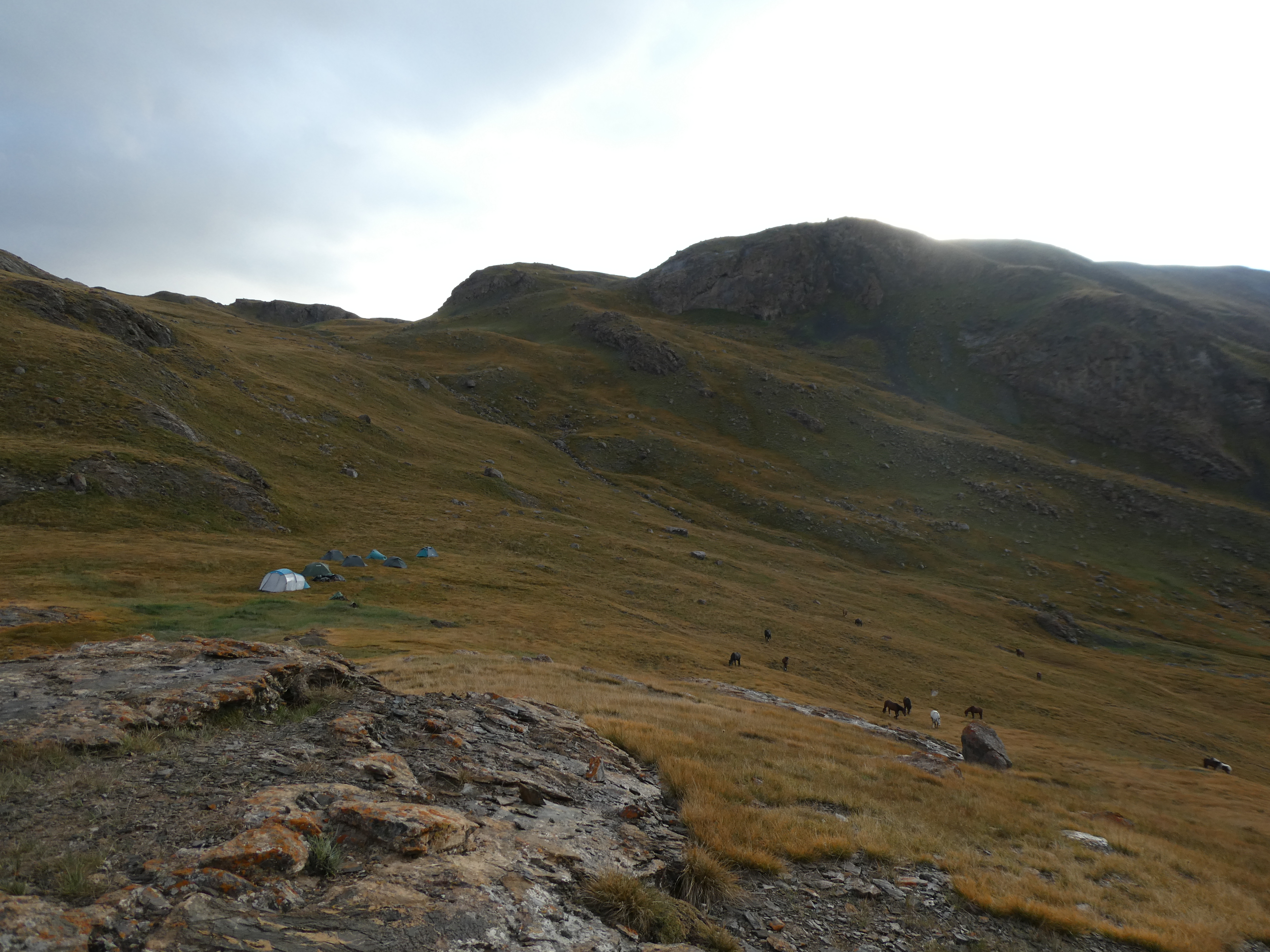 Ce matin on se réveille à Eshegart, ce seront nos derniers comptages, 10 mouflons par-ci, 14 par-là. Vianney essaye d’expliquer à Arno où est le dernier groupe, celui-ci lui répond qu’il y a aussi 2 loups en déplacement au plan d’avant ! Ce sont des loups « rouges » comme disent les gardes, ils ont un poil presque roux par endroits. L’un d’eux est à l’affût entre les terriers de marmottes. On l’observera plus d’1h avec 2 tentatives manquées. Il finira par abandonner. Après ces magnifiques instants il est temps pour nous de ranger le camp. Nous décidons de passer par le vallon de Kashkateur afin de tenter une dernière observation de loups. Avant le pique-nique nous compterons encore plusieurs dizaines de mouflons, nous observons un renard mulotter puis il est temps de passer le fameux col d’Eshegart avec une petite averse de neige (comme souvent à 3900 m !). Après une longue descente nous arrivons enfin au camp de Koiendou, entrée sud pour la réserve. Tinchtik est arrivé avant et à préparé la pâte à pain. Nos chauffeurs nous rejoignent, un super dîner et une soirée festive à jouer aux cartes, écouter de la musique, etc. avec nos super gardes !