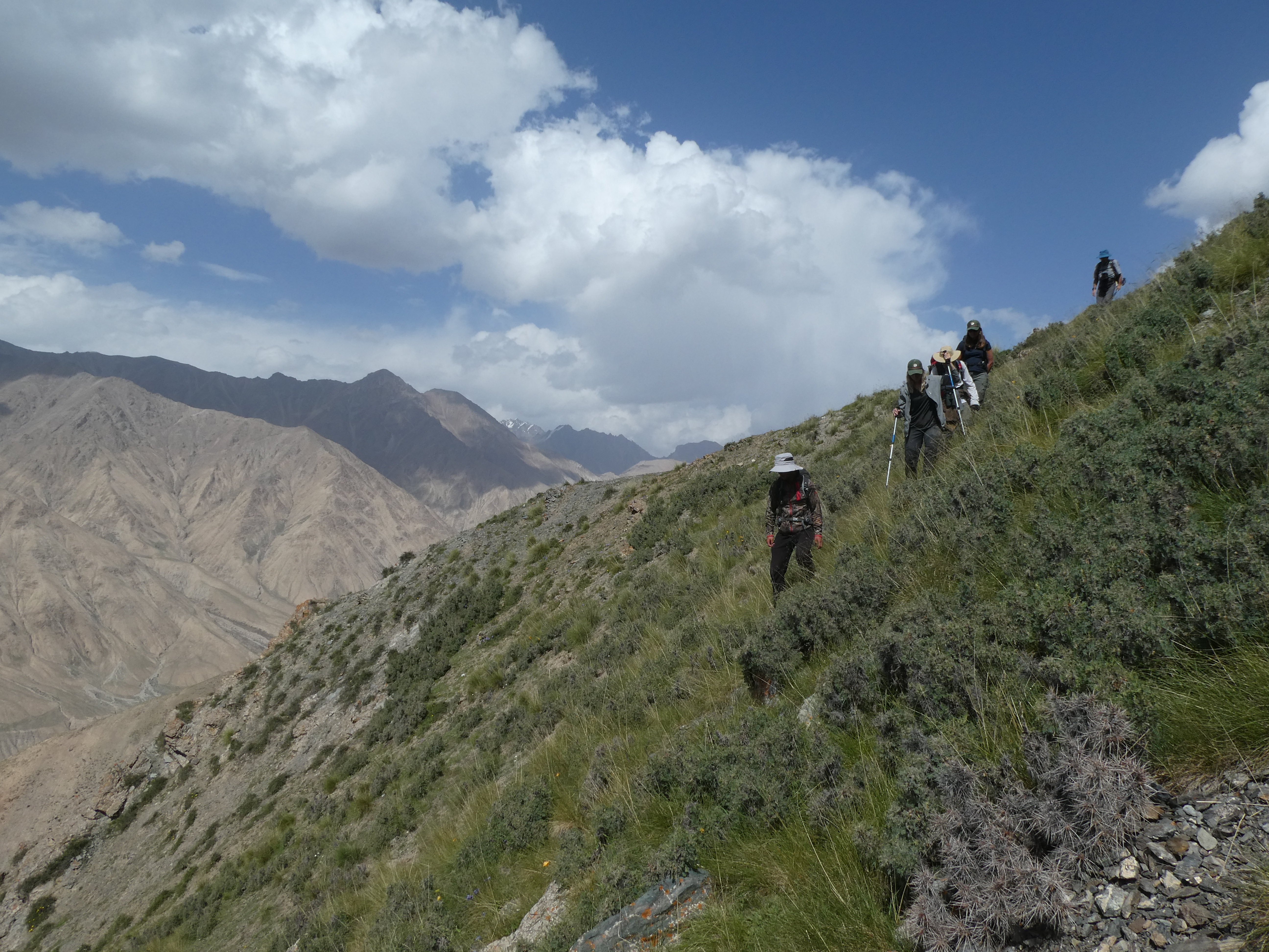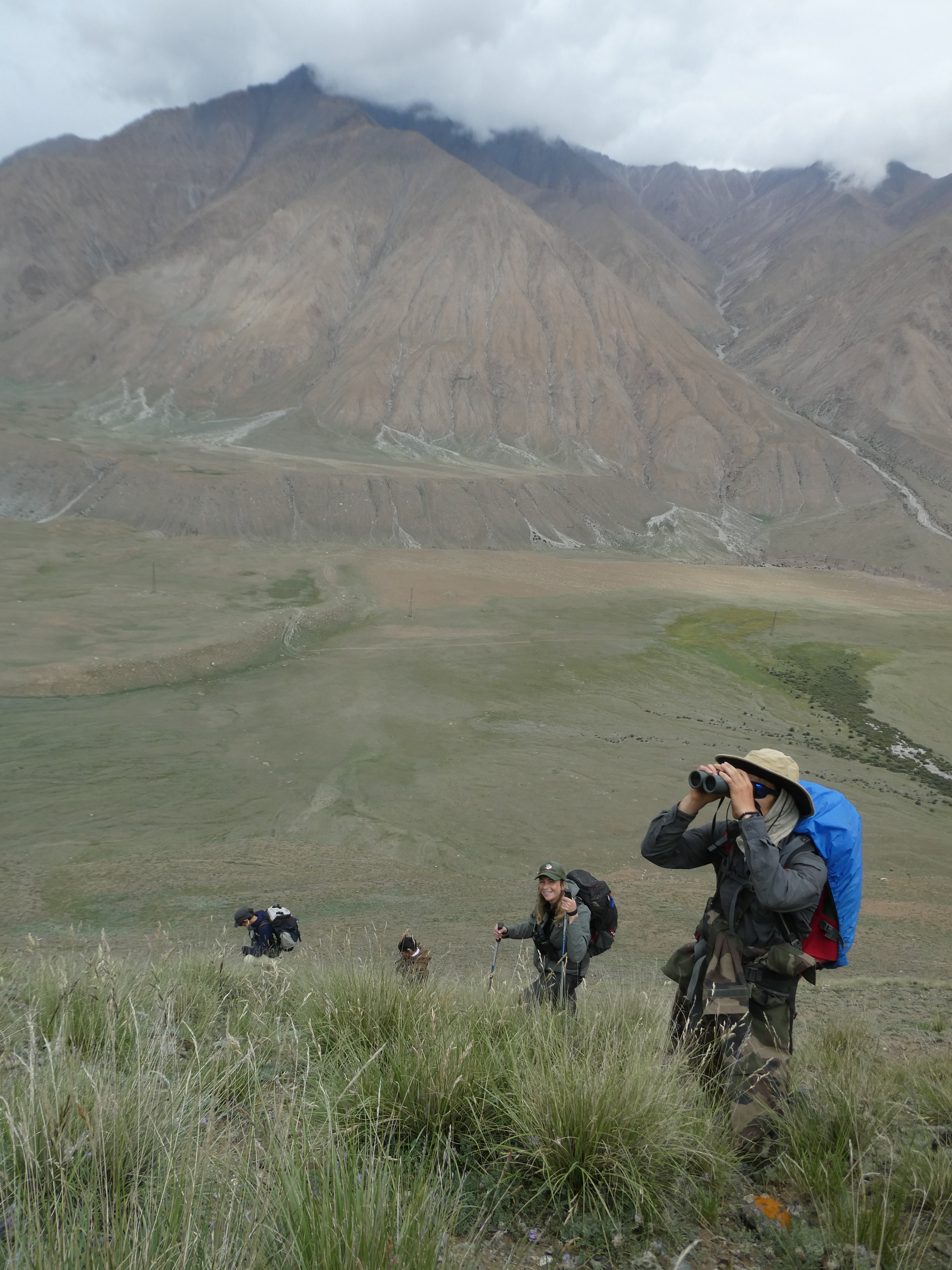 Nous partons pour notre premier transect : ce sera tous ensemble sur la crête de Sirdibaï où nous découvrons de nombreux grattages de la fameuse panthère des neiges et des fèces (excréments) de loup. Anne-Lise nous explique comment identifier les divers indices de la faune, sur quels détails s’attarder, etc.