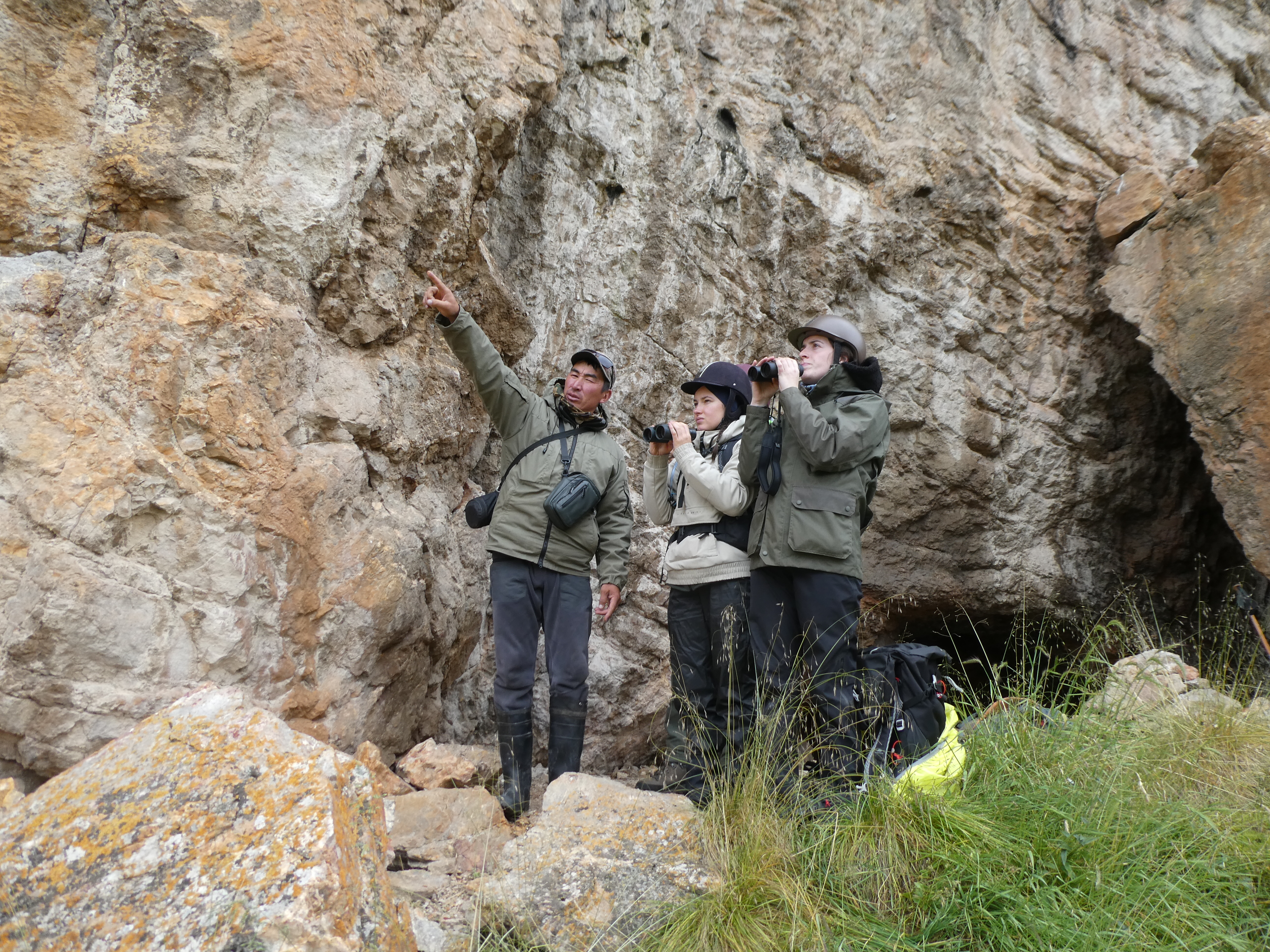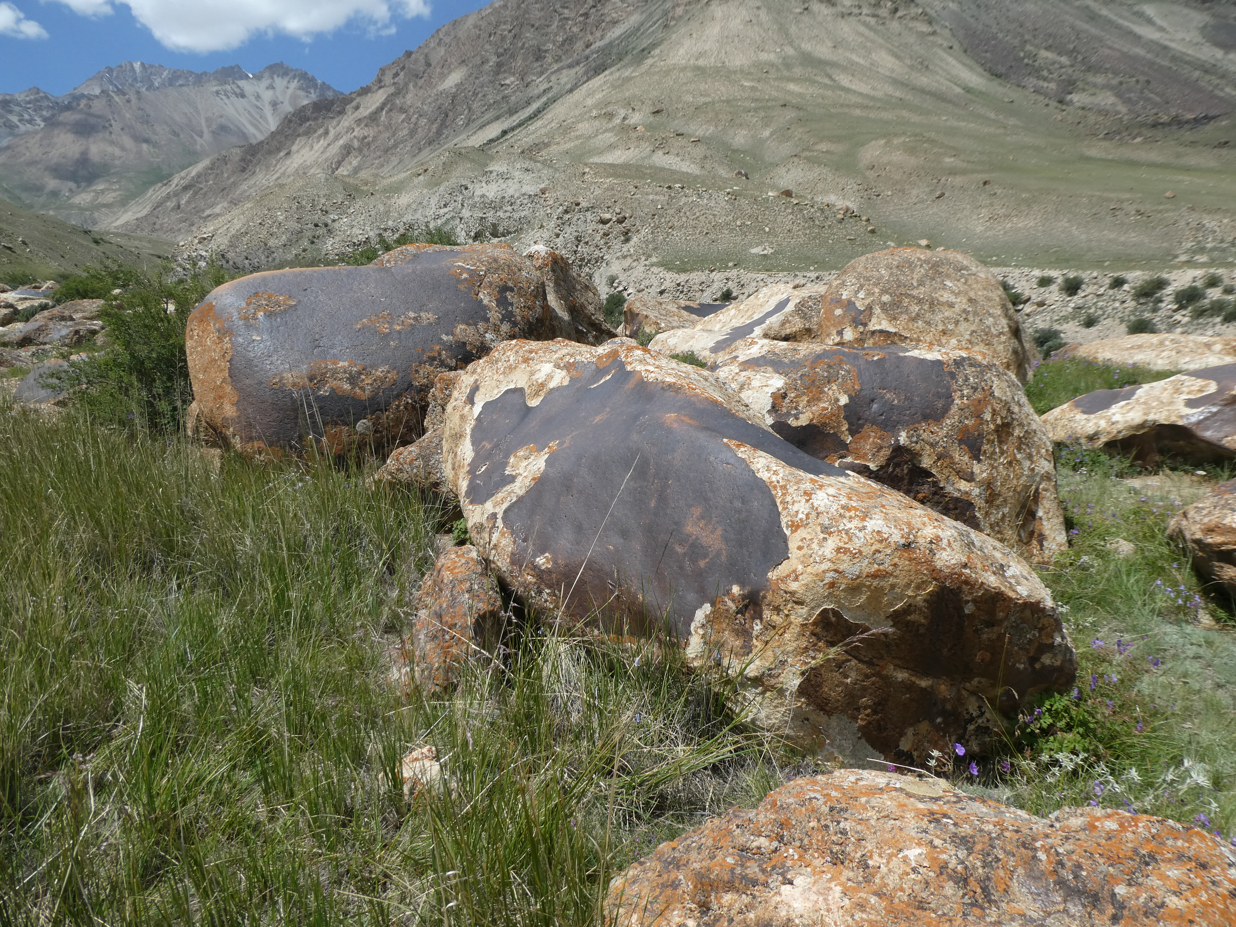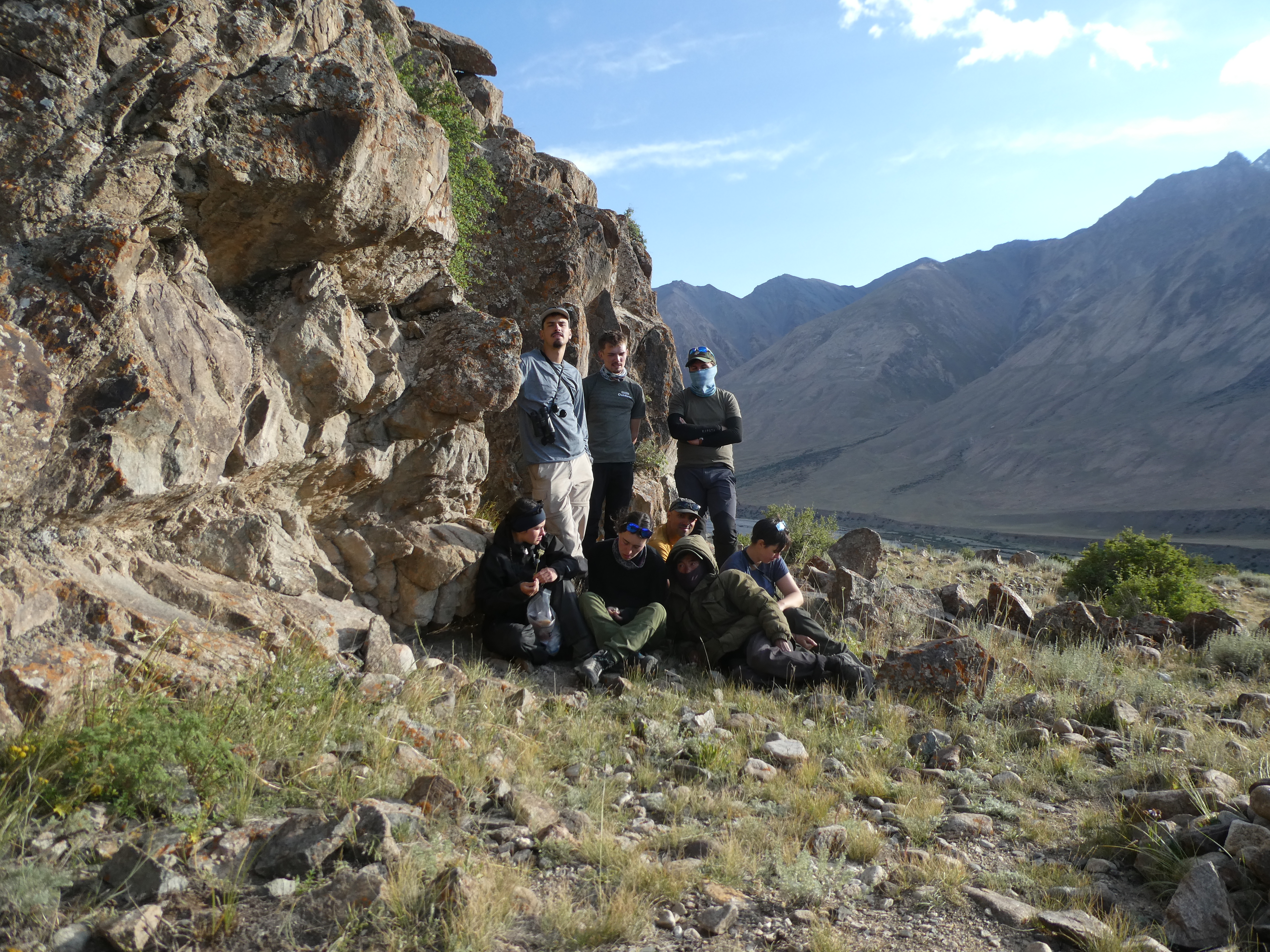 Ce matin après la séance d’observation Maliko, Sarah, Joki et Anne-Lise remontent dans le vallon de Jaman suu pour changer le piège photo qui a surexposé l’année précédente. Pendant ce temps le second groupe part découvrir les pétroglyphes de la vallée ! Ces gravures rupestres ne sont pas si anciennes, elles dateraient de la route de la soie et représentent souvent la faune locale (bouquetin, cerf, panthère, etc.), des scènes de chasse et des divinités (dieu soleil).
