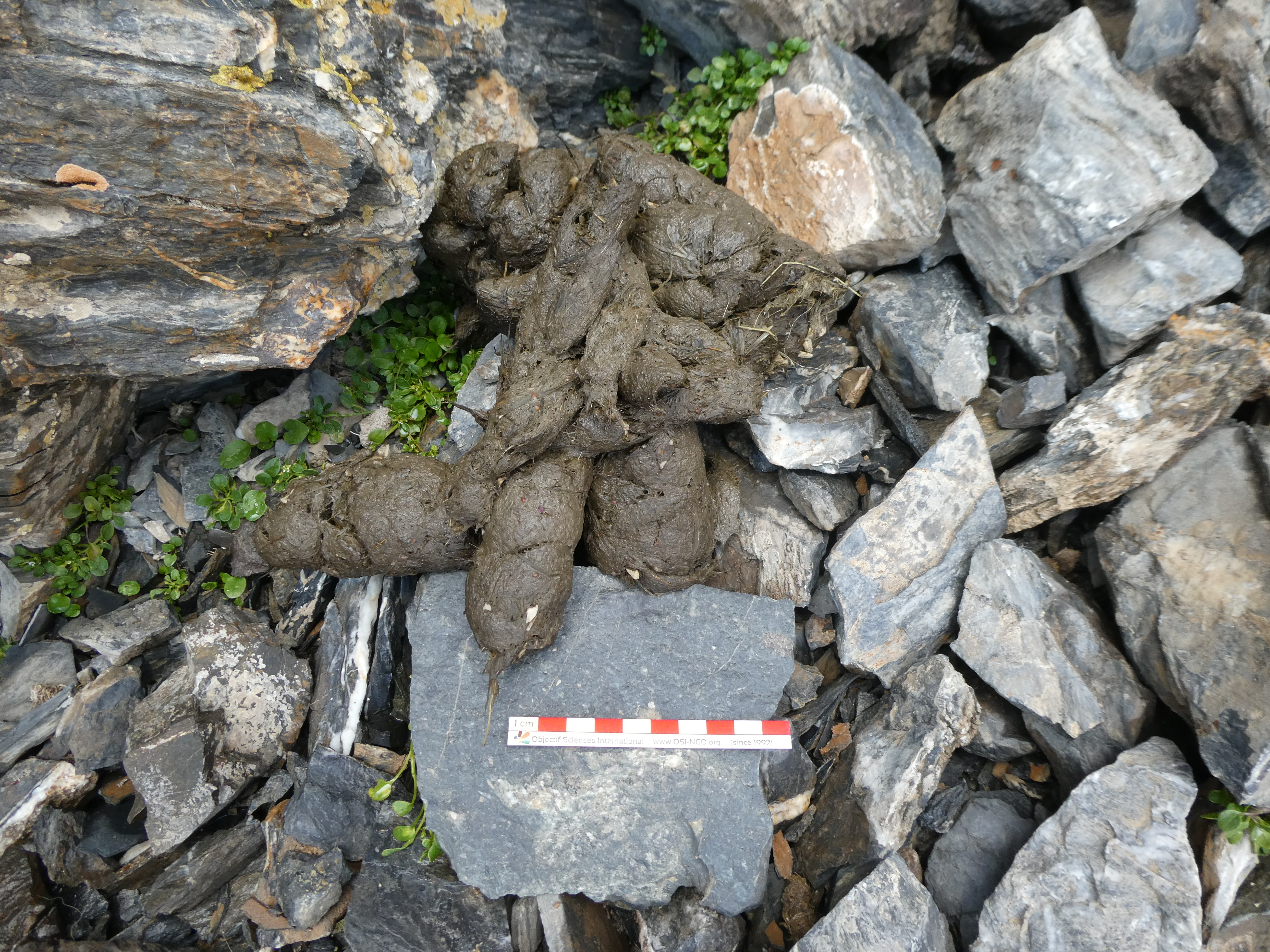 Nous partons pour un petit transect au pied des barres rocheuse, où nous observons de nombreux indices d’ours : des couches, une piste dans l’éboulis et des fecès (dont une énorme et très fraiche !).