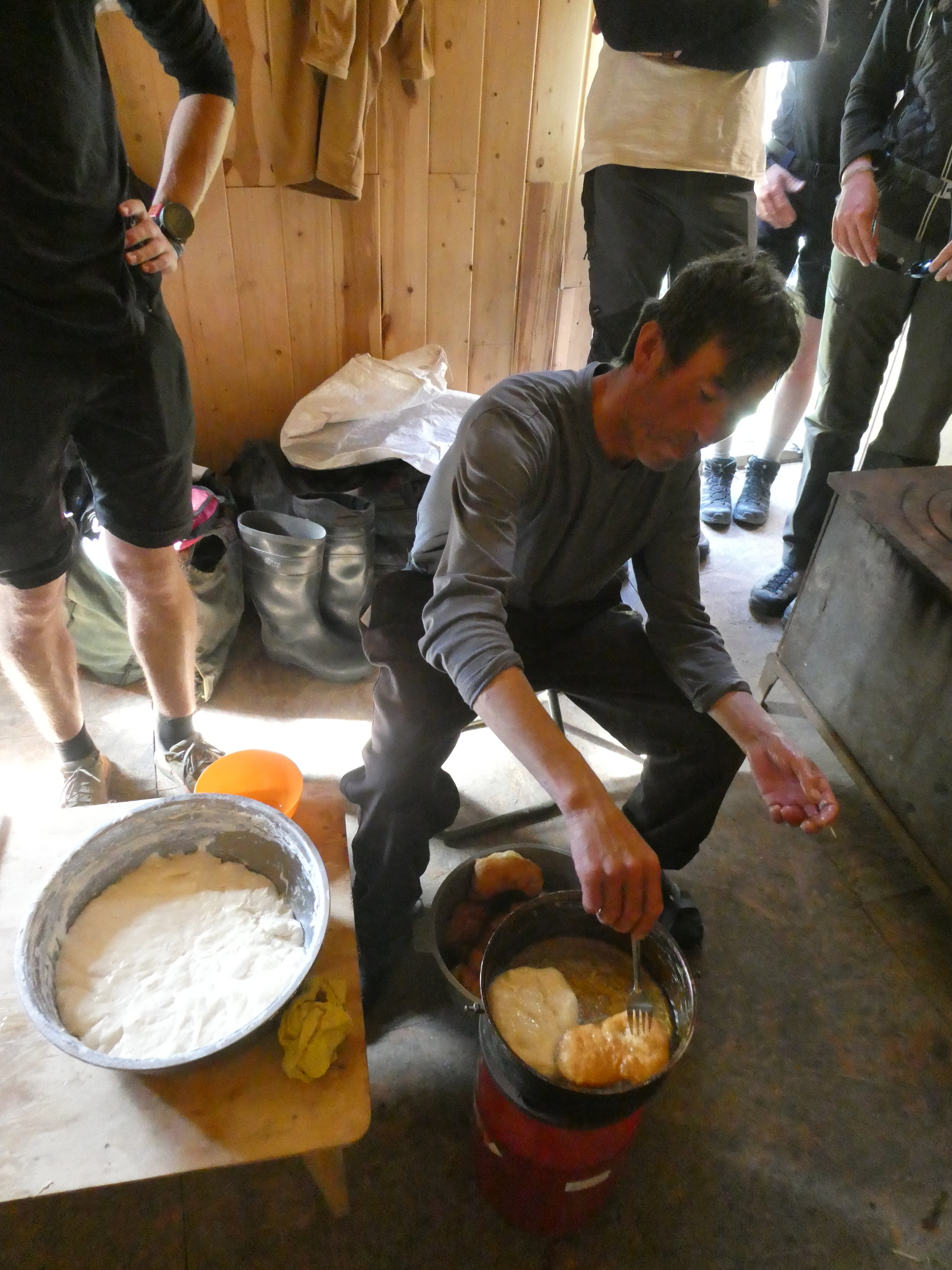 Ludo et Tinchtik, toujours au rendez vous, nous concoctent du pain frais au camp. Nous nous régalons d’une miche chaude, les doigts engourdis par la neige qui tombe et nous a surpris sur le retour.