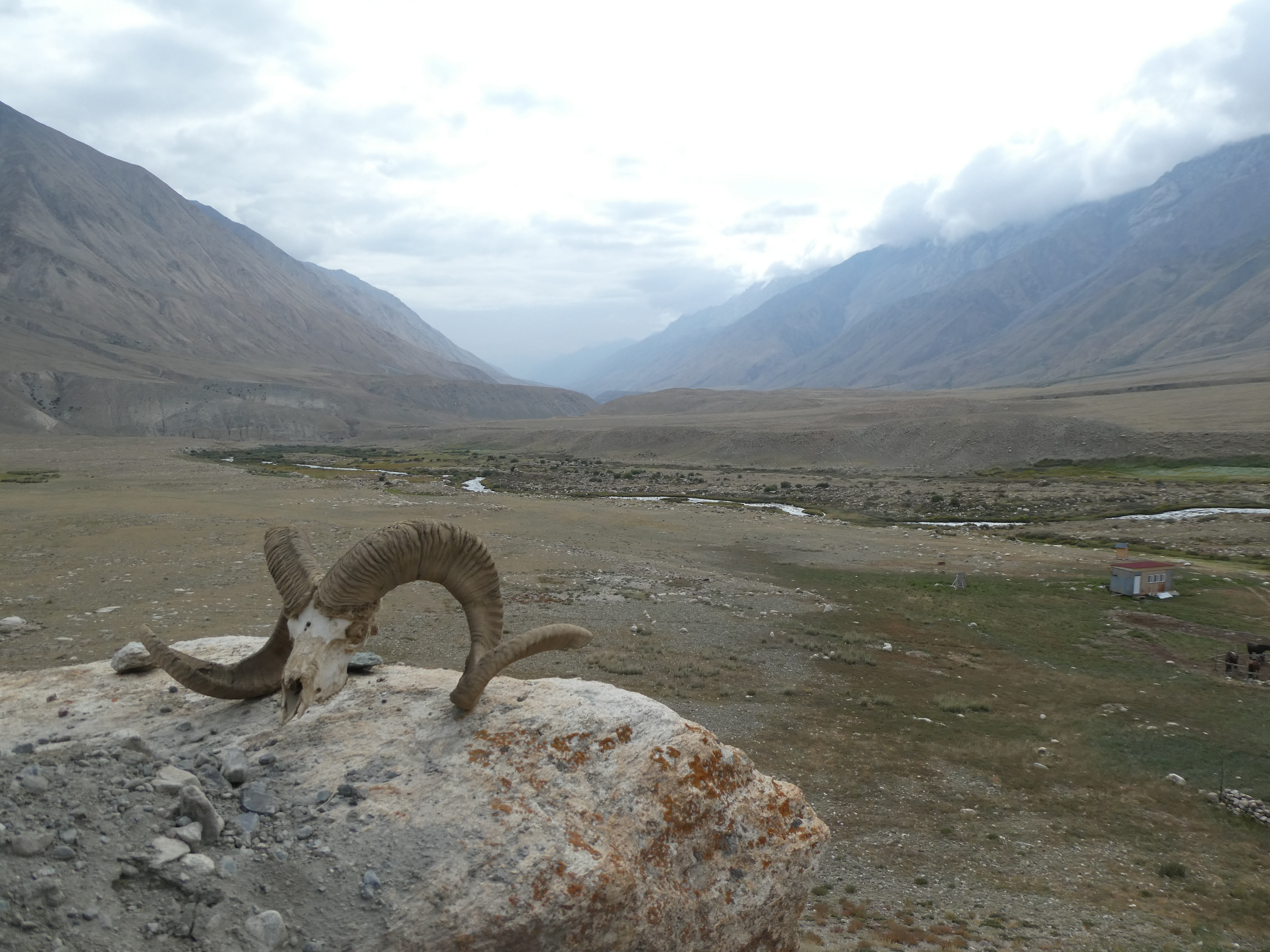 Sur le chemin jusqu’ici nous avons vu un squelette de loup, et relevé un piège-photo montrant plusieurs passages de Panthère des neiges et d’Ours.