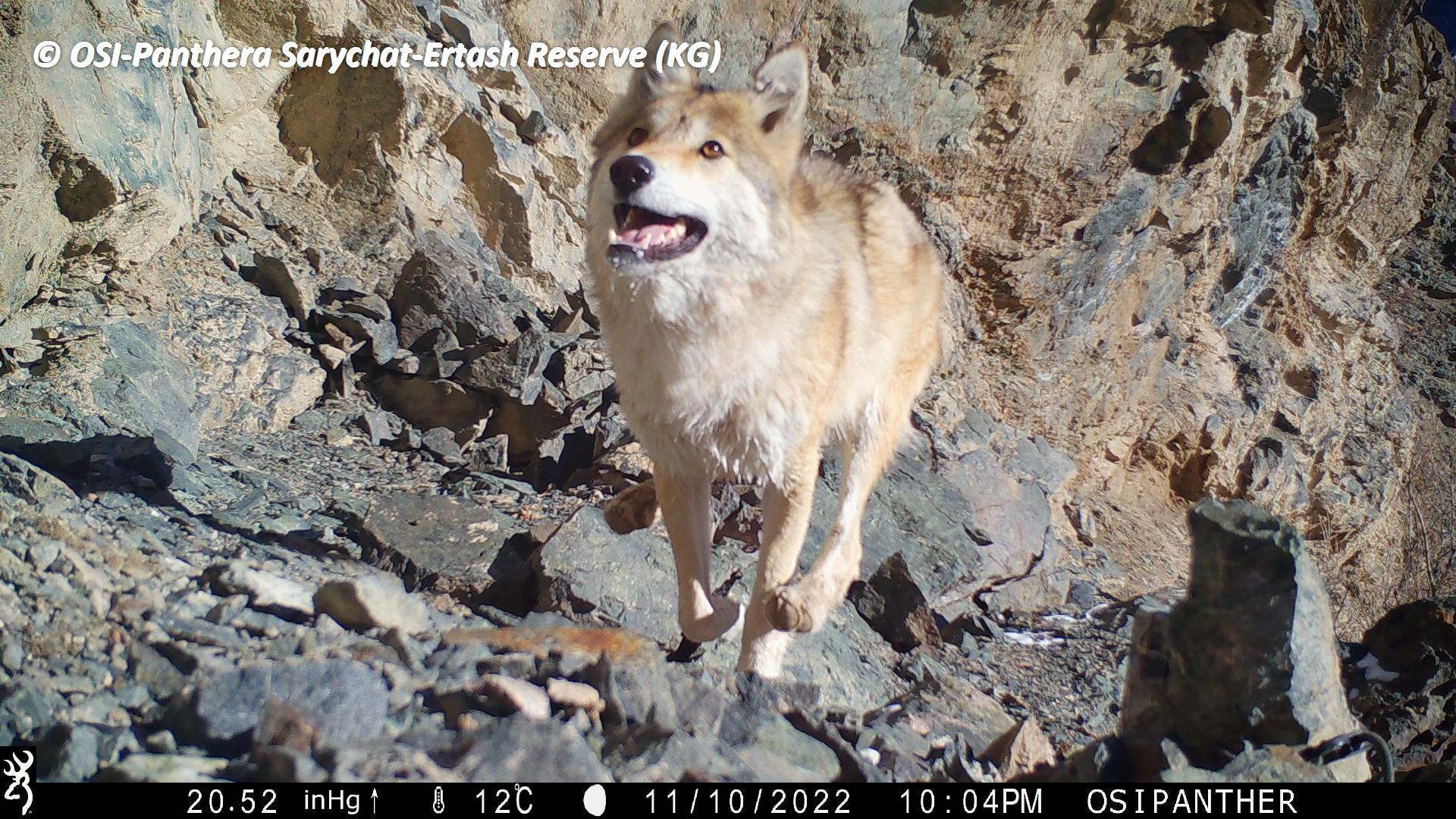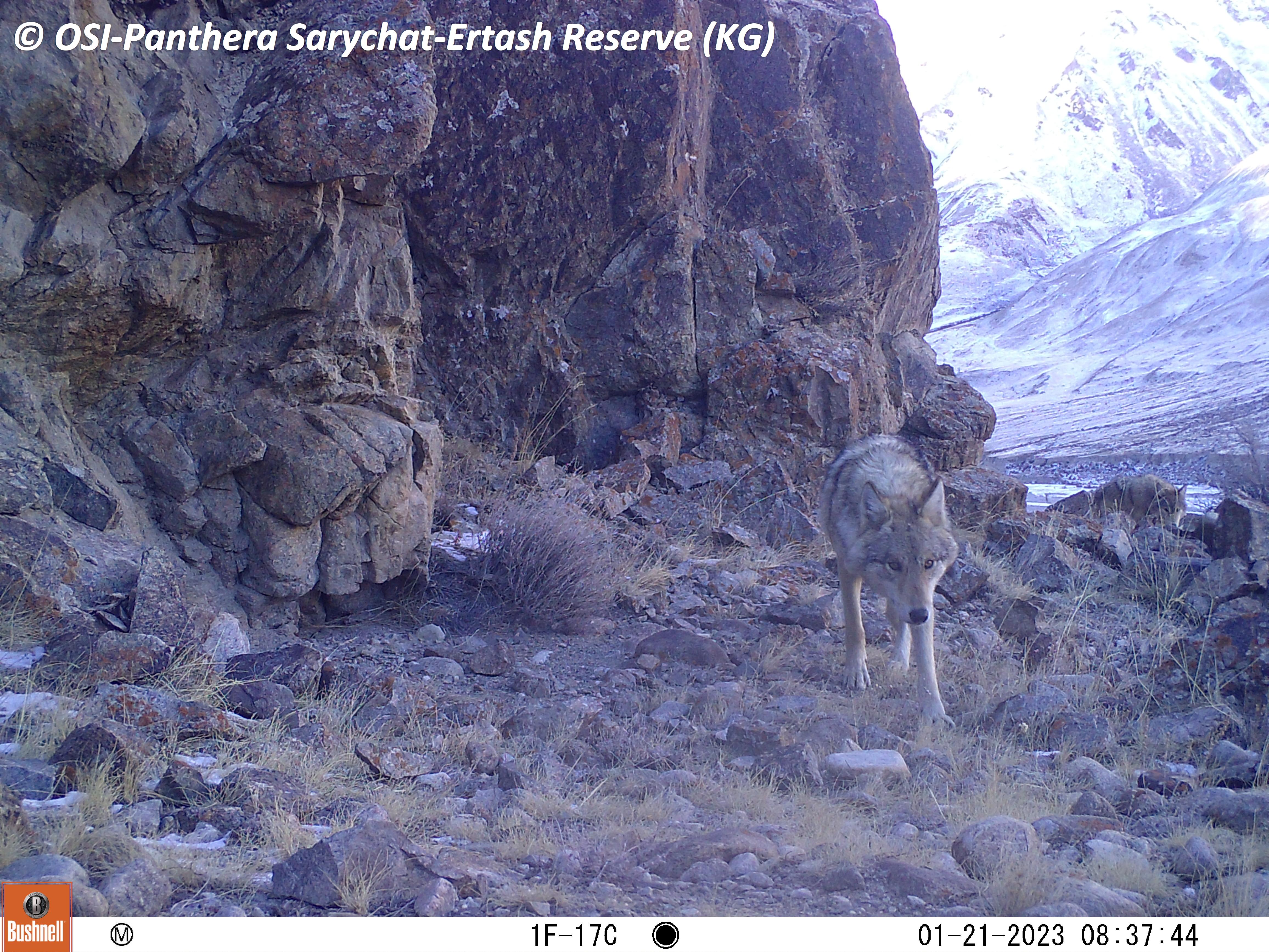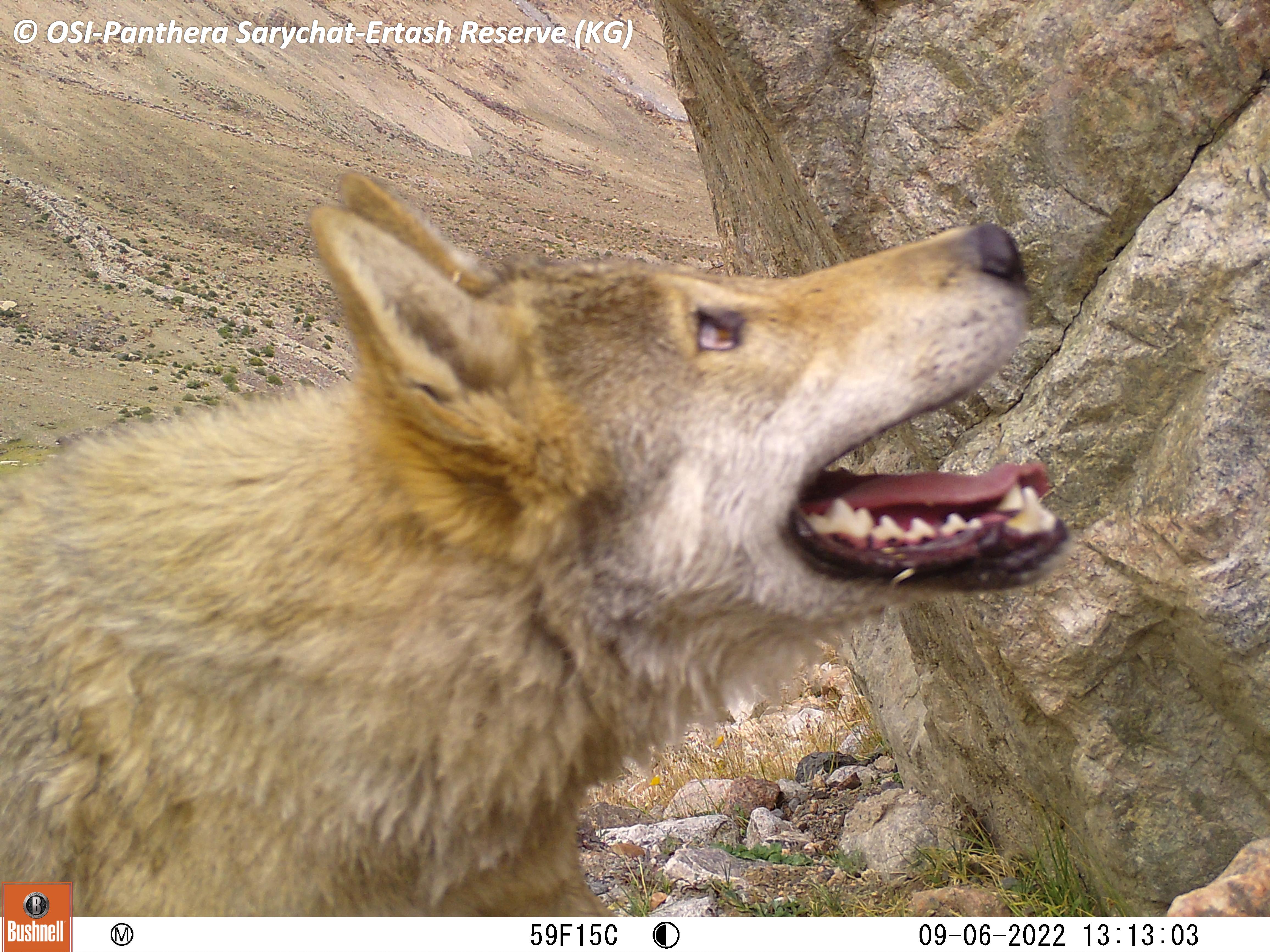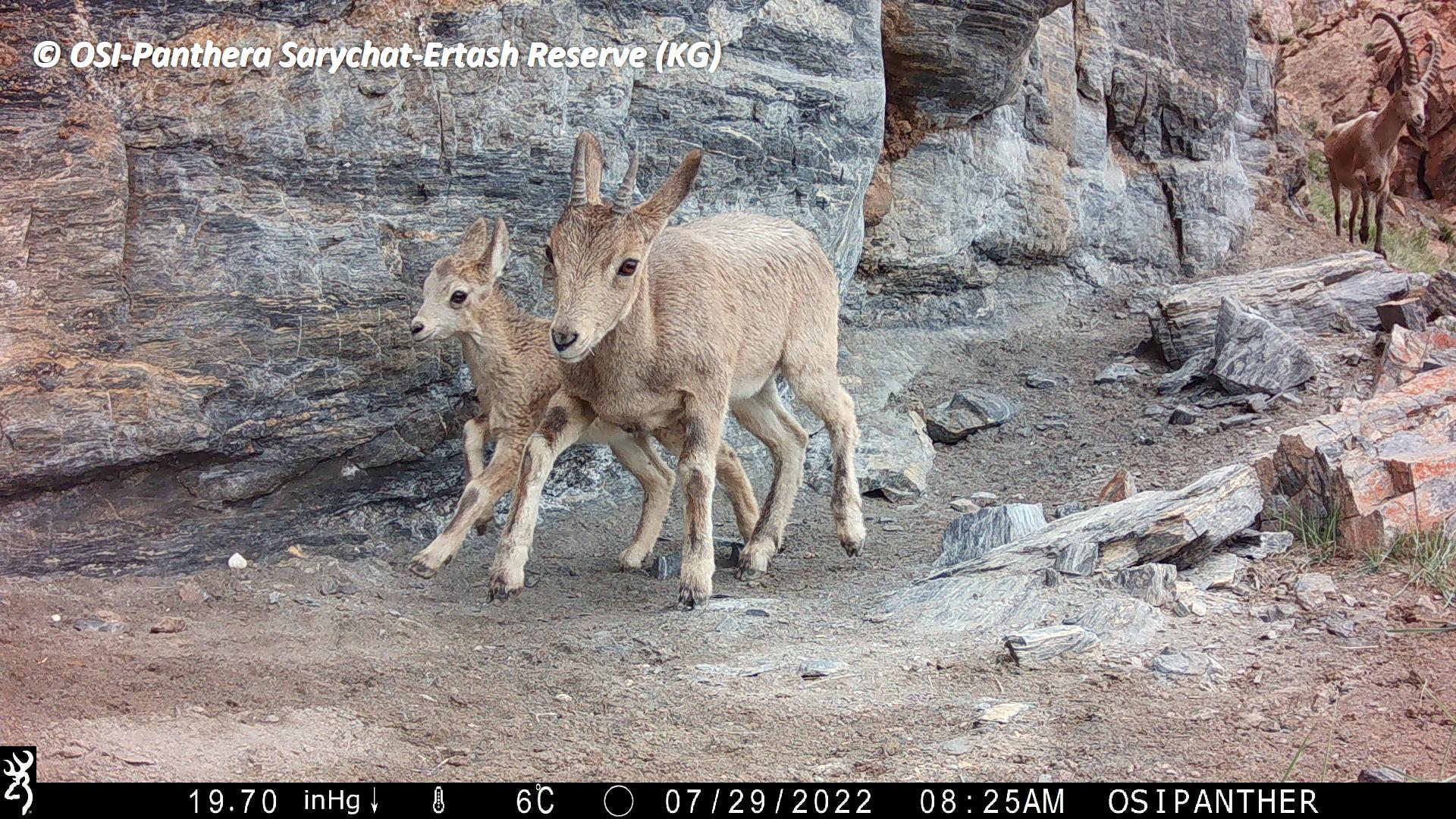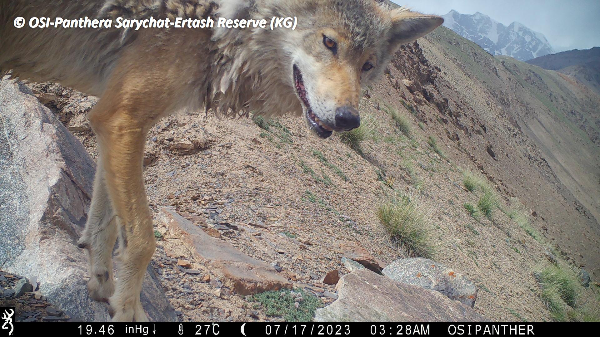 Le premier va relever un nouveau piège Photo à pied un peu au dessus du camp de Jaman Suu, à Kitchi Uch Baïtal. Sur le piège photo qu’ils récupèrent ils observent des photos de loups en chasse sur des bouquetins, ours et panthères dont une jeune portée de 3 juvéniles (rare en général 2) nés en 2022. Donc plutôt des subadultes (+1 an). Ils échantillonnent plusieurs fecès de panthère dont peut être celles de la mère et ses 3 jeunes enregistrés sur le piège photo.