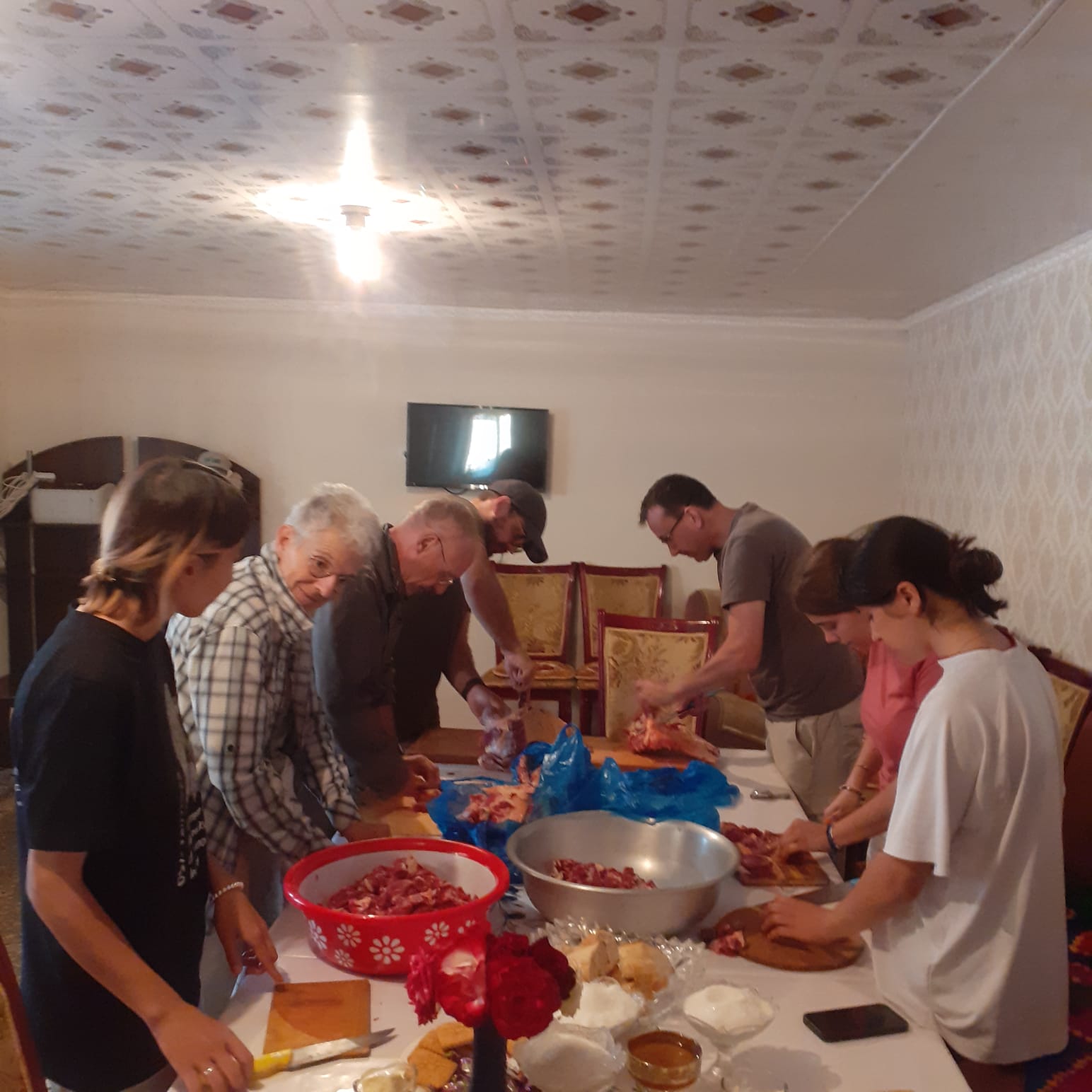 A midi toute l’équipe mange un bon « Ashlan fou », soupe froide d’origine Doungan accompagnée d’un « peroshki », beignet à la pomme de terre et d’un « xashan », beignet frit à base d’oignon et viande, un délice !