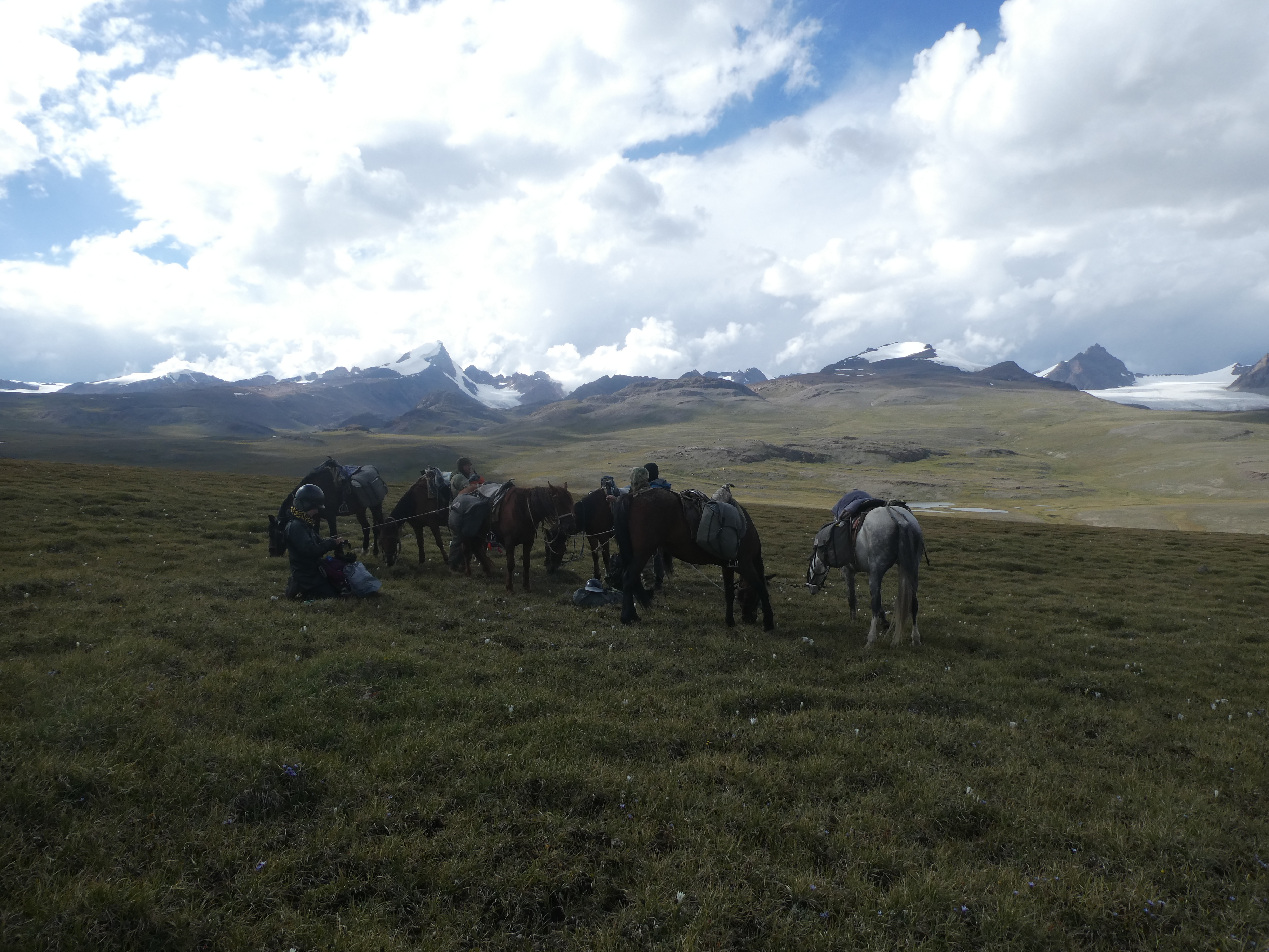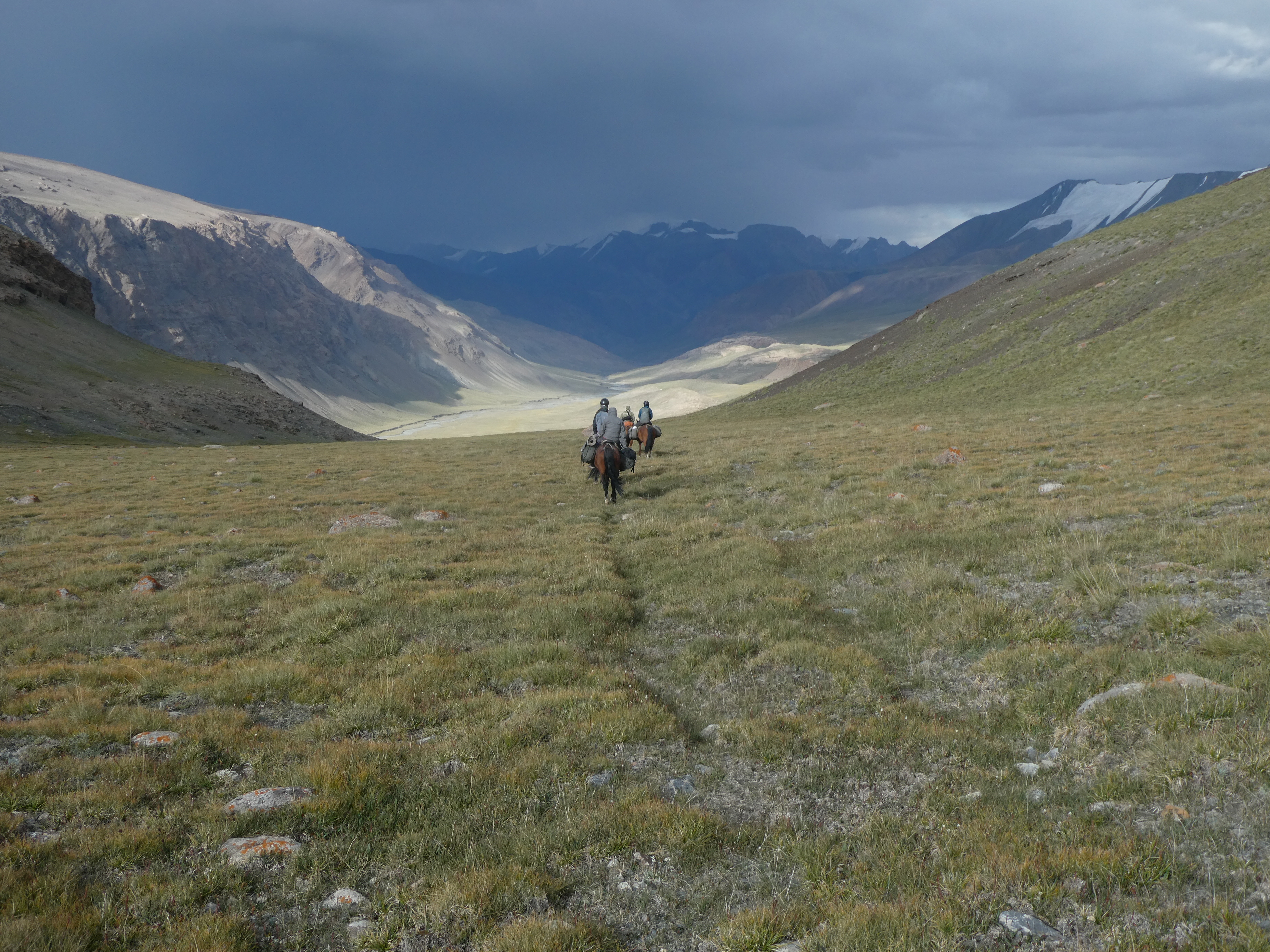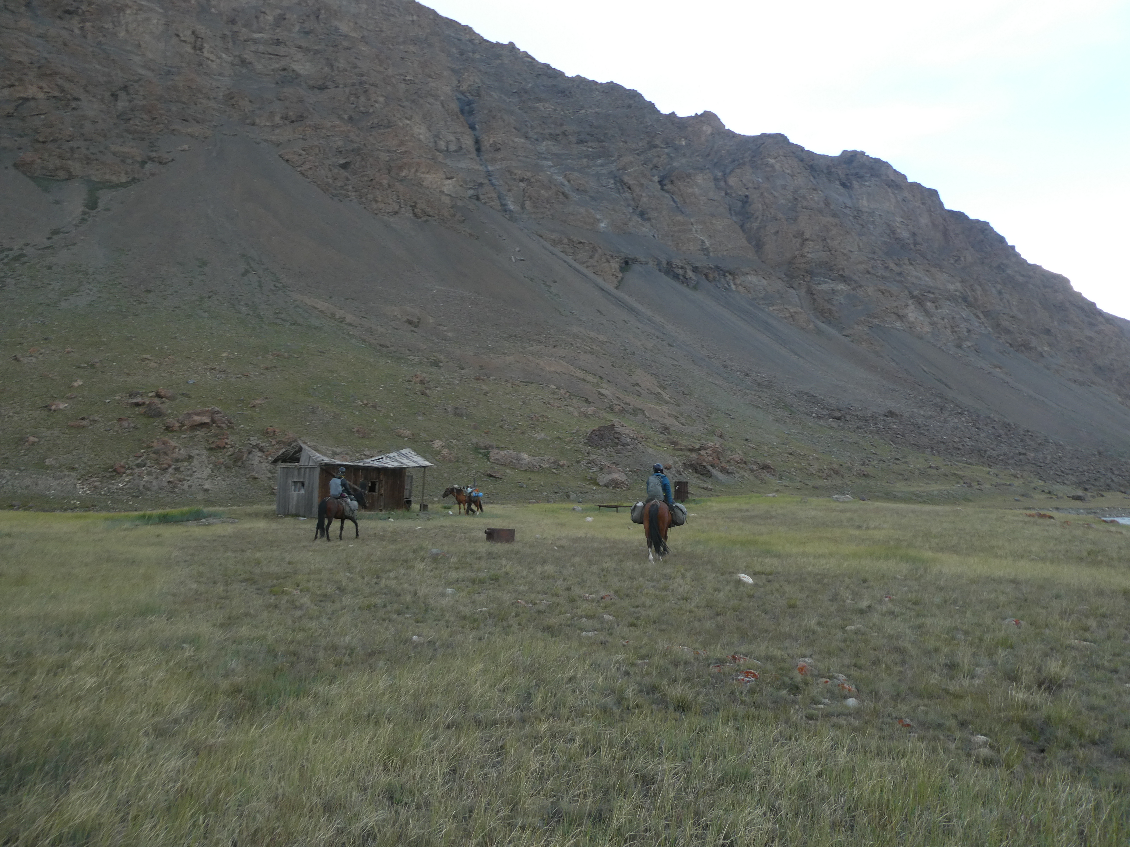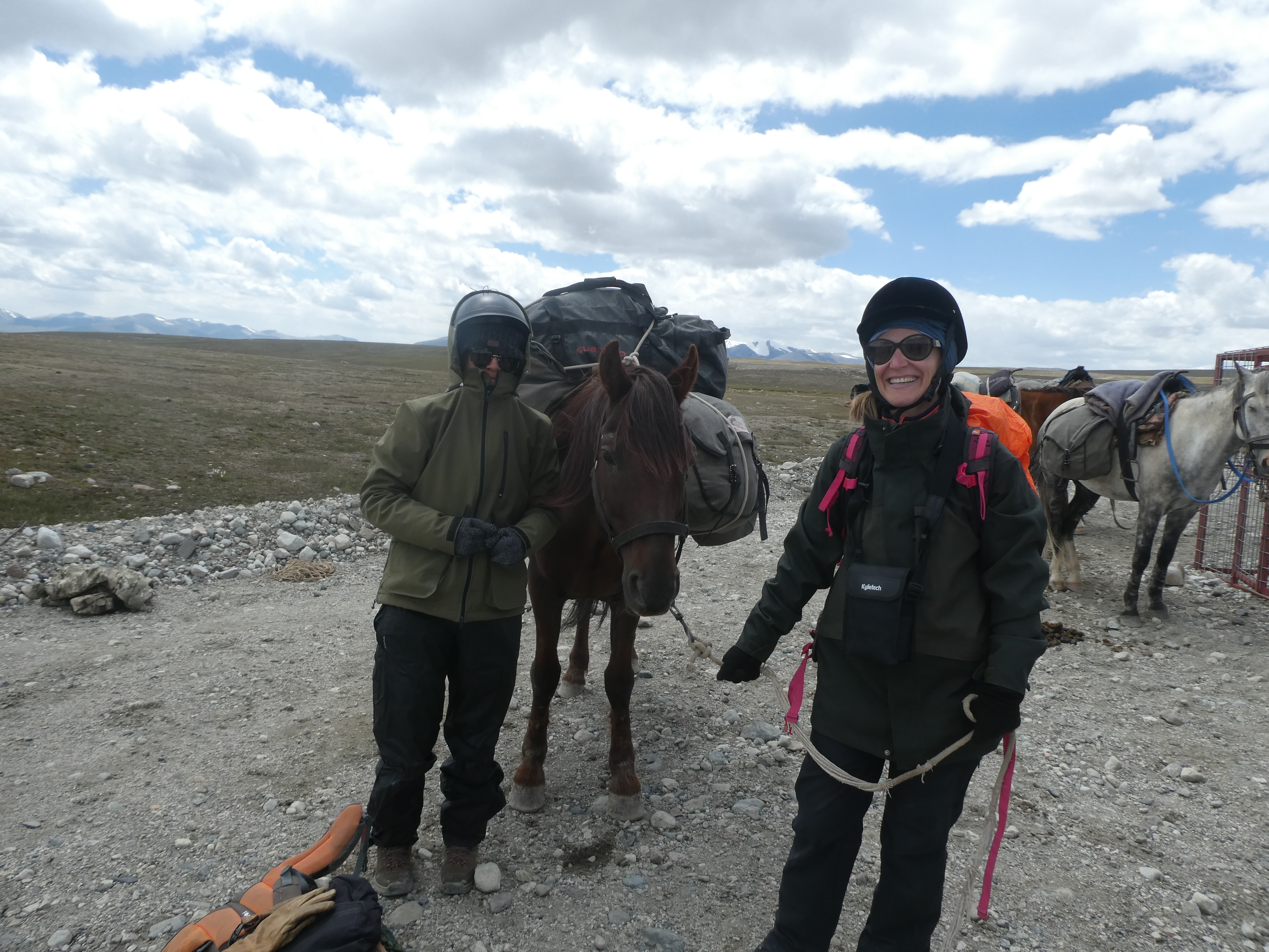 Le groupe se motive quand même à partir vers Bich Jilga relever le piège photographique. Anne-Lise et Ulan nous font un petit cafouillage et se trompent de vallon... heureusement ce n’est pas bien loin a dos de cheval mais le groupe est trempé !