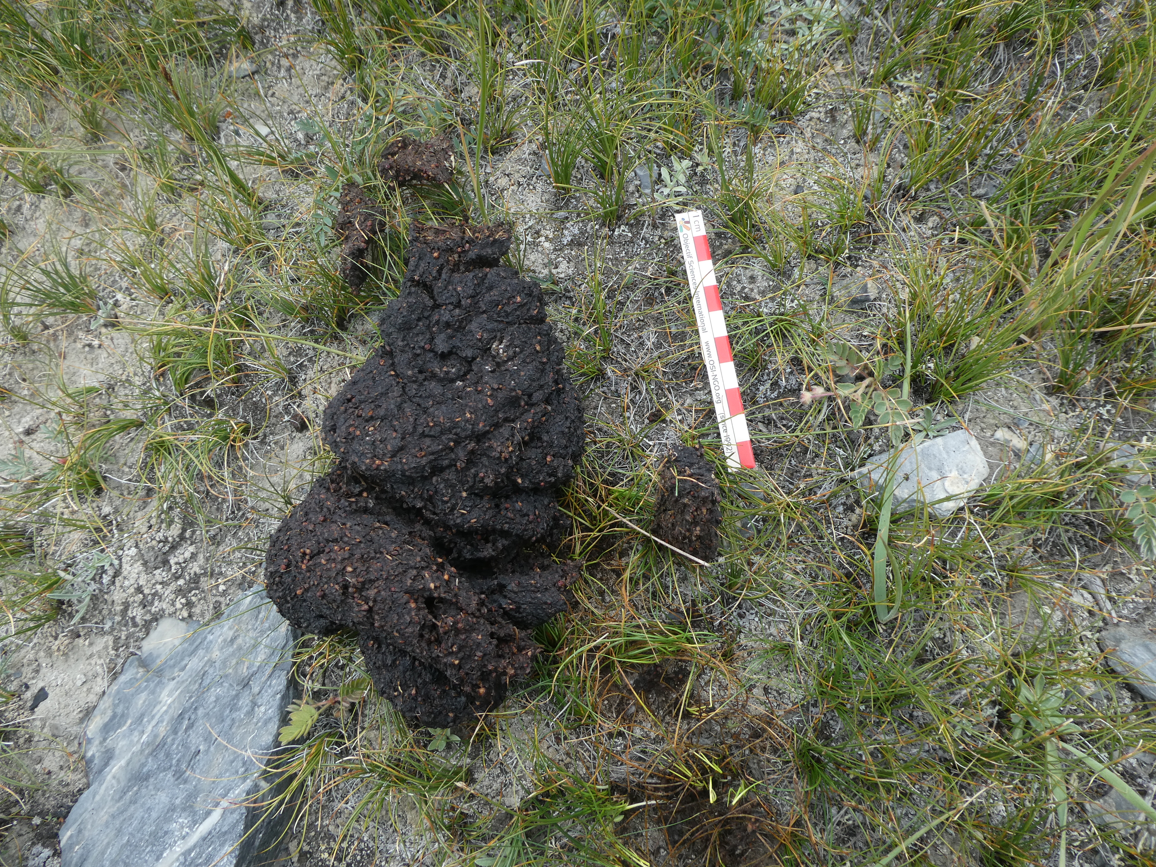 Pendant qu’Oemourbek part changer la carte SD de Jaman suu (il les rejoindra dans la matinée), le groupe part faire le loooooong transect d’Utch Baital avec 30 min d’approche à cheval. Il y a peu d’indices si ce n’est 3 fèces fraiches d’ours contenant de l’herbe (au printemps l’animal broute les prairies) et une contenant les restes d’une marmotte.