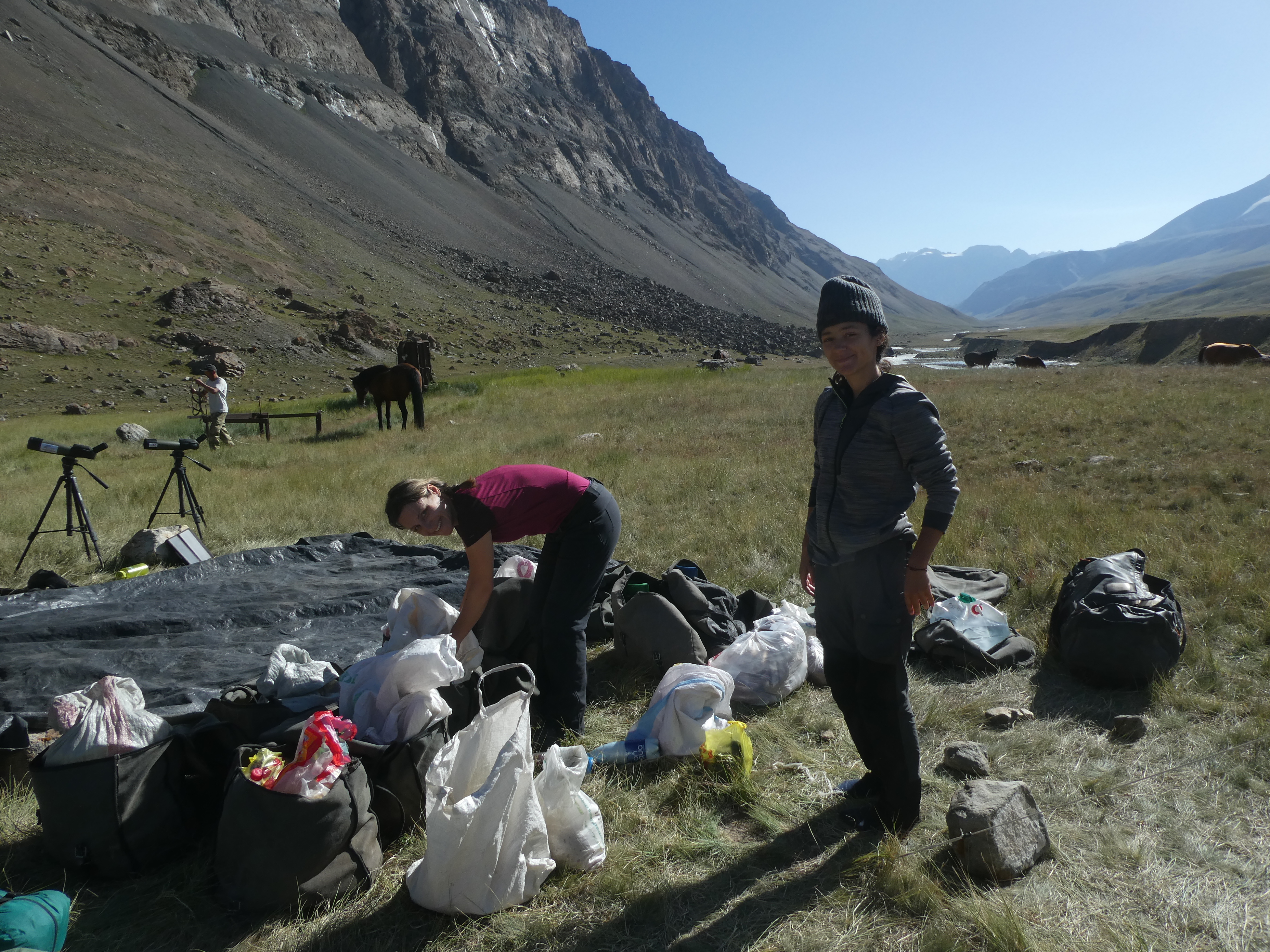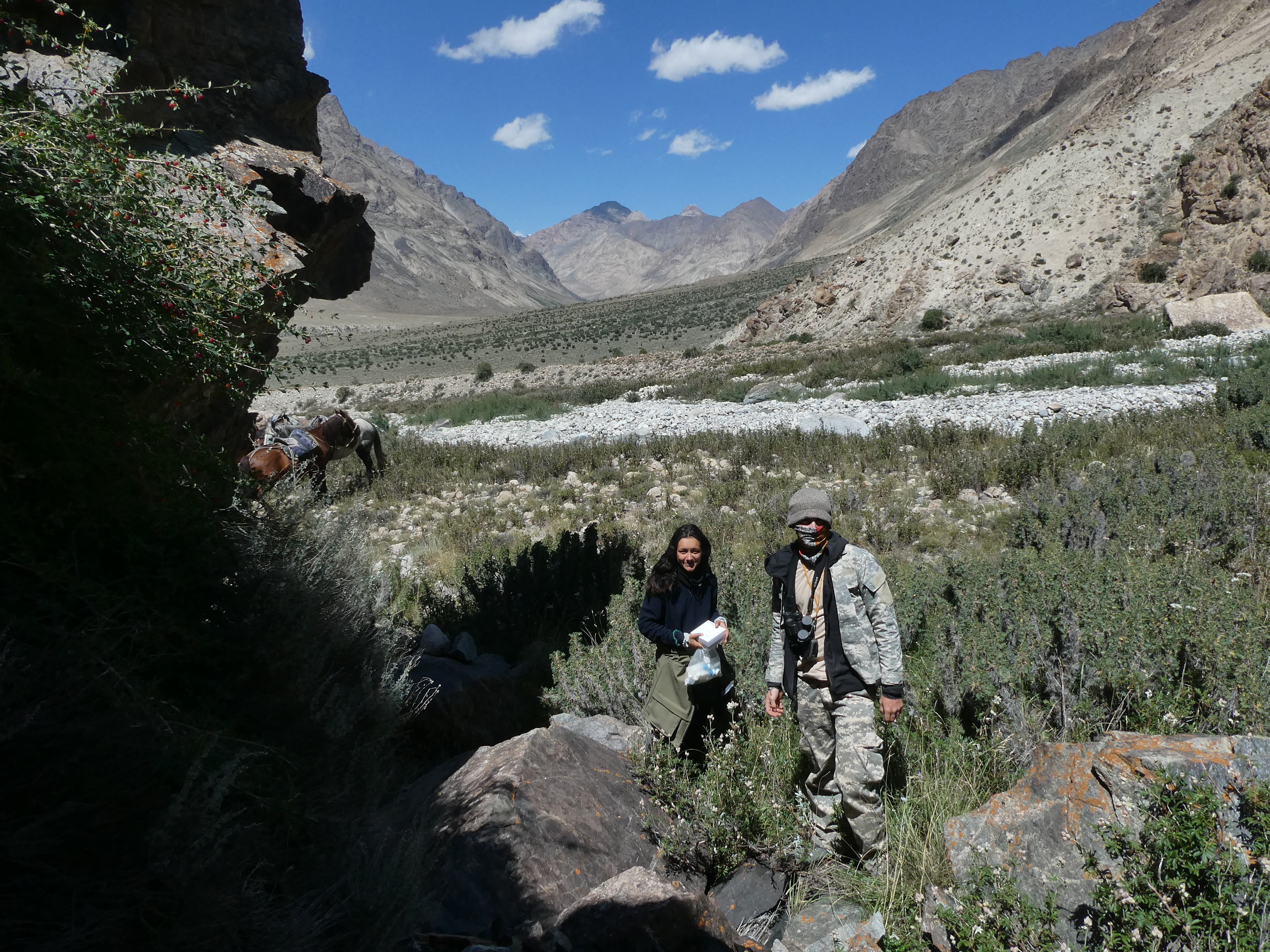 Le groupe rentre à cheval jusqu’à la Cascade puis Anvar ramène les chevaux et le groupe en profite pour faire un second transect en fond de vallon. C’est l’occaion de relever un second piège photo à l’entrée du vallon qui a quant à lui été détruit par des ours mais fonctionne encore ! Il a enregistré de nombreux ours, mais aussi des panthères. L’université de Kyoto a un piège photo sur le même spot.