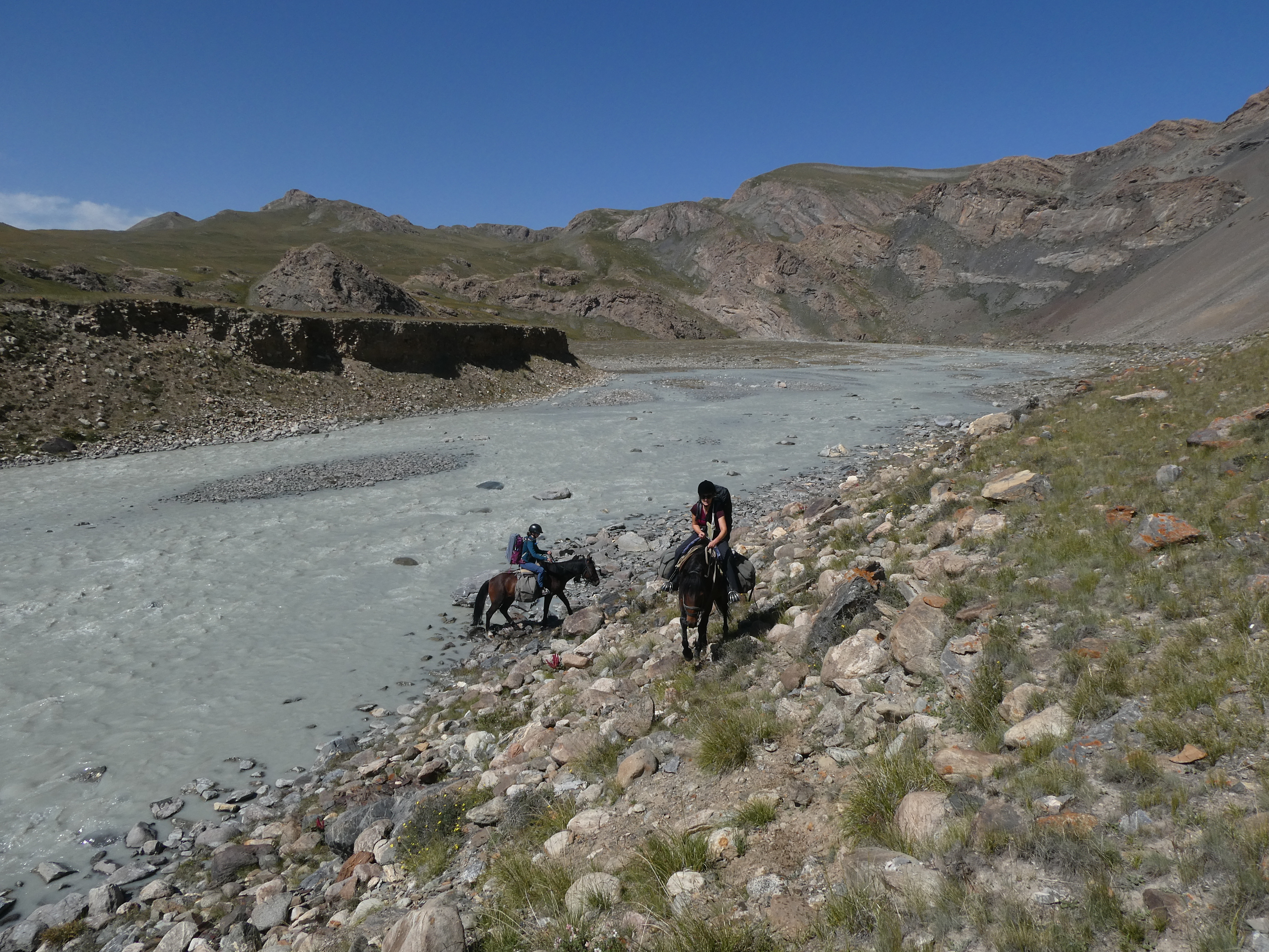 Ce matin nous partons vers un nouveau camp, celui de Chomoi. Pour cela nous allons devoir traverser la grosse rivière de l’Ertash. La couleur n’est pas encourageant, elle est noir mais le niveau est bas... c’est surprenant !