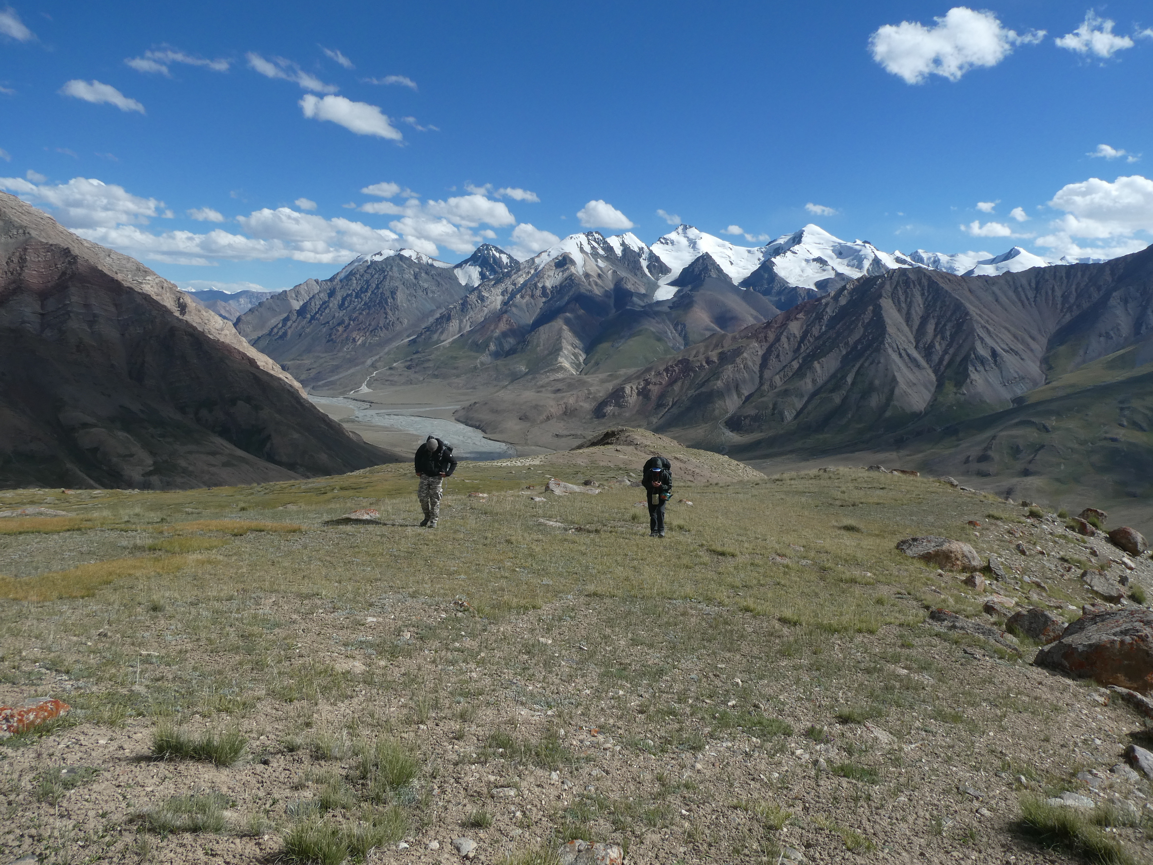 Le groupe qui s’est trouvé bloqué hier part explorer le vallon de Kitchi Bordou. A peine ont-ils traversé la rivière qu’ils observent 5 loups qui partent de la rivière et fuient en direction de la crête où nous dormions la veille ! Quelle observation, dommage que l’autre équipe ne les voit pas !