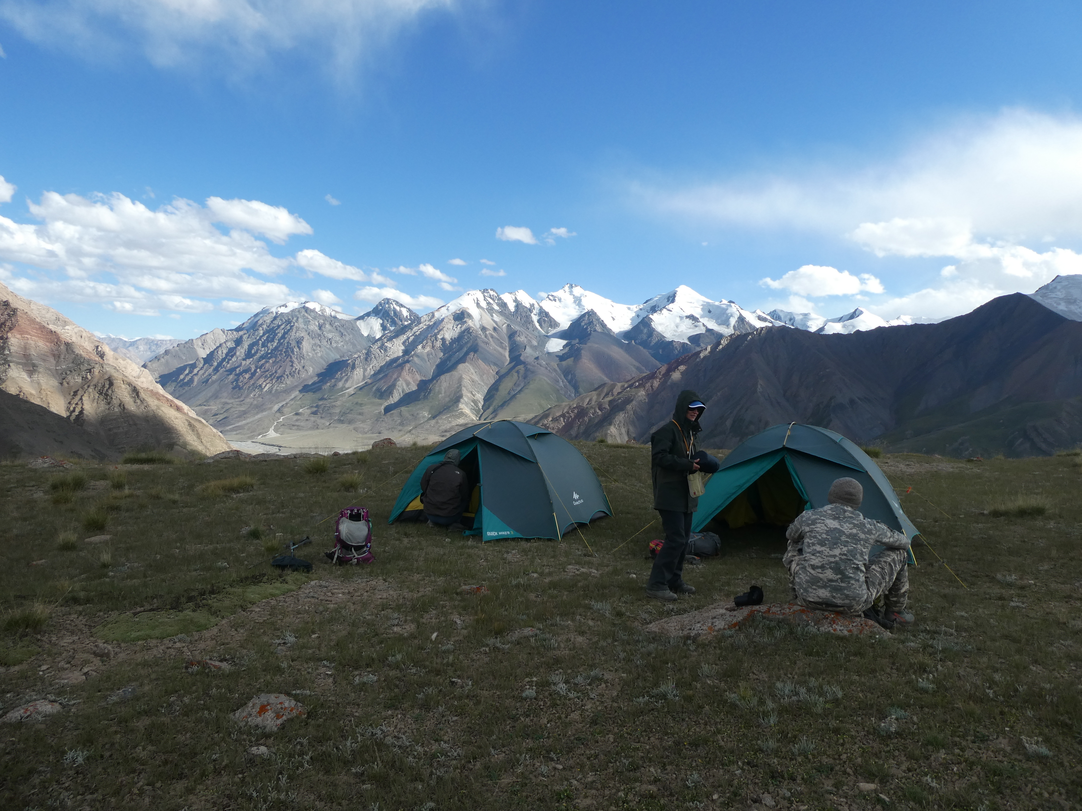 Nous étions plutôt bien chargé pour cette ascension et pour la première fois la nuit se fera en crête, à mi-transect, à 3750 m sauf pour Askat et Adinai qui sont restées au camp. Nous avons pris 2 petites tentes et heureusement car nous essuyons quelques averses de pluie et neige !