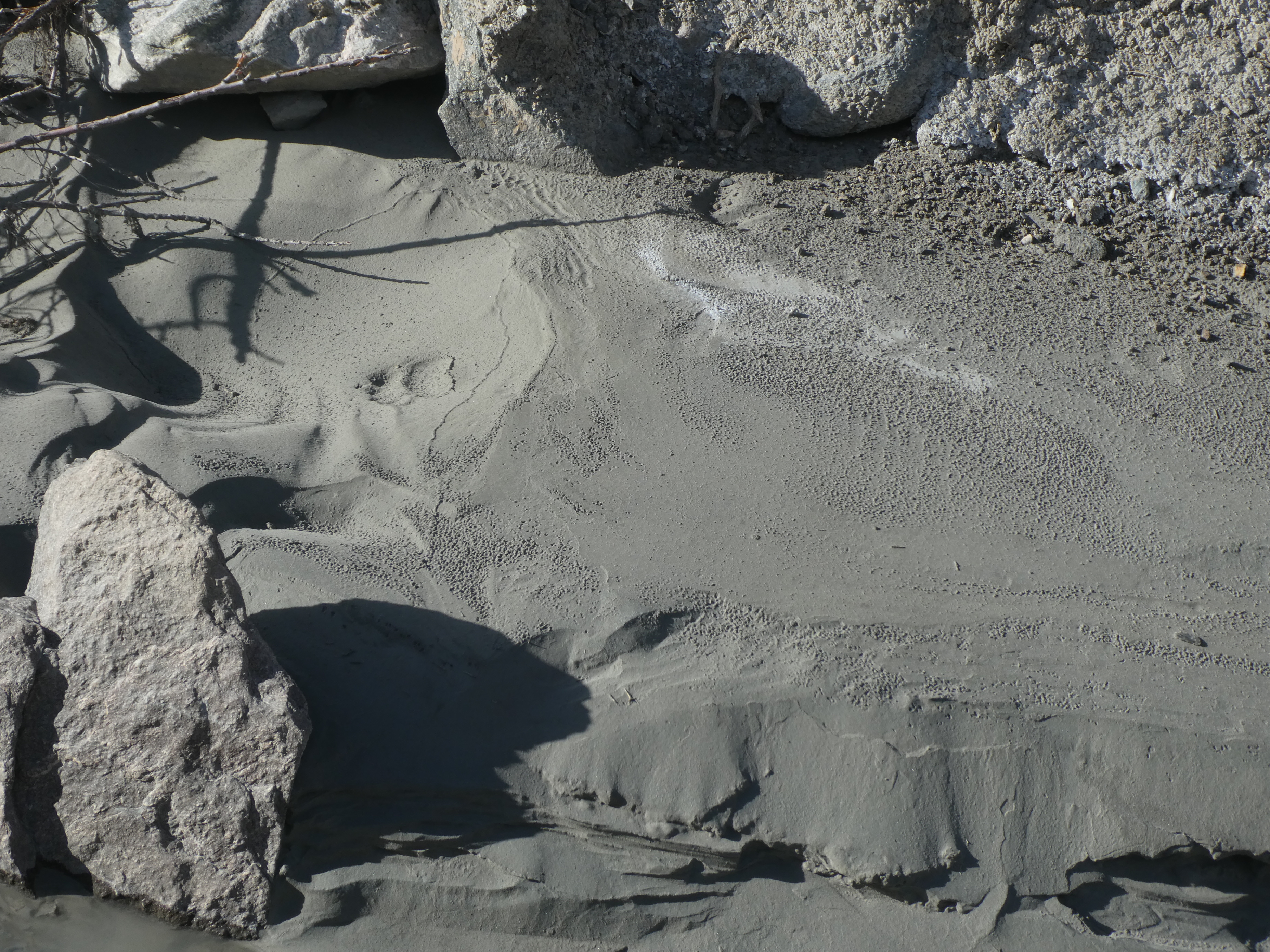Le piège photo a révélé hier des passages de Panthère des neiges. Nous repérons aussi une piste de Panthère lors de nos investigations, enregistrée dans la boue.