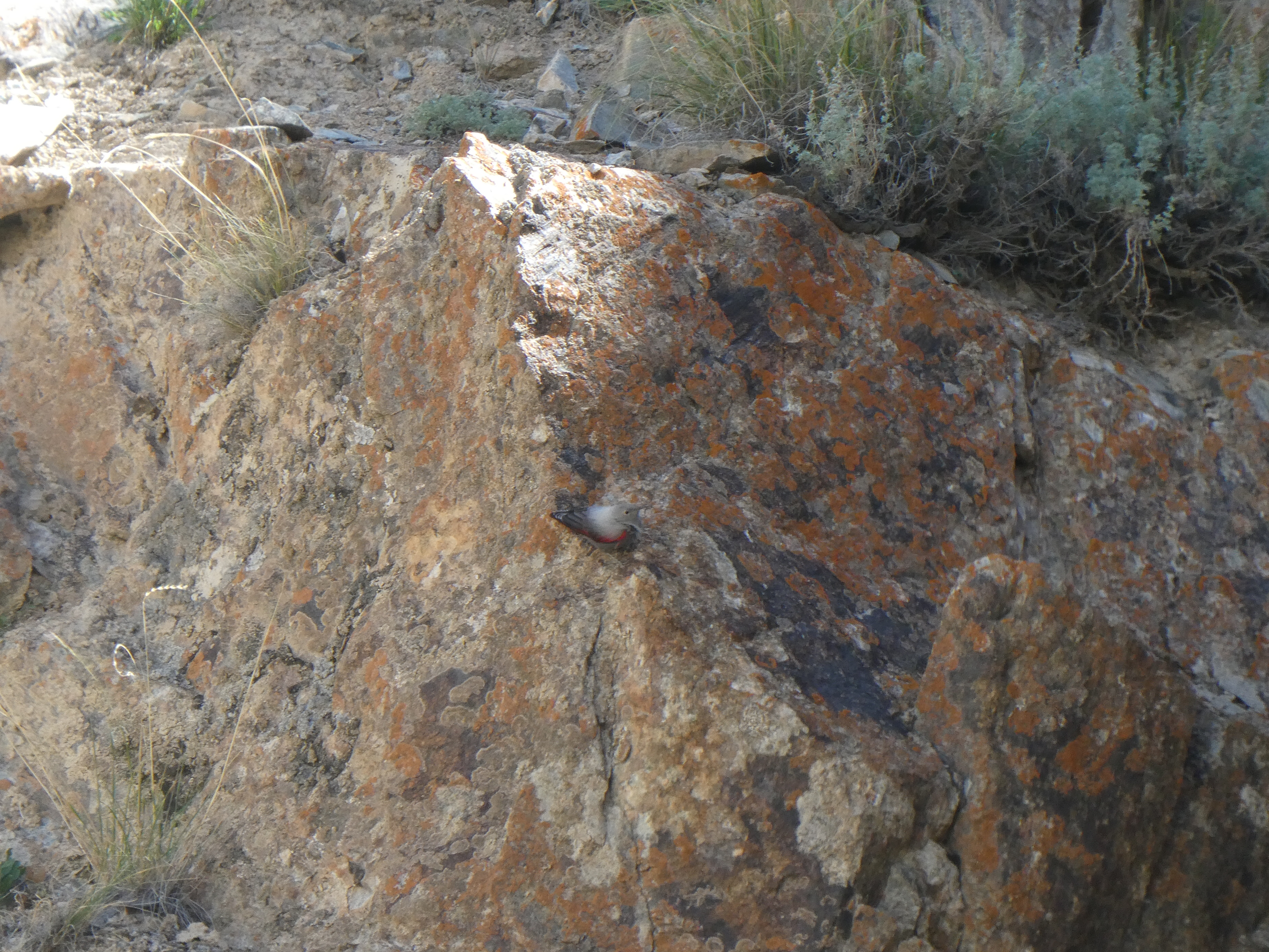 Nous faisons aussi une belle observation lors du transect, cette fois c’est un petit oiseau remarquable, le tichodrome échelette (Tichodroma muraria). Seul représentant de son genre, cette espèce vit sur les parois rocheuses abruptes et possède des ailes rondes, d’un rouge vif reconnaissables entre milles. Il est passionnant de le voir évoluer sur la parois tel un grimpeur hors pair où il se nourrit de toutes sortes d’insectes, araignées et autres invertébrés qu’il extirpe des crevasses avec son long bec recourbé.