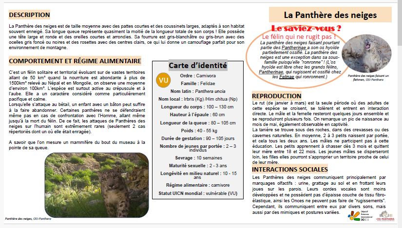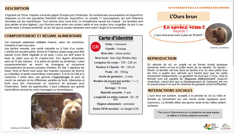 Vous y trouverez un maximum d’informations telles que la description de l’espèce, la distribution, l’écologie, la reproduction de l’espèce, les menaces et statuts de conservation, mais aussi les indices de présence permettant de l’identifier sur le terrain.Dans un second temps, ces fiches sont vouées à être traduites en anglais et distribuées dans les guesthouses pour les touristes, mais aussi en russe et kirghize, distribuées dans les écoles, chambres d’hotes, villages, etc. afin d’impliquer la communauté kirghize dans la préservation de leur propre environnement.