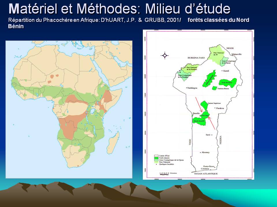 Au Bénin, les suidés sauvages Phacochoerus africanus (Gmelin 1788) et Potamochoerus porcus (Linnaeus, 1758) comptent parmi les gibiers les plus recherchés par les chasseurs et revêtent une importance économique évidente [1-6]. De ce fait, ils subissent de fortes pressions de chasse, de destruction et d’utilisation de leurs habitats par les hommes. Les travaux réalisés sur les ressources fauniques dans les forêts classées du Bénin ont révélé l’existence d’une faune diversifiée qui connaît une réduction drastique en terme d’effectifs [7-9]. Dans les forêts classées de Wari-Maro et des Monts Kouffé, le taux d’accroissement pour les ongulés est estimé à 21%, le taux de prélèvement des chasseurs autochtones à 12% et celui des braconniers à 36% [8]. D’autres études réalisées en Afrique ont également montré que le phacochère, bien qu’ayant une distribution relativement importante, est un animal qui est en régression constante, en raison de la chasse et du recul de ses habitats [10-19].