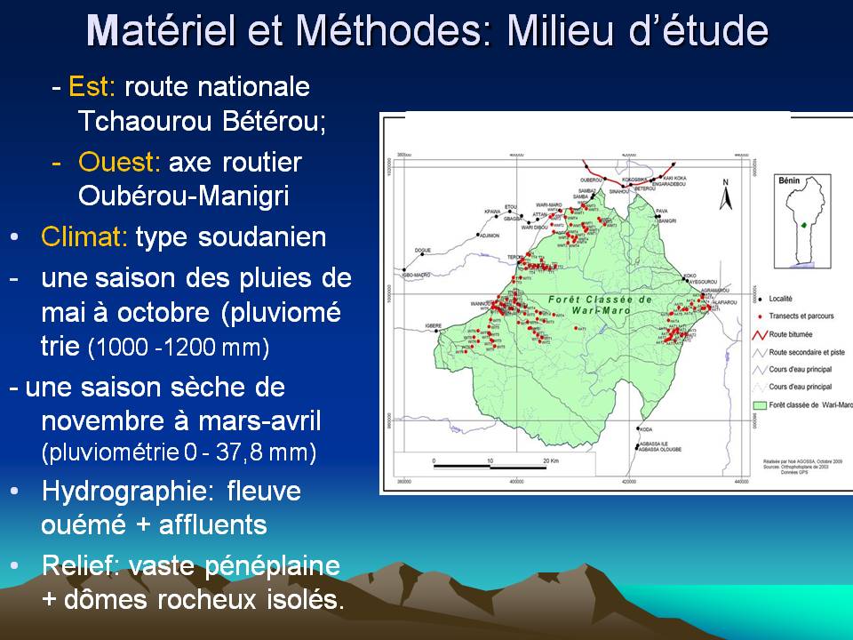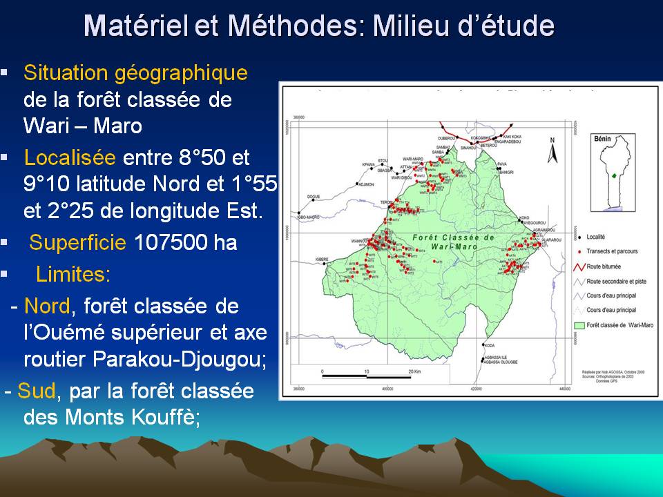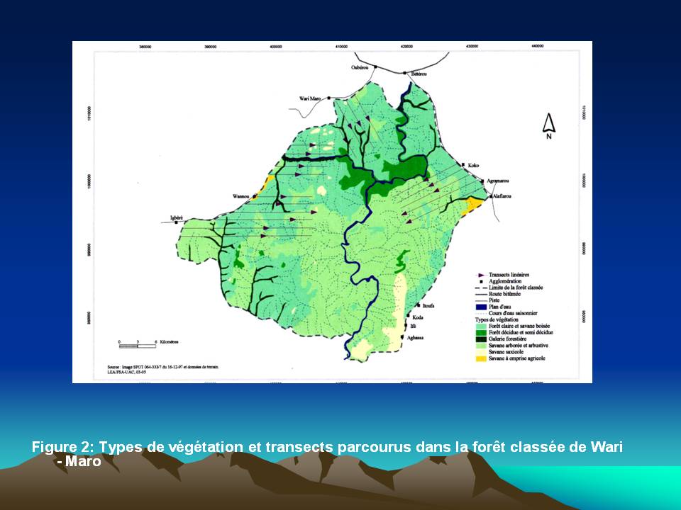 La forêt classée de Wari-Maro est située dans le centre du Bénin à cheval sur les communes de Tchaourou avec 45,5% de sa superficie et de Bassila avec 53,5%. Elle couvre une superficie de 107 500 ha. Géographiquement, elle se trouve entre 8°50 et 9°10 latitude Nord et 1°55 et 2°25 de longitude Est. Elle est limitée au nord par la forêt classée de l’Ouémé supérieur et l’axe routier Parakou-Djougou à l’Est par la route nationale Tchaourou-Bétérou, à l’Ouest par l’axe routier Oubérou-Manigri et au Sud, par la forêt classée des Monts Kouffè. Son climat est de type soudanien caractérisé par une saison des pluies qui s’étend de mai à octobre avec une hauteur moyenne annuelle de précipitations de 1100 mm et une saison sèche qui s’étend de novembre à mars. La végétation en grande partie naturelle est composée de forêts claires et savanes boisées, de savanes arborées et arbustives, de forêts denses sèches, de galeries forestières et de savanes herbeuses. La végétation artificielle est constituée par les plantations d’anacardiers installées par la Société Nationale des Forêts (SNAFOR) dans la zone d’Agramarou en 1965, des plantations de tecks ainsi que des cultures et des jachères d’âges variables [21-23].
