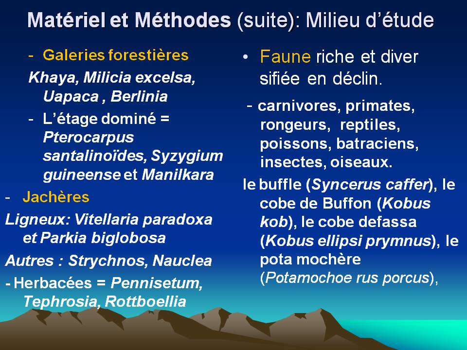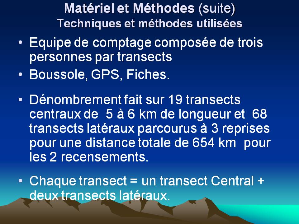 La méthodologie utilisée est celle des « transects », déjà testée avec succès dans les écosystèmes de savanes [31,16, 32-35]. Il s’agit d’un échantillonnage à pied le long d’un transect linéaire [36].
