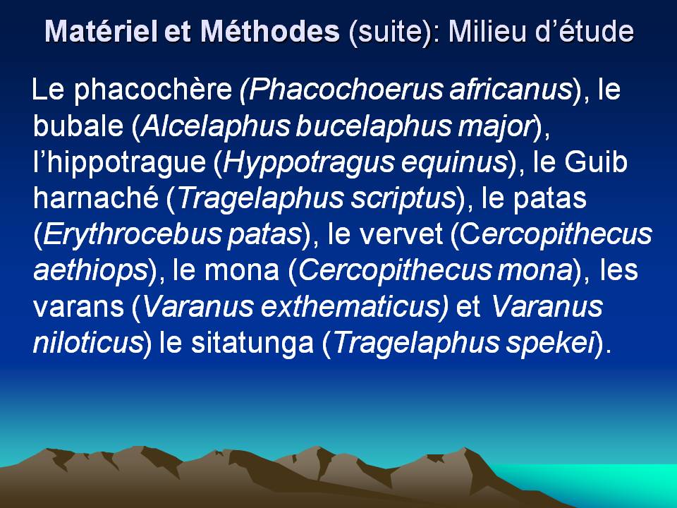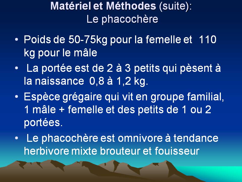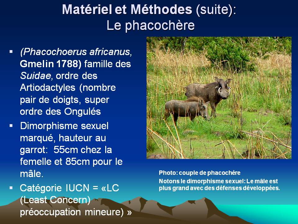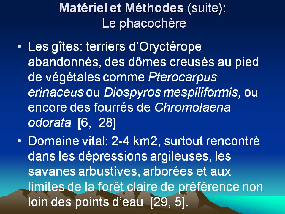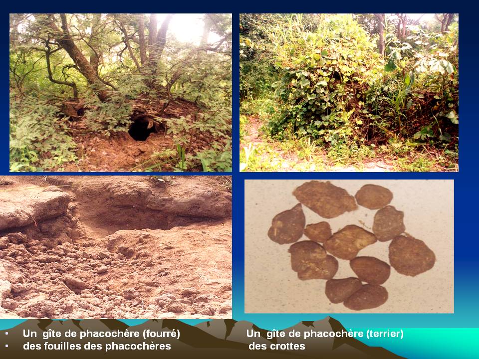 Le phacochère Phacochoerus africanus (Gmelin 1788) est une espèce de mammifère typiquement africain appartenant à l’ordre des Ongulés, au sous-ordre des Artiodactyles et à la famille des Suidés tout comme le sanglier, l’hylochère, le potamochère, le babiroussa et dont il se distingue par son énorme tête et les deux paires de verrues qu’il porte sur les joues entre les yeux et les défenses (Elles sont plus développées chez le mâle) [10-12]. Le pelage est gris foncé, la peau glabre porte une mince crinière sur le dos. Il présente un dimorphisme sexuel marqué, la hauteur au garrot est de 55 cm chez la femelle et 85 cm pour le mâle, et le poids de 50-75kg pour la femelle et de 110 kg pour le mâle. La portée est de 2 à 3 petits qui pèsent à la naissance 0,8 à 1,2 kg. C’est une espèce grégaire qui vit en groupe familial, 1 mâle + femelle et des petits de 1 ou 2 portées. Dans les pâtures plusieurs familles se retrouvent mais chacune avec son autonomie. Le phacochère est omnivore à tendance herbivore mixte : brouteur et fouisseur [28]. Les gîtes sont des terriers d’Oryctérope abandonnés, des dômes creusés au pied d’espèces végétale comme Pterocarpus erinaceus ou Diospyros mespiliformis, ou encore des fourrés de Chromolaena odorata parfois associés à des pieds d’Anogeissus leiocarpa [6, 29] ou des termitières dans lesquels il se repose aux heures chaudes ou se cache pour échapper à l’assaut des chasseurs. Son domaine vital est de 2-4 km2. Il est plus souvent rencontré dans les dépressions argileuses, les savanes arbustives, arborées et aux limites de la forêt claire de préférence non loin des points d’eau [30, 5].