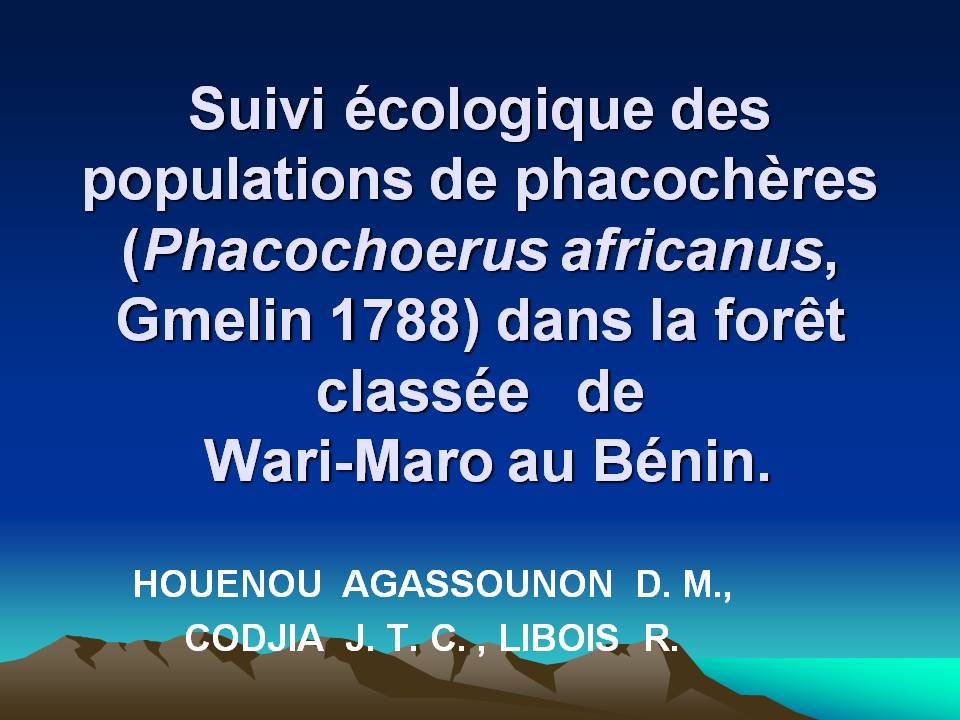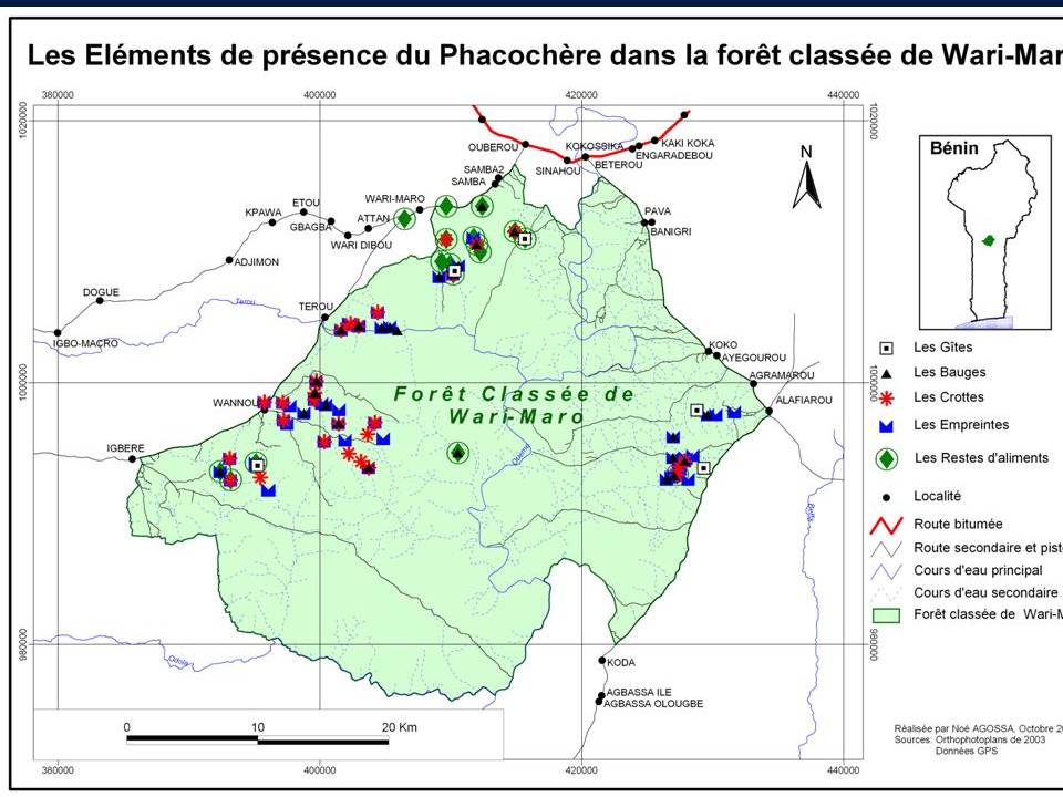 [6] Houénou Agassounon, D. M. 2005. Ecologie alimentaire du phacochère (Phacochoerus africanus, Gmelin, 1788) dans la forêt classée de Wari-Maro au Bénin. Mémoire de DEA en Aménagement et Gestion des Ressources Naturelles, Université d’Abomey-Calavi. 76p.