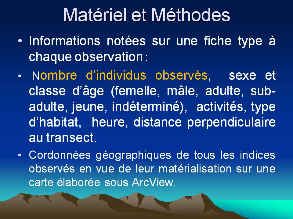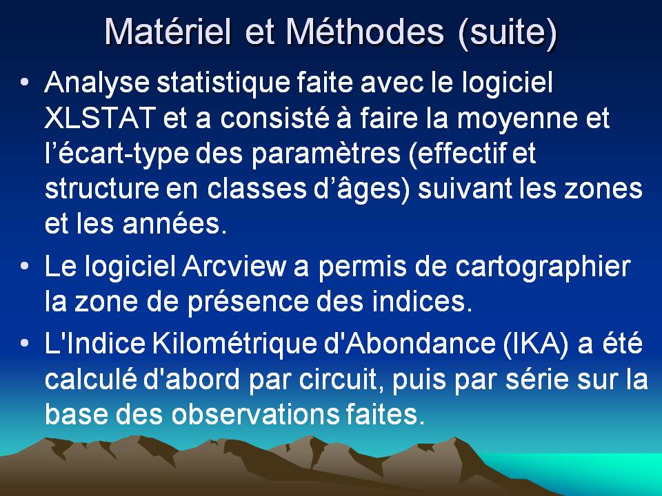 La saisie et l’encodage des données collectées ont été réalisés à l’aide du tableur Excel. L’analyse statistique a été faite avec le logiciel XLSTAT et a consisté à faire la moyenne et l’écart-type des paramètres (effectif et structure en classes d’âges) suivant les zones et les années. Le logiciel Arcview a permis de cartographier la zone de présence des indices.