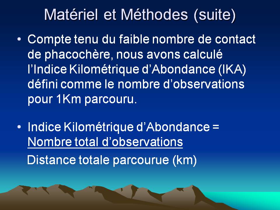 Ces résultats ont une limite liée au faible taux de contacts et ne permettent pas de fournir une estimation de densité via le logiciel Distance conformément aux recommandations de De Thoisy [35]. Néanmoins nous avons calculé l’abondance relative des phacochères exprimée en Indice Kilométrique d’Abondance (IKA) qui se traduit par le rapport du nombre total d’individus observés à la distance totale parcourue en kilomètre.