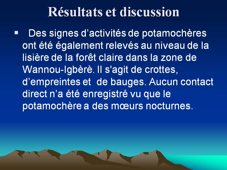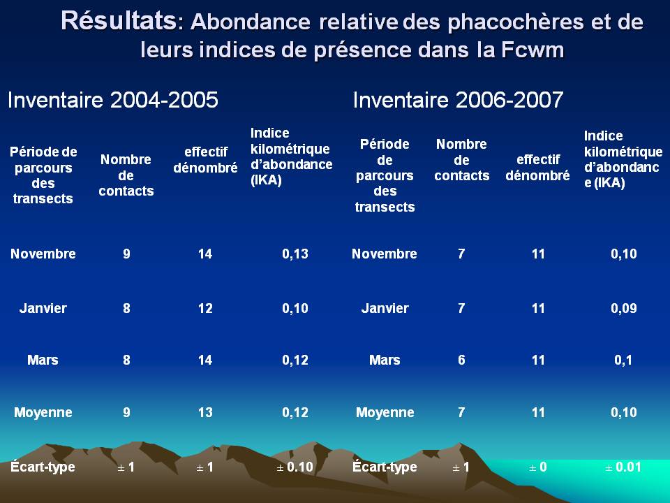Dix-neuf transects d’une longueur totale de 654 km ont été parcourus à trois reprises, de novembre 2004 à mars 2005, et de novembre 2006 à mars 2007. L’abondance relative des phacochères exprimée en Indice Kilométrique d’abondance (IKA) est faible, de l’ordre de 0,22 ± 0,04 avec un coefficient de variation (CV) de 10.84 pour les plus grands à 0,07 ± 0,01 avec un CV de 10.23. La tendance observée au niveau de la densité, qu’elle soit relative au nombre d’individus par km2 ou au nombre de groupe par km2, est la même que celle de l’IKA dans la forêt classée de Wari-Maro. Dans d’autres forêts classées du Bénin (Dogo-Kétou, Trois rivières, Ouémé Supérieur, etc...) où les investigations ont également été menées la présence des phacochères n’est rapportée que par quelques individus encore bien menacés. De nos jours, les phacochères ne se retrouvent en effectif important que dans les parcs nationaux.