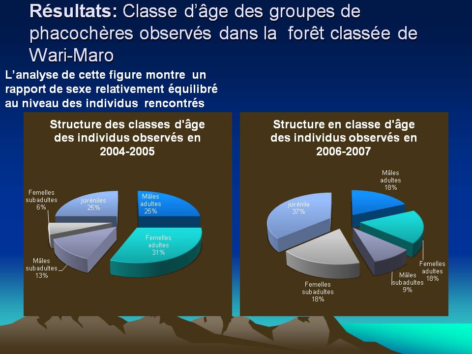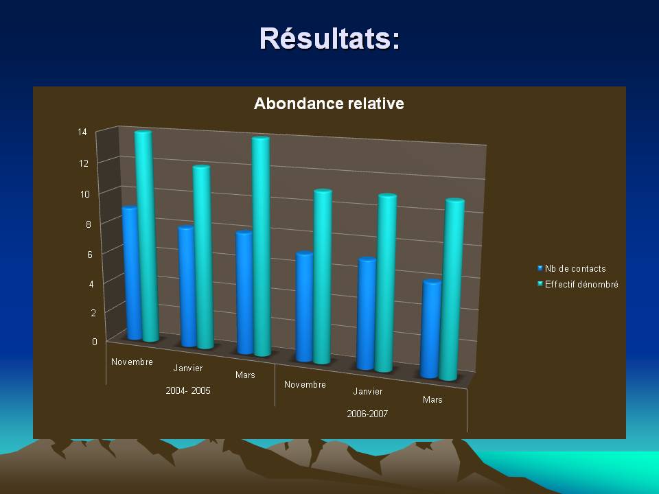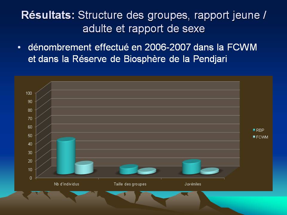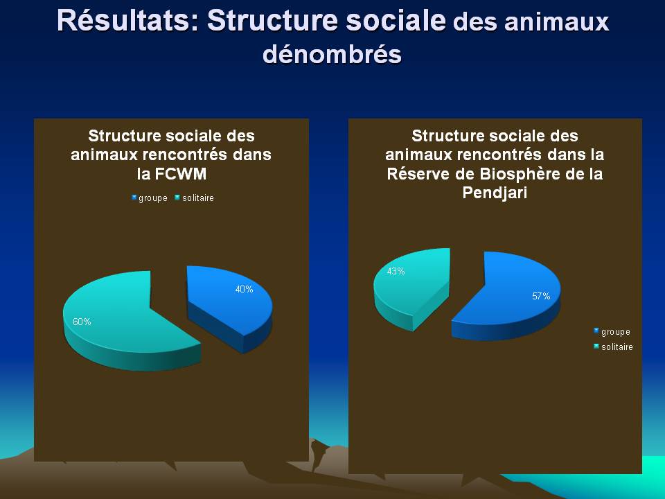 Il ressort de l’analyse des deux inventaires effectués que 9 contacts ont été enregistrés pour 14 individus observés au cours du dénombrement de 2004- 2005 et 7 contacts pour 11 individus observés au recensement de 2006- 2007. L’analyse suggère un faible nombre de contacts avec des individus solitaires dans 60% des cas, mais un rapport de sexe relativement équilibré au niveau des individus rencontrés.