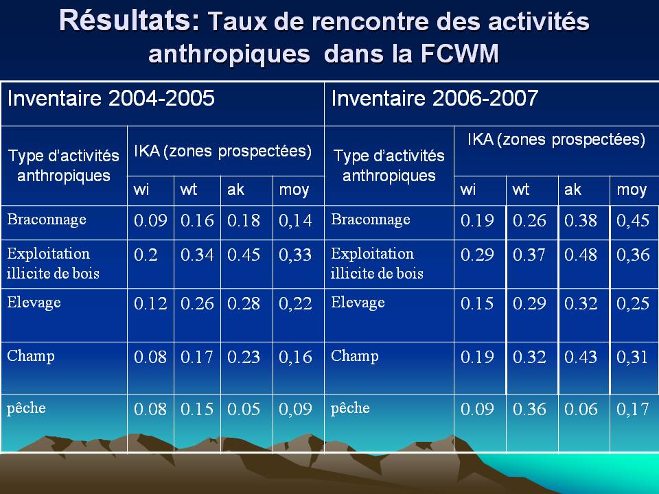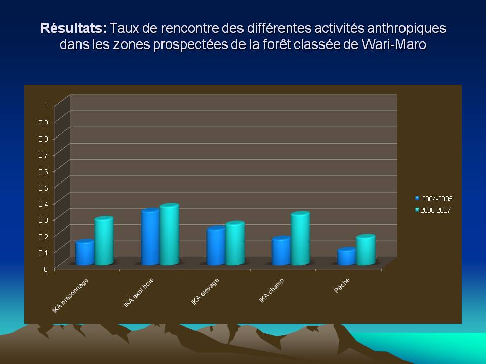 Les IKA des activités anthropiques à l’intérieur de la forêt ont été calculés et l’analyse montre une augmentation d’une année à l’autre. L’IKA du braconnage, fléau important qui menace sérieusement la faune sans distinction d’espèce a pratiquement doublé. La tendance évolutive est la même pour l’exploitation illicite de bois, la transhumance, la pêche illicite et l’extension des champs dans les trois zones prospectées. Elle est inversement proportionnelle à celle des populations de phacochères.