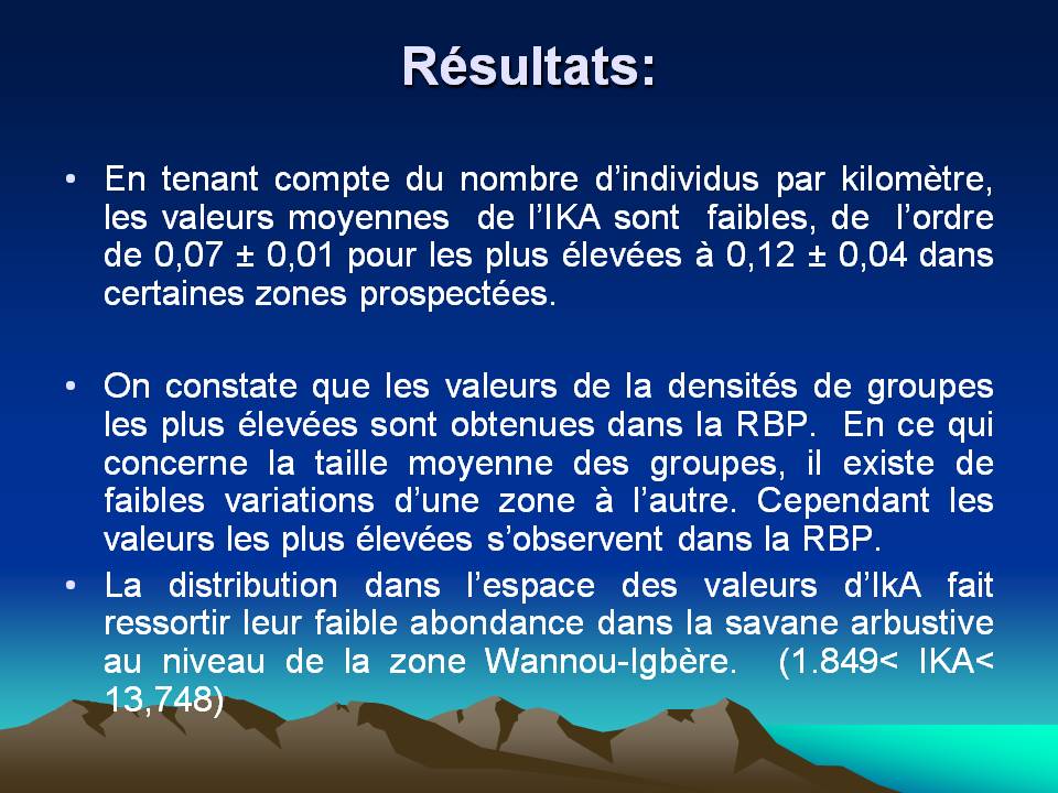 Les effectifs les plus élevés sont obtenus dans la zone de Wannou Igbèrè avec un IKA moyen de 0.2 au premier inventaire et de 0.14 au deuxième. Les plus faibles sont enregistrés dans la zone Agramarou Koko où l’IKA moyen était de 0.06 individus/km en 2004-2005 et de 0.05 en 2006-2007. L’IKA moyen pour l’ensemble des trois zones prospectées était faible, de 0.12 en 2004-2005 et 0.10 en 2006-2007. Alors que dans la Réserve de Biosphère de la Pendjari, les populations de phacochères sont plus importantes avec un IKA moyen de 0.6 individus/km.