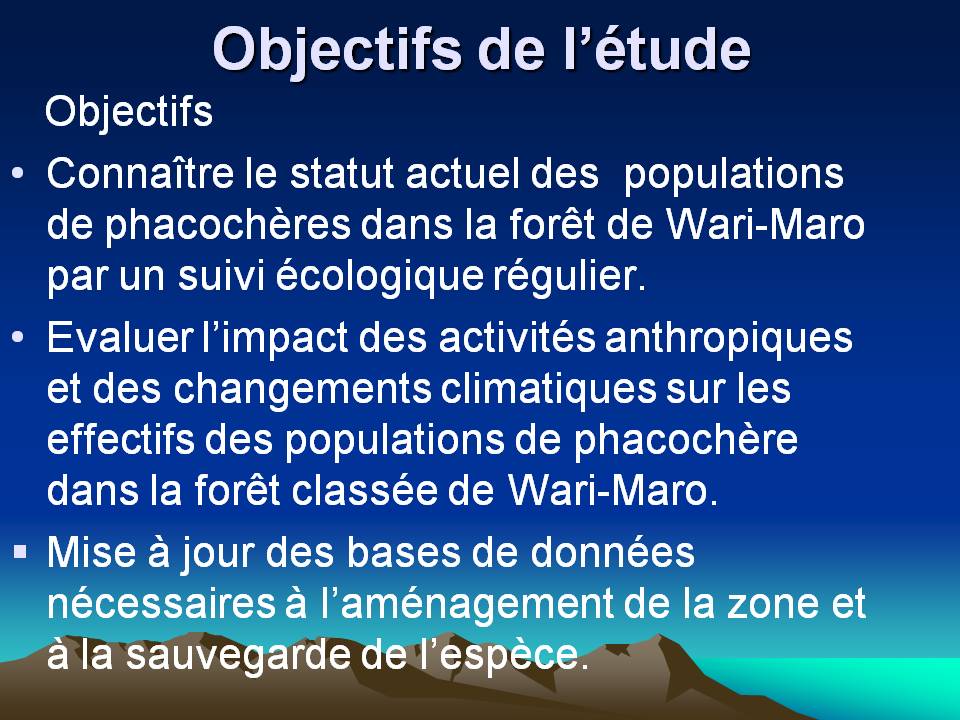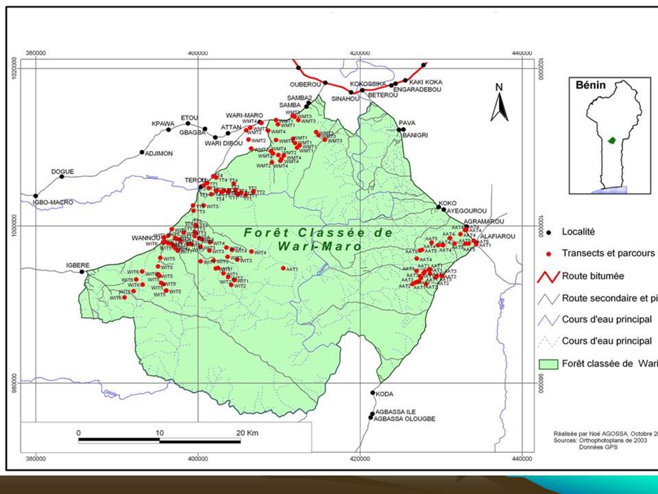 La méthodologie utilisée est celle des « transects linéaires » et des bandes rabattues, à travers la forêt classée de Wari-Maro, afin de récolter toutes les observations directes (contacts visuels avec l’animal), indirectes (crottes, gîtes, empreintes, restes d’aliments, fouilles de phacochères), les coordonnées de tous les indices de présence, ainsi que les distances prises à l’aide du GPS.