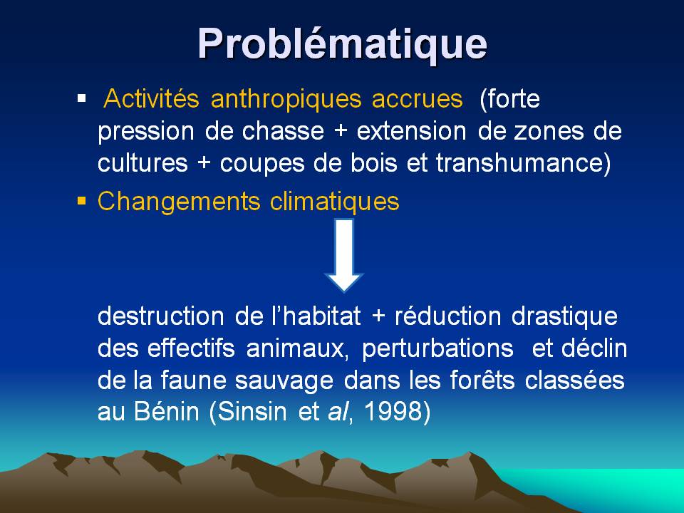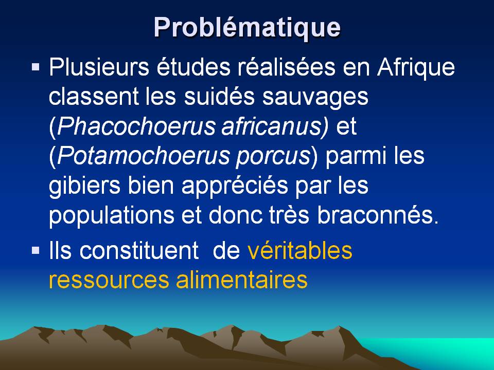 Au Bénin, les suidés sauvages Phacochoerus africanus, (Gmelin 1788) et Potamochoerus porcus (Linnaeus, 1758) comptent parmi les gibiers les plus recherchés par les chasseurs, et la viande de brousse vendue sur la plupart des marchés est souvent préférée à celle des animaux domestiques. De ce fait, ils subissent de fortes pressions de chasse mais aussi de destruction et d’utilisation de leurs habitats par les hommes. Dans leur milieu naturel, ils sont les proies des grands carnivores dont l’évolution croissante des effectifs liée aux efforts de conservation dans les aires protégées augmente la compétition au niveau de l’accès aux points d’eau. Cette situation doublée des modifications du régime pluviométrique imputable à l’effet des changements climatiques réduit la disponibilité des mares qui constituent un élément essentiel dans le choix des habitats par les suidés. Par ailleurs, les pressions des troupeaux transhumants qui occasionnent le comblement des points d’eau sont également une menace non négligeable pour ces animaux.