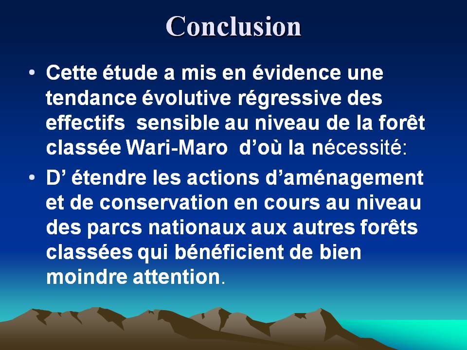 Au vu des résultats obtenus, il est impérieux que les actions d’aménagement et de conservation en cours au niveau des parcs nationaux soient maintenues et étendues aux autres forêts classées qui bénéficient d’une bien moindre attention.